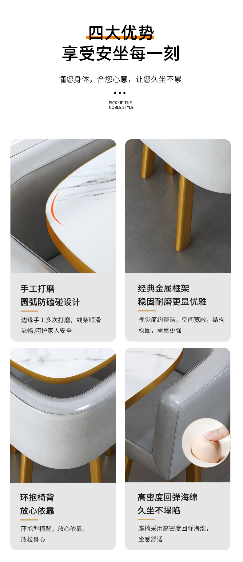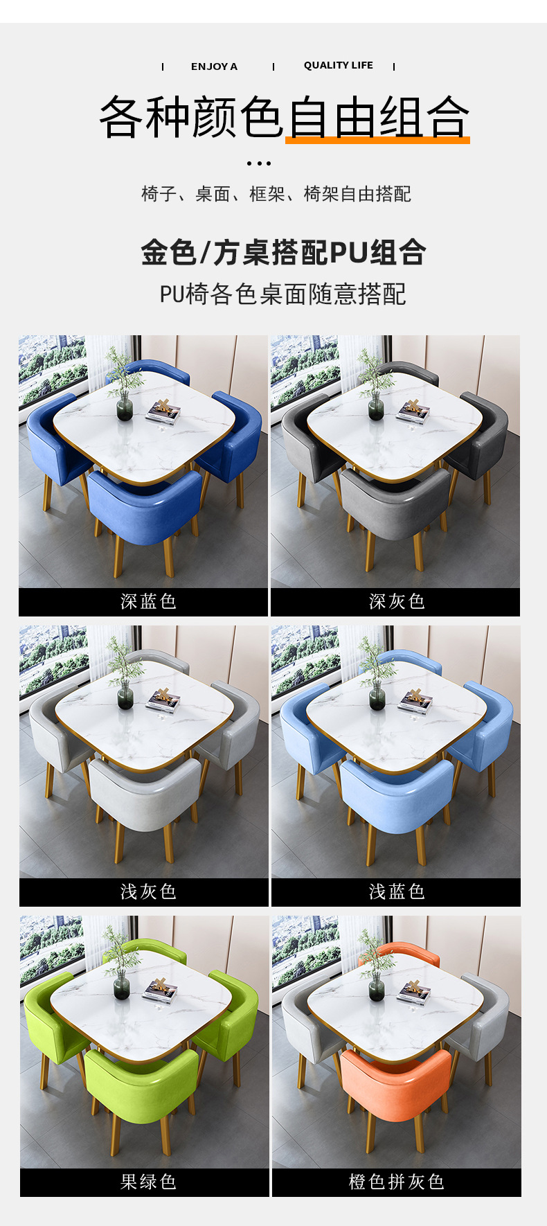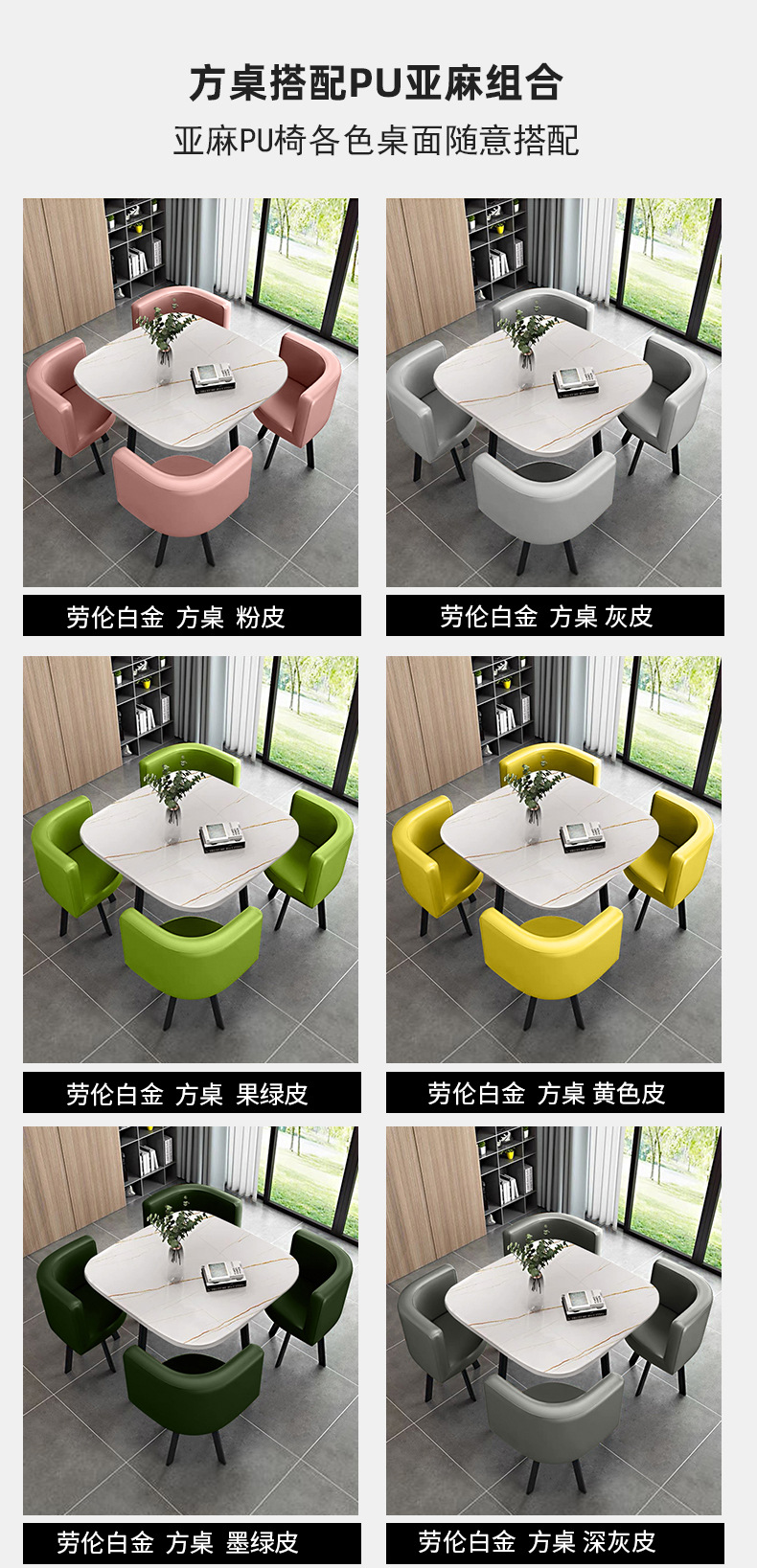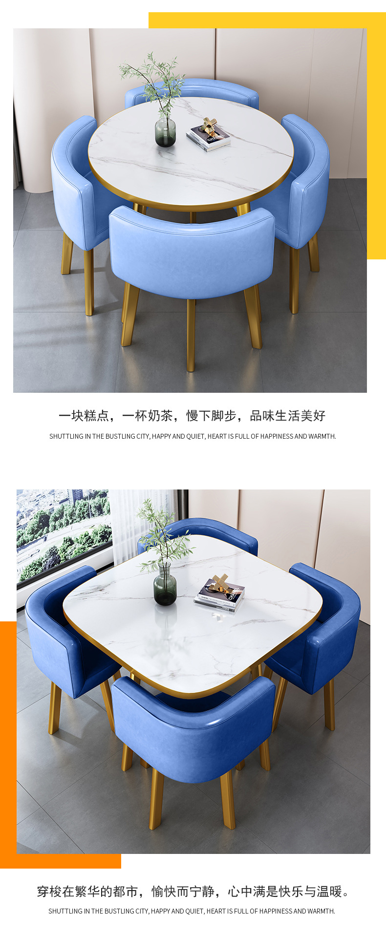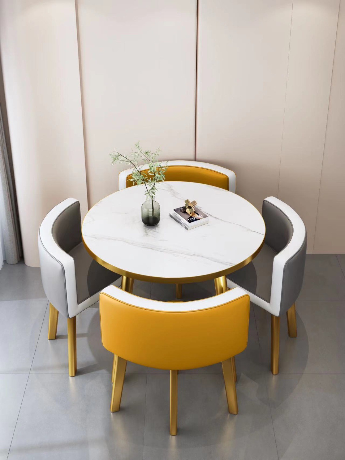 • 그레이 + 옐로우 컬러 매칭 가죽 의자 80CM 모조 스톤 테이블 + 의자 4개