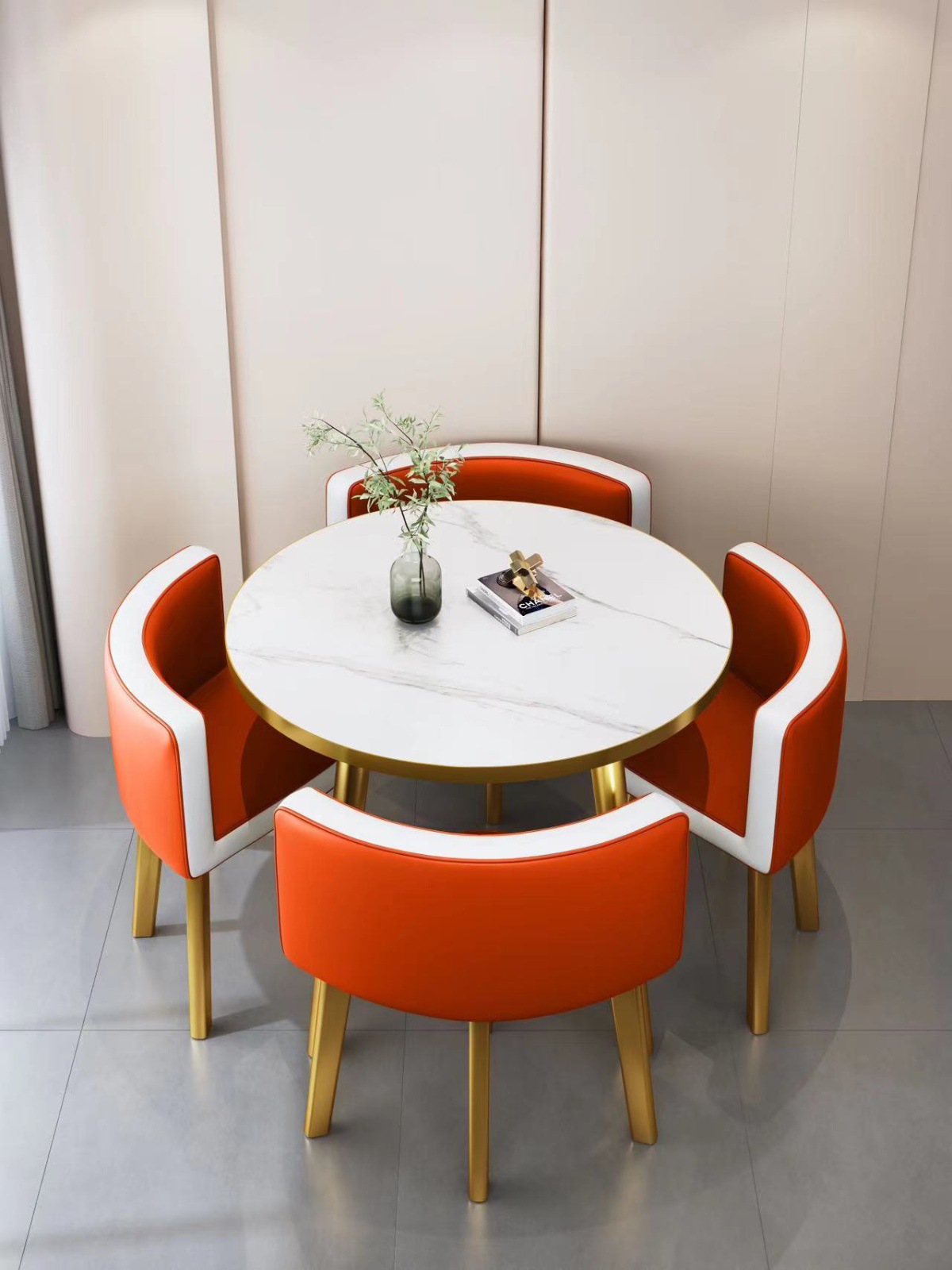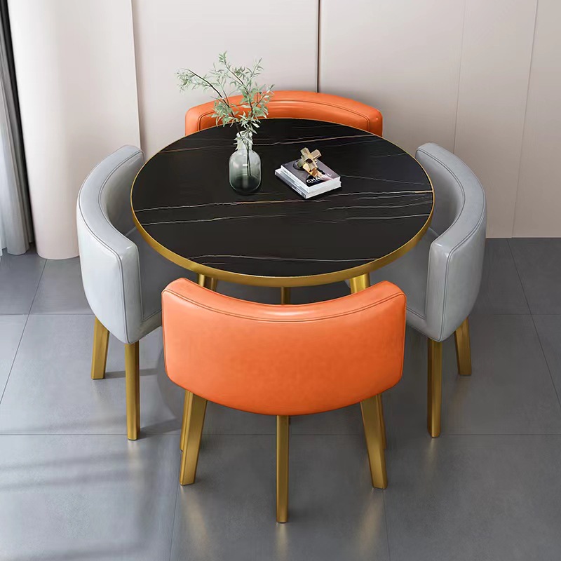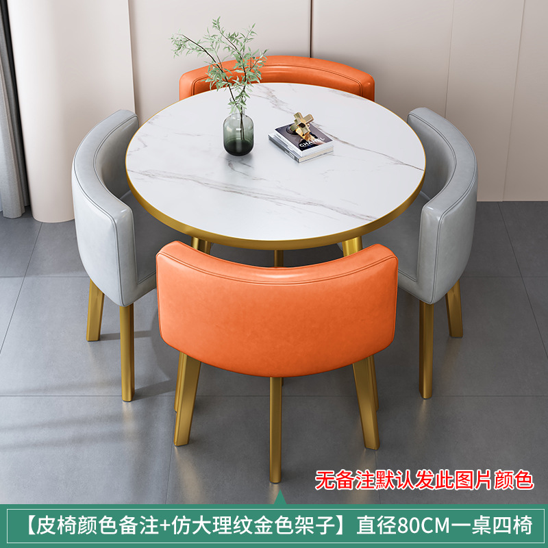 • 오렌지 가죽 80CM 모조 대리석 골드 테두리 테이블과 의자 4개