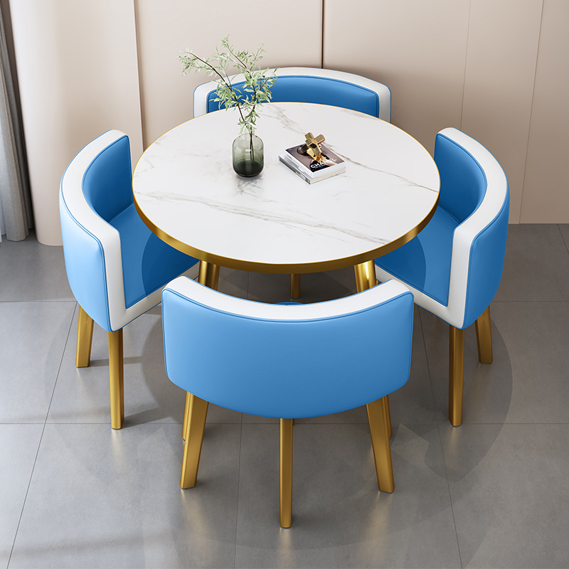 • 라이트 블루 가죽 의자 80CM 모조 대리석 골드 림 테이블과 의자 4개
