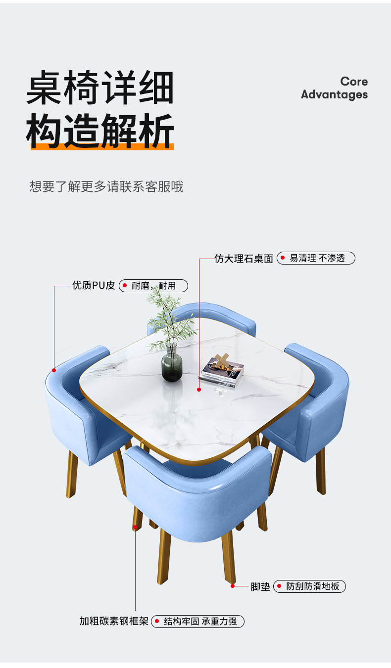 • 블루 컬러 블록 가죽 의자 80CM 모조 돌 테이블 + 의자 4개