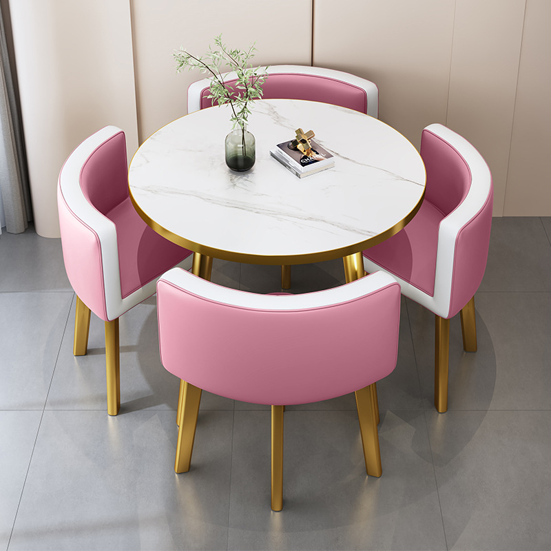 • 핑크 가죽 80CM 모조 대리석 골드 테두리 테이블과 의자 4개