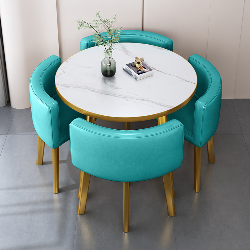 • 레이크 블루 가죽 의자 80CM 모조 대리석 골드 림 테이블과 의자 4개