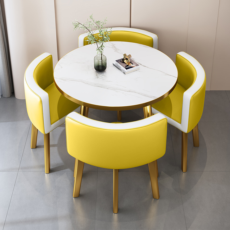 • 노란색 가죽 80CM 모조 대리석 골드 테두리 테이블과 의자 4개