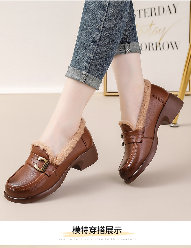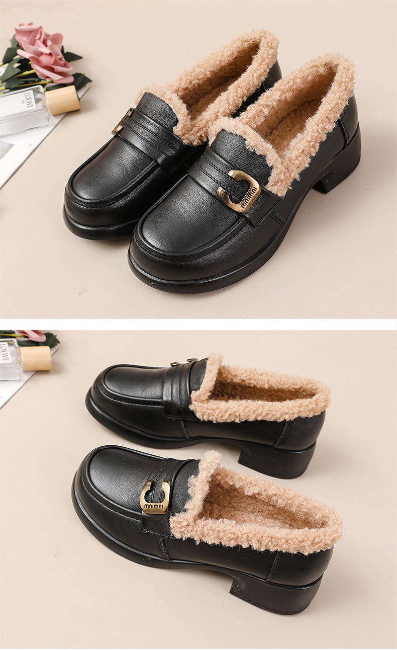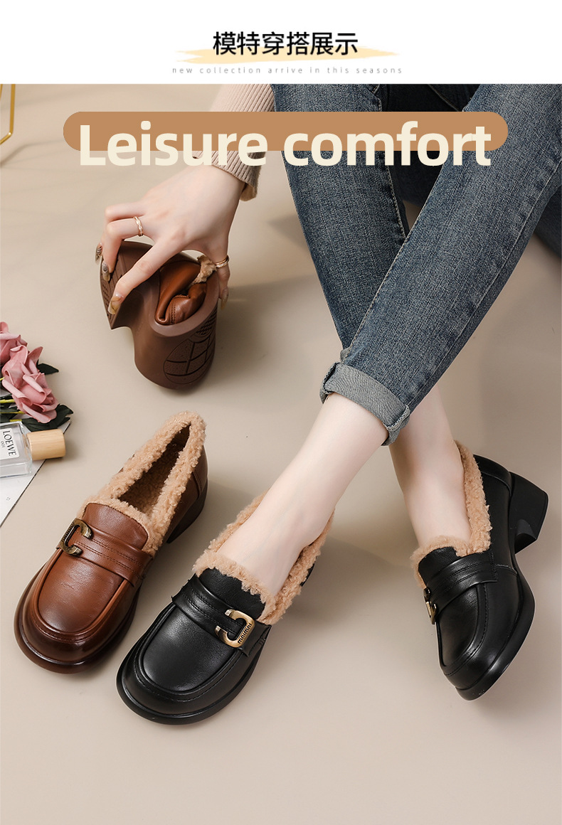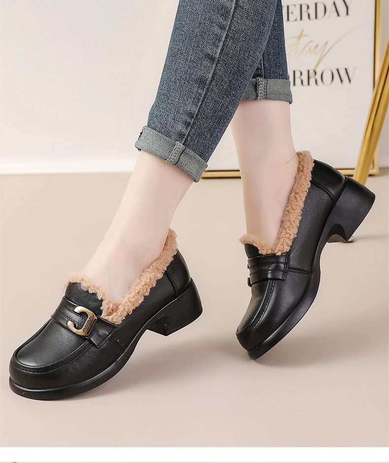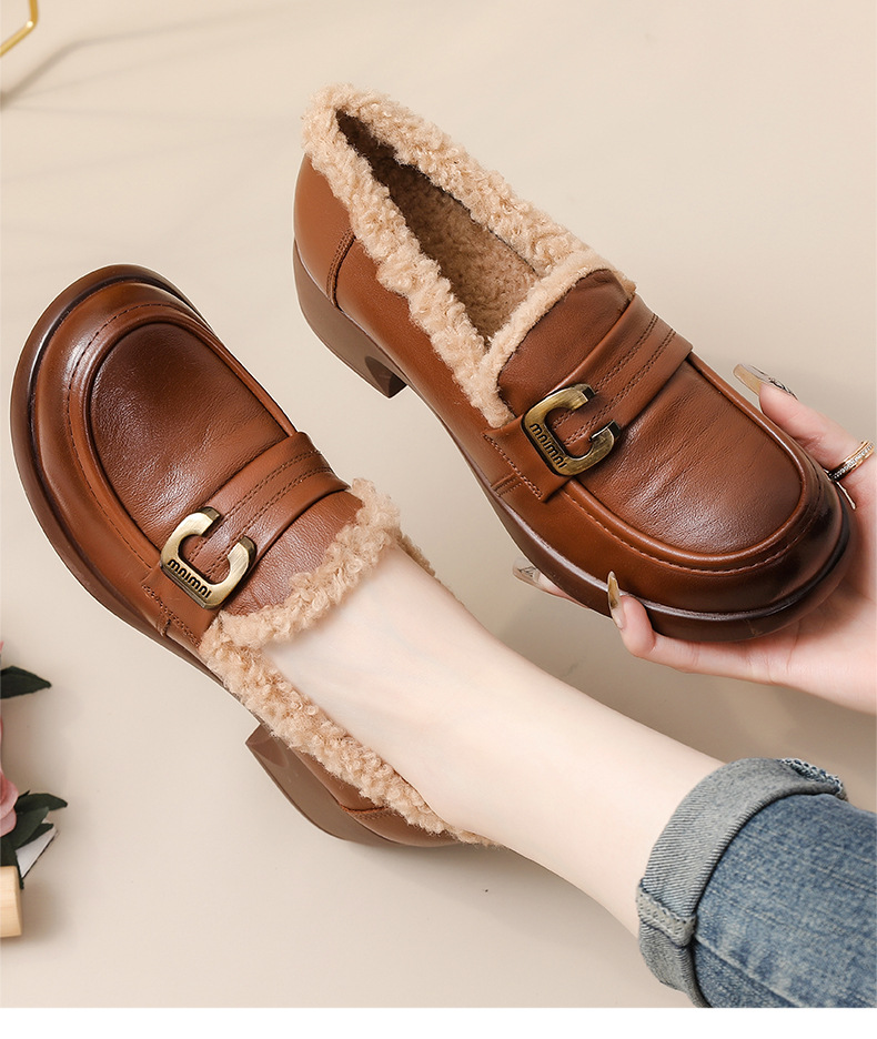 1층 소가죽 모피 신발, 미드힐 로퍼, 가죽 신발, 천연 가죽 두꺼운 굽 단화, 여성용 하이힐, 두꺼운 밑창, 겨울용 플러스 벨벳스토어 가기