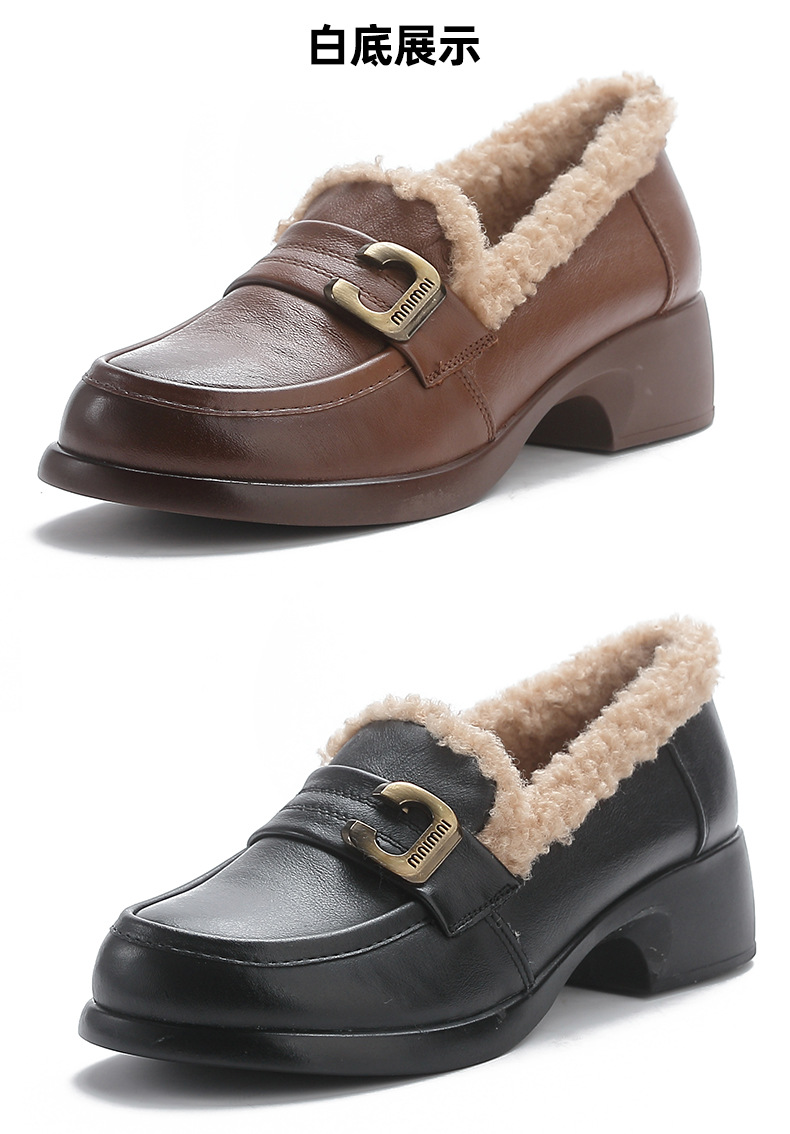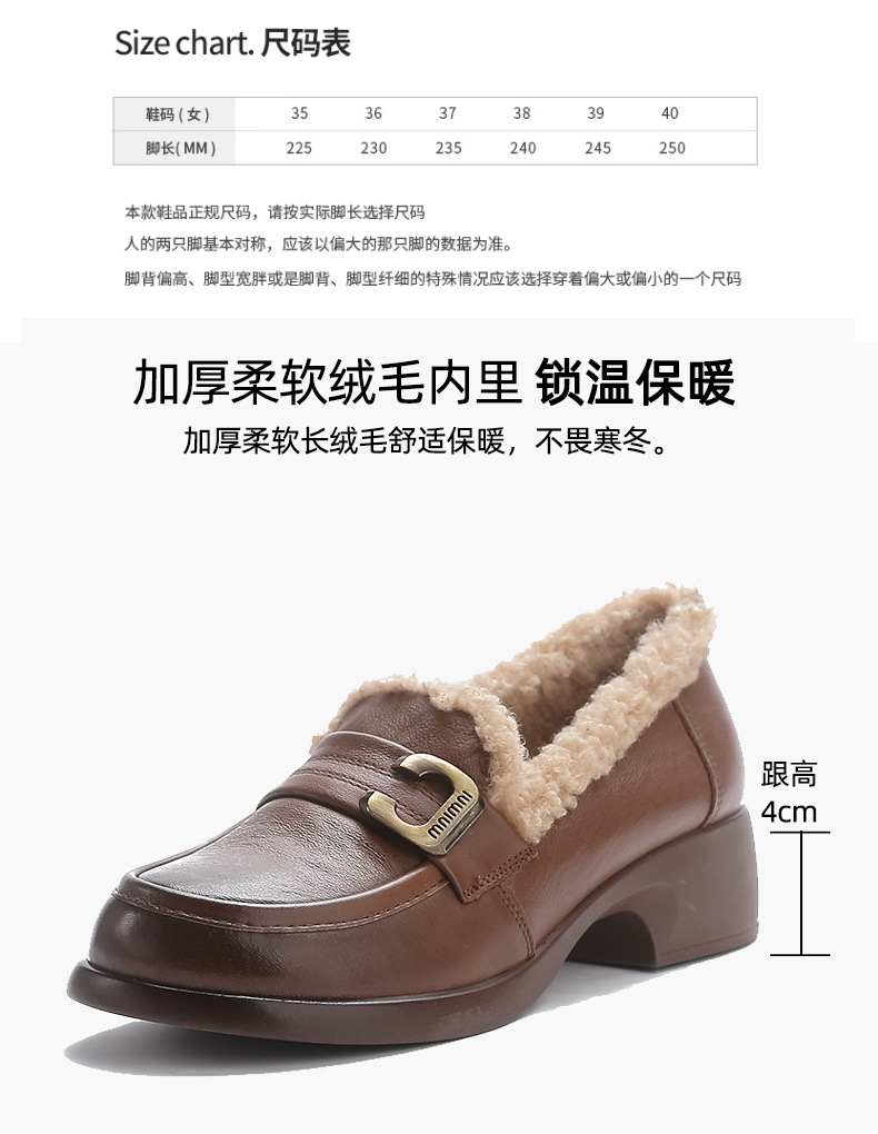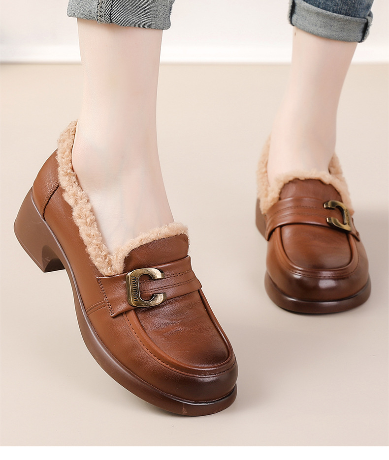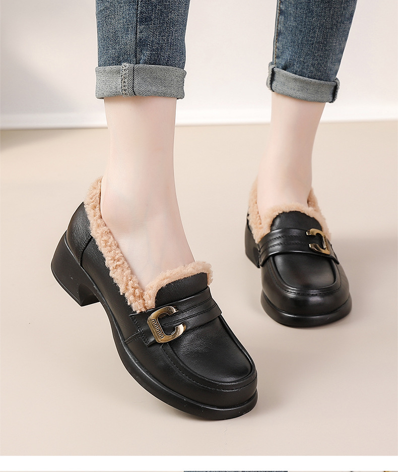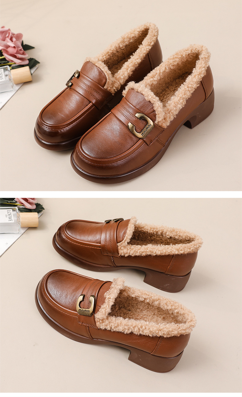 1층 소가죽 모피 신발, 미드힐 로퍼, 가죽 신발, 천연 가죽 두꺼운 굽 단화, 여성용 하이힐, 두꺼운 밑창, 겨울용 플러스 벨벳스토어 가기