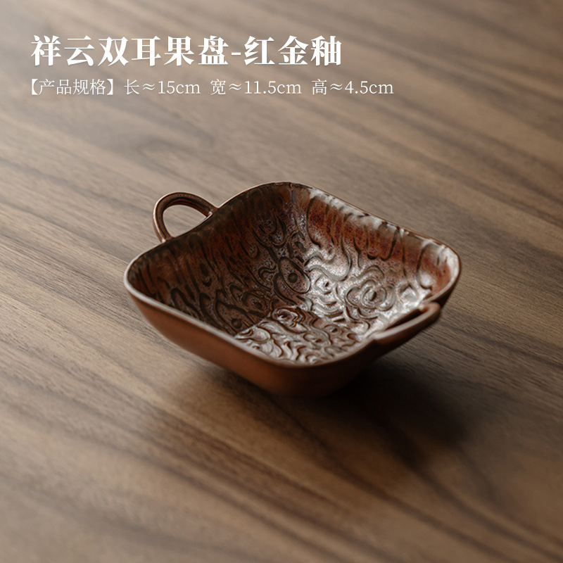 • Xiangyun 이중 귀 과일 접시 - 레드 골드 유약
