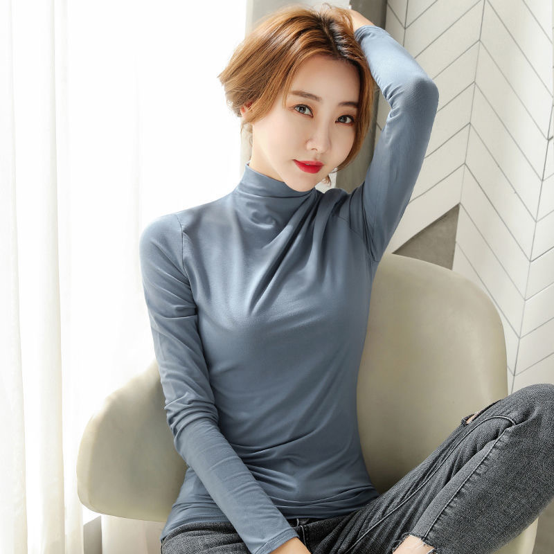 순 레드 모달 하이 칼라 [96% 비스코스 섬유, 4% 스판덱스] 긴 소매 티셔츠 여성용 가을 새로운 조커 코트