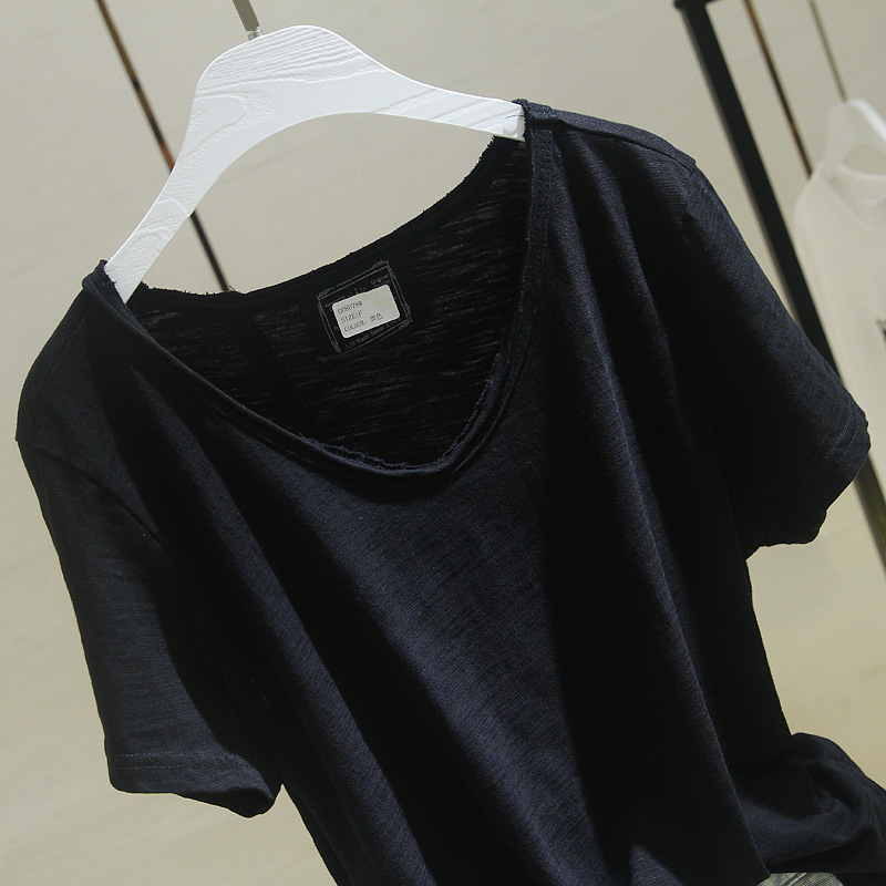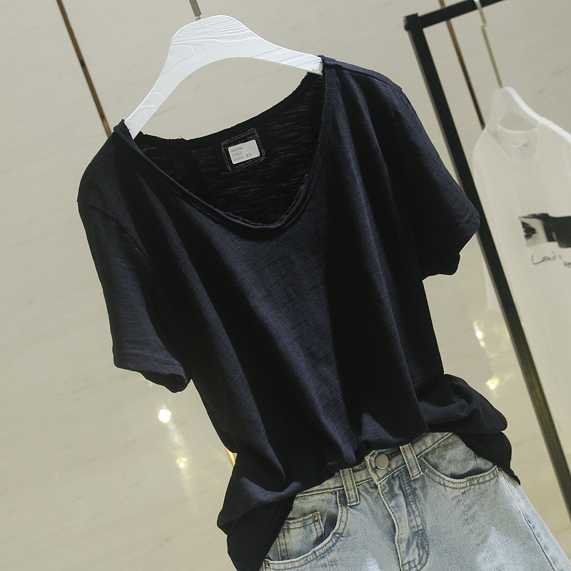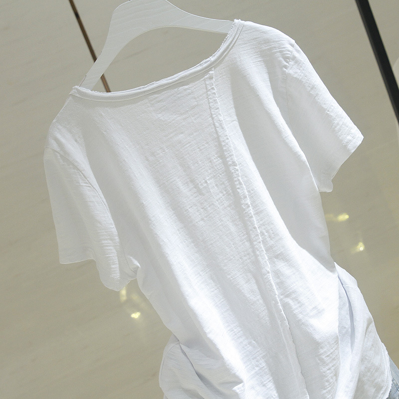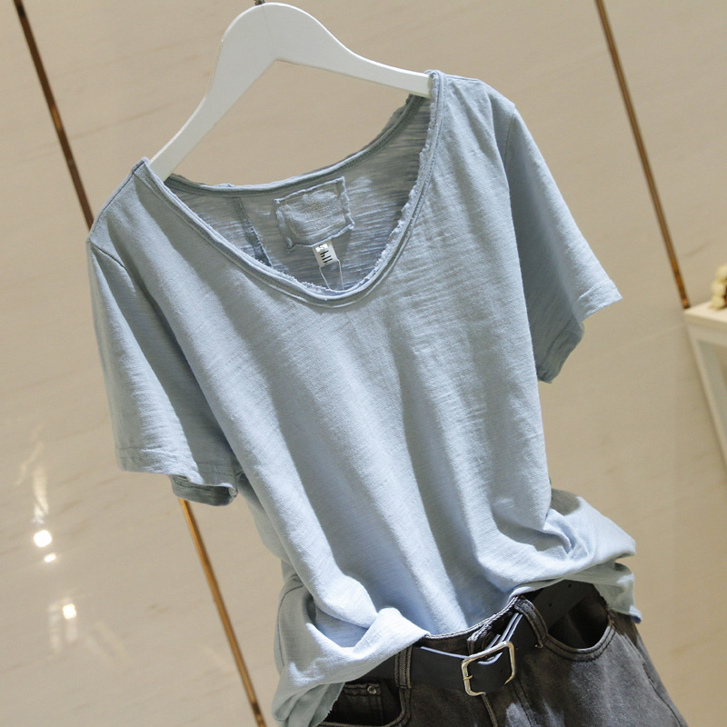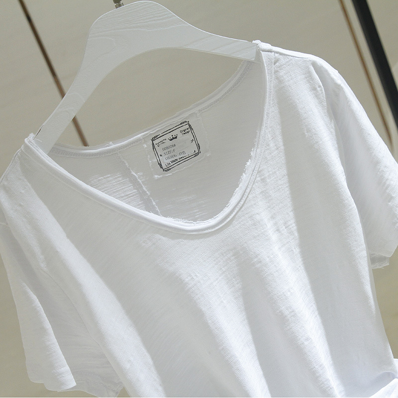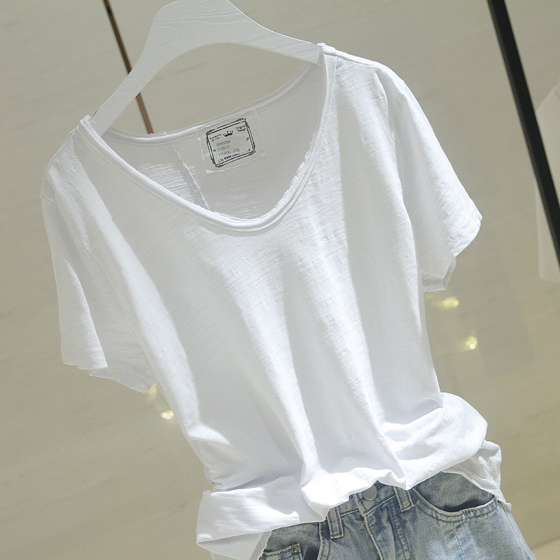2023 년 여름 새 한국식 퓨어 화이트 반팔 티셔츠 여성용 모직 V 넥 슬럽 코튼 루즈 슬리밍 반소매 탑