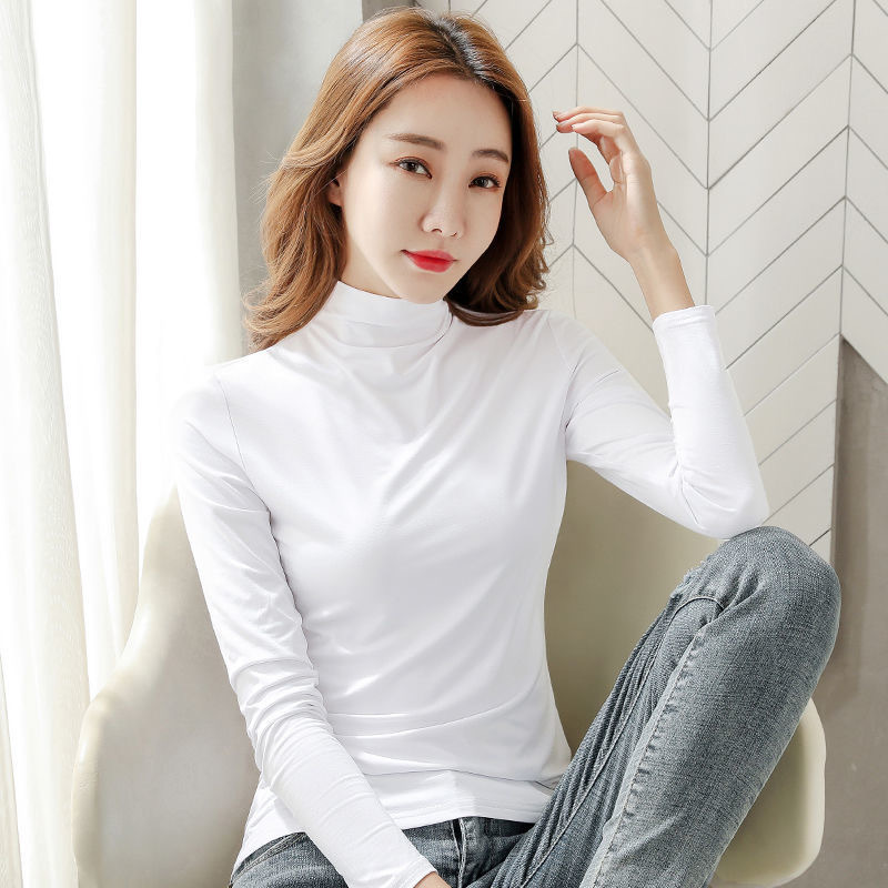 순 레드 모달 하이 칼라 [96% 비스코스 섬유, 4% 스판덱스] 긴 소매 티셔츠 여성용 가을 새로운 조커 코트