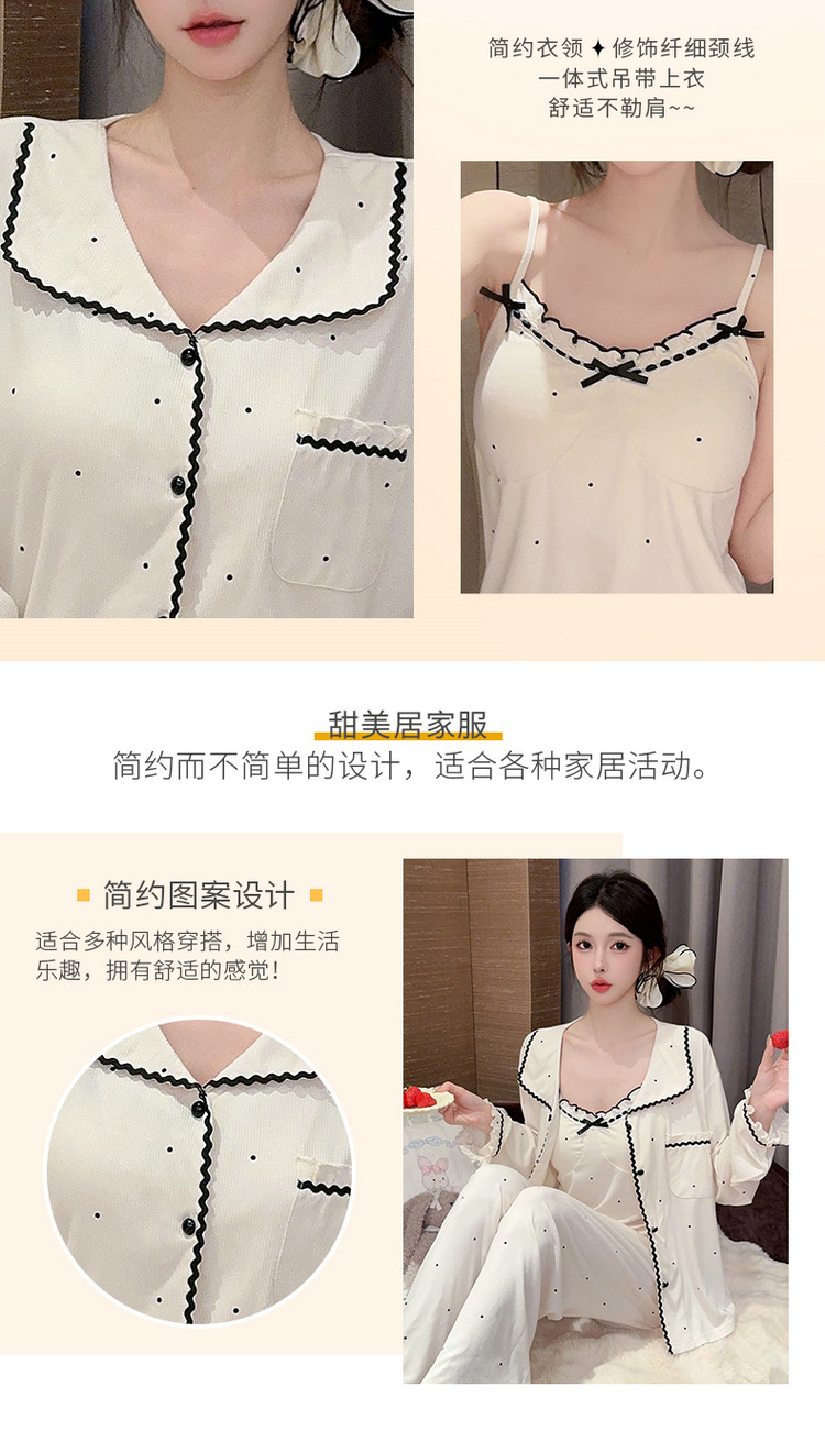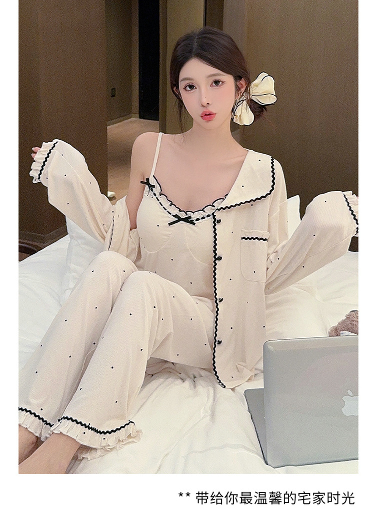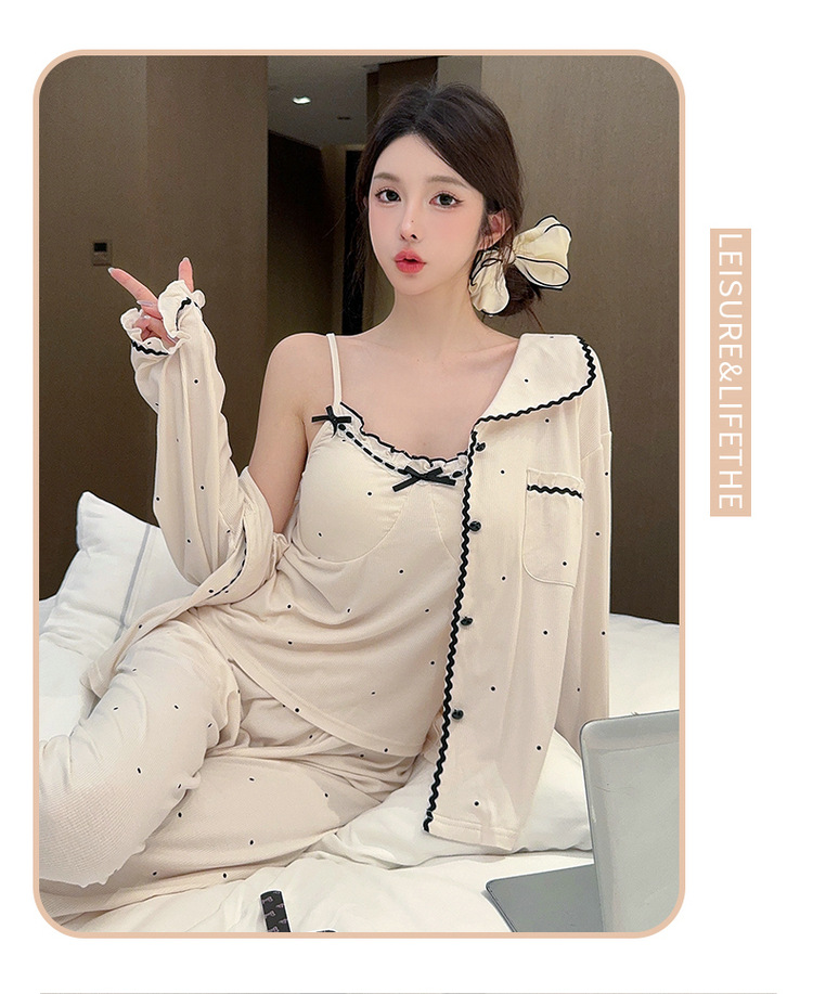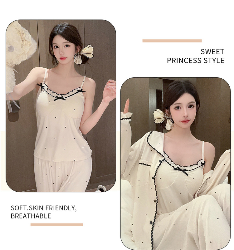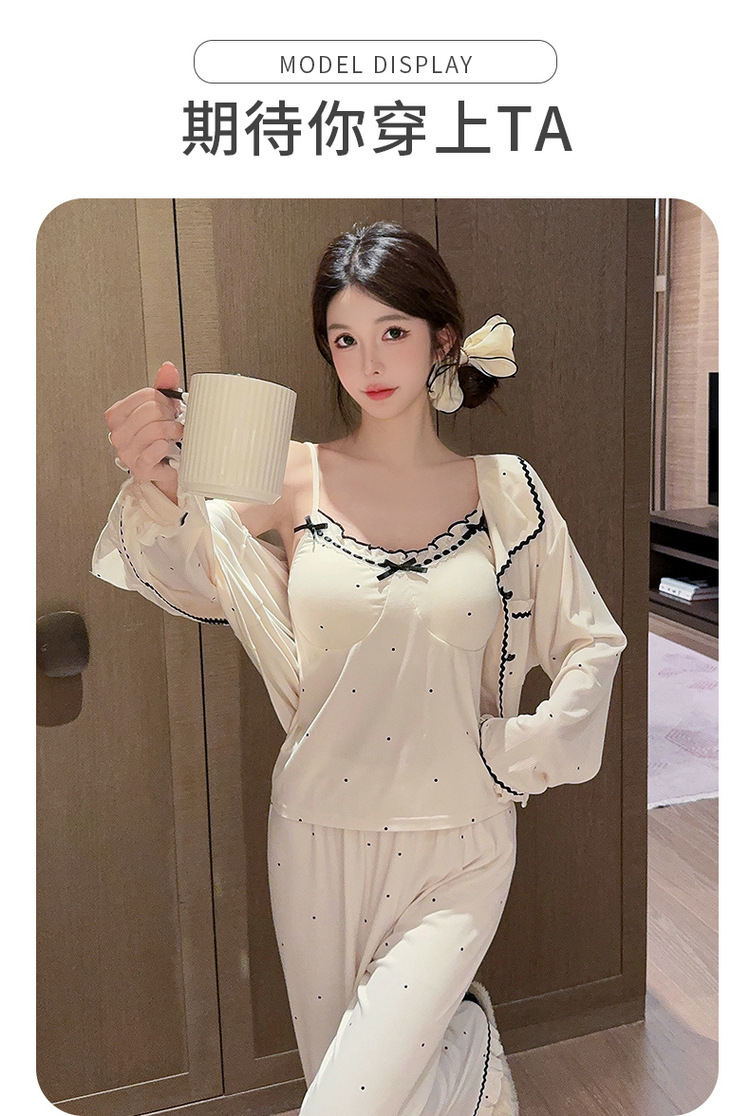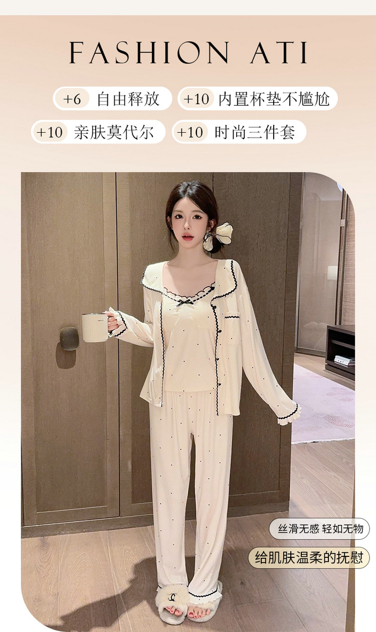 봄, 가을 폴카 도트 프린트 모달 긴팔 잠옷, 고급스럽고 가벼운 럭셔리 홈웨어, 피부 친화적이고 드레이프한 여성용 3피스 세트스토어 가기