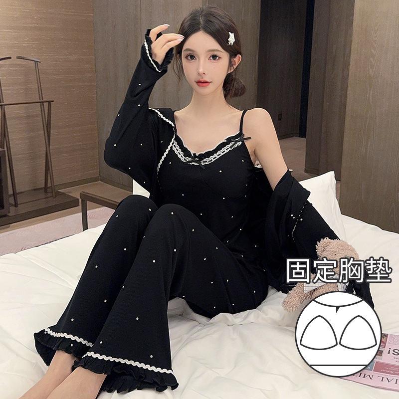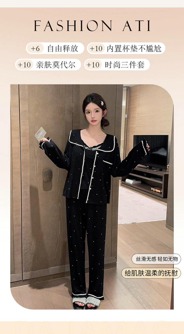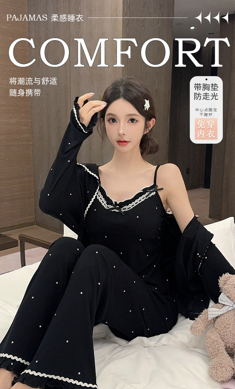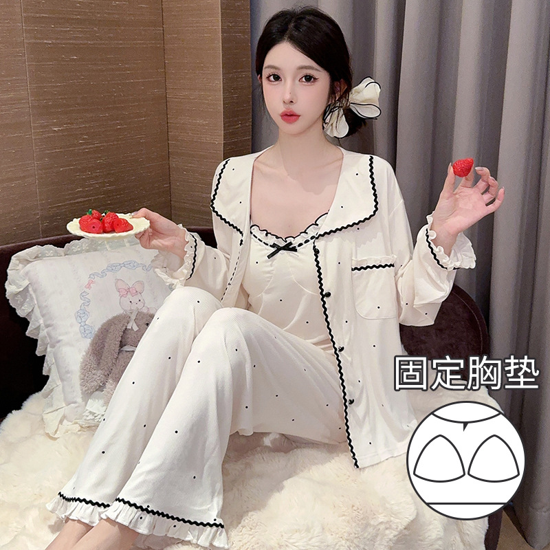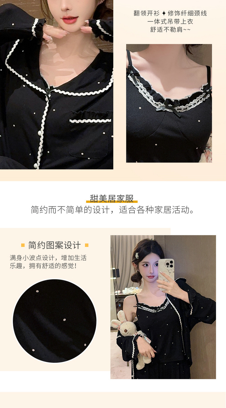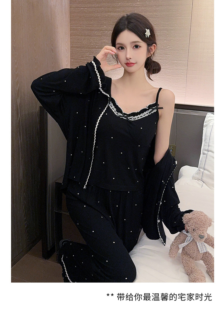 봄, 가을 폴카 도트 프린트 모달 긴팔 잠옷, 고급스럽고 가벼운 럭셔리 홈웨어, 피부 친화적이고 드레이프한 여성용 3피스 세트스토어 가기