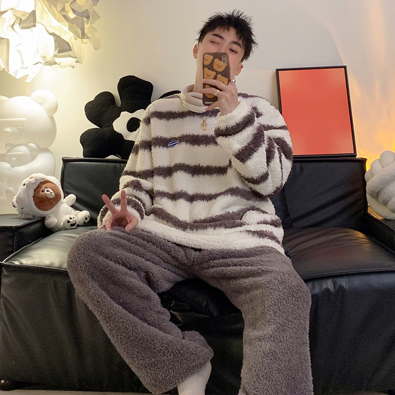 줄무늬 봉제 커플 잠옷 기모 두꺼운 가을과 겨울 산호 양털 남녀 인터넷 플란넬 홈 옷