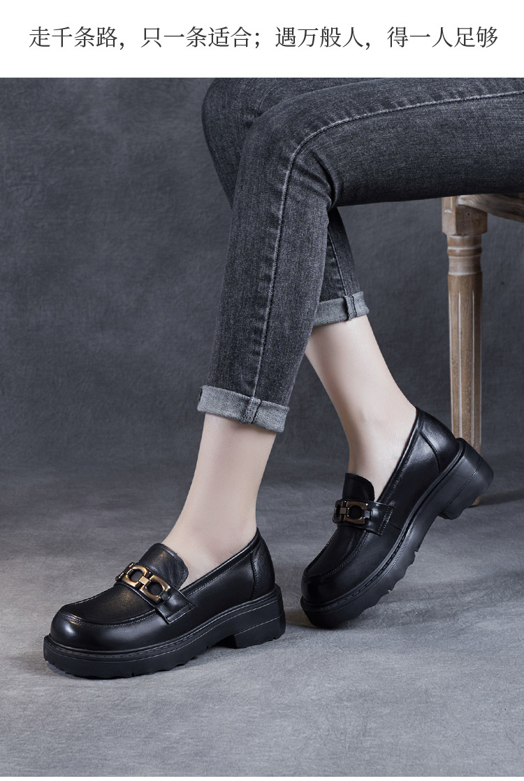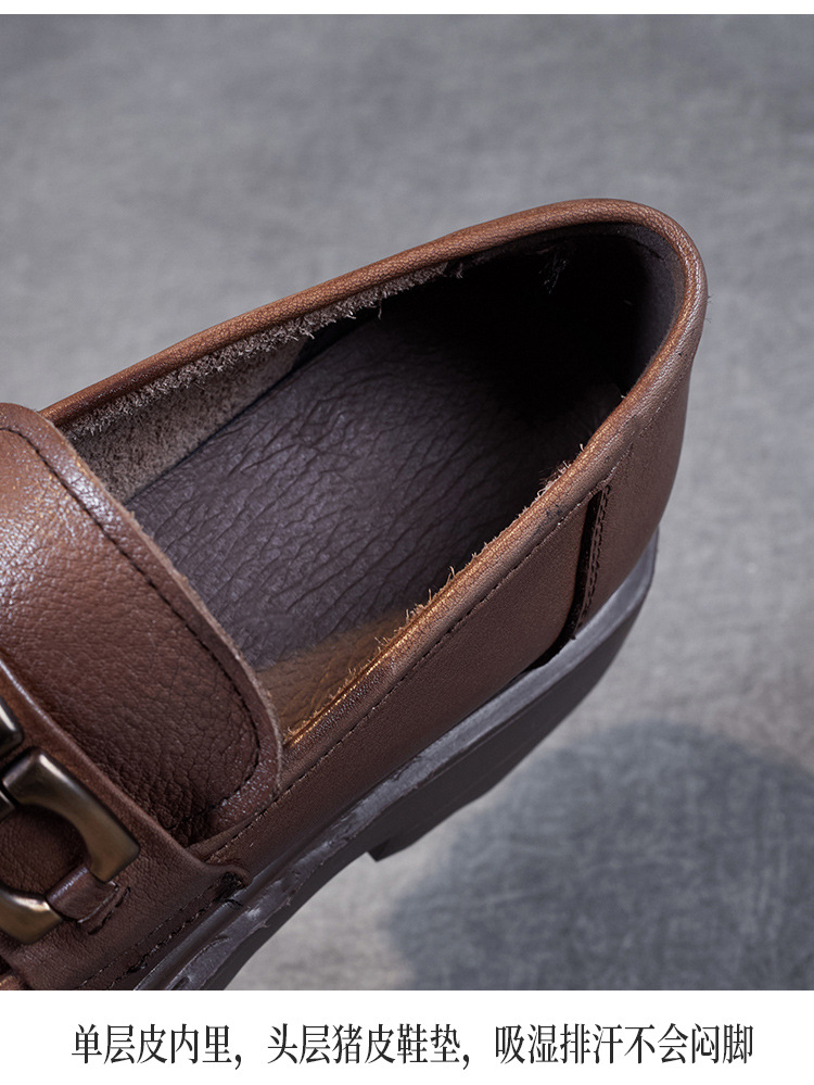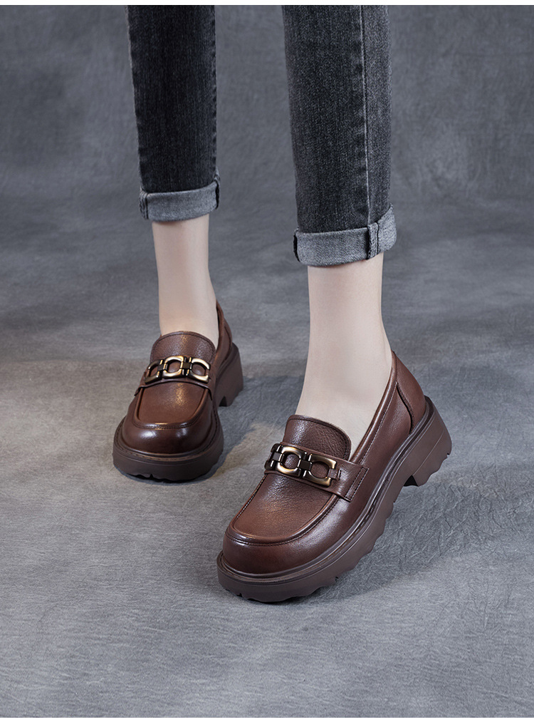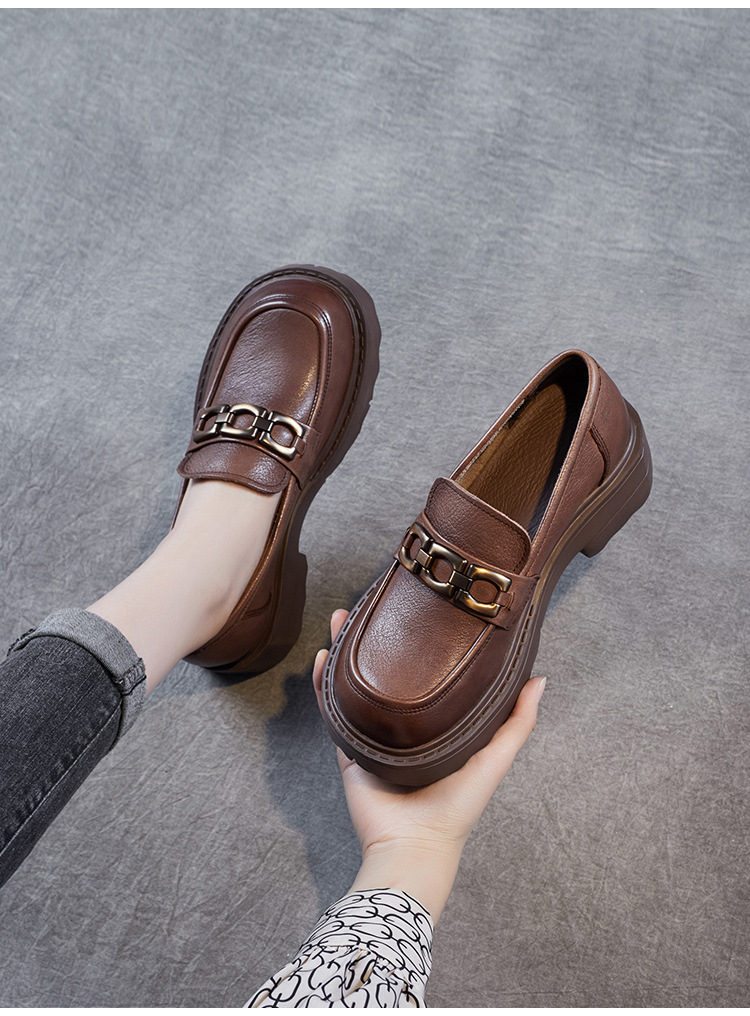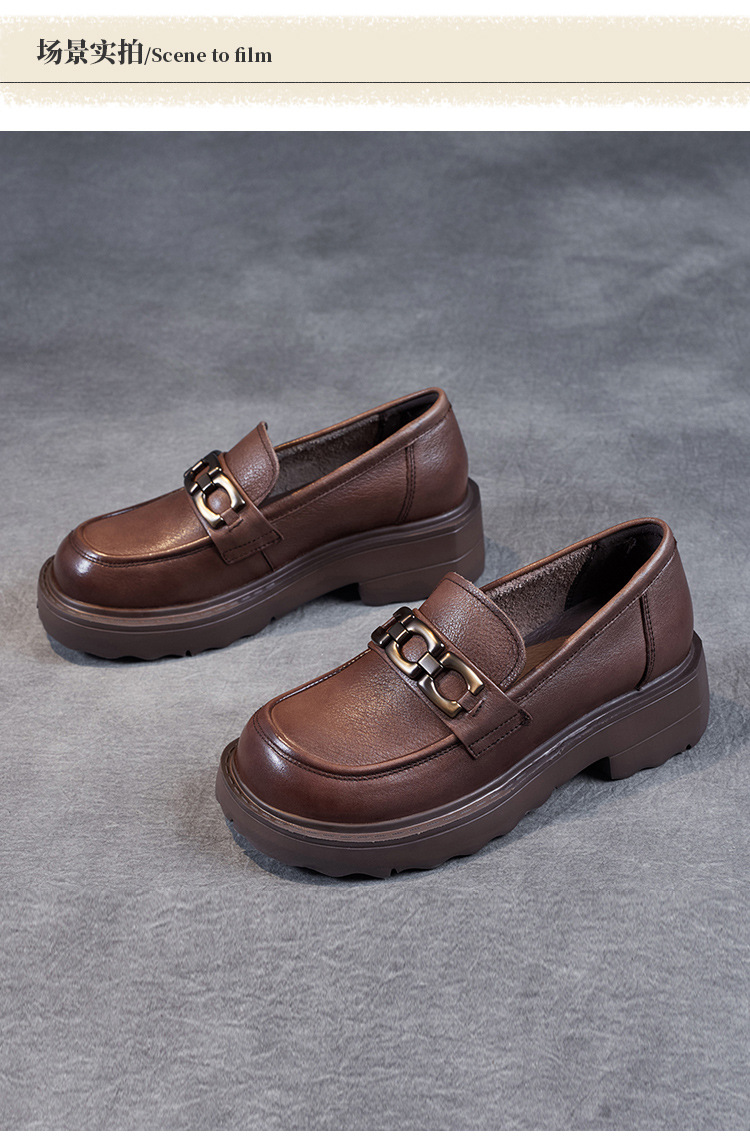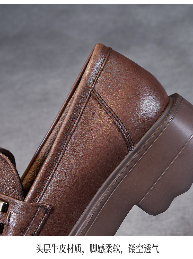 봄과 가을 정품 가죽 플랫폼 로퍼 여성 슬립 온 영국 스타일 청키 힐 싱글 레이어 신발 카우보이 다크 브라운 둥근 발가락 작은 가죽 신발스토어 가기