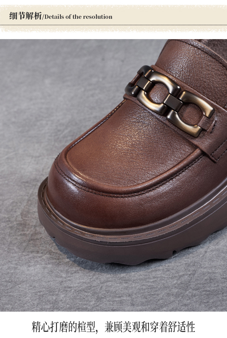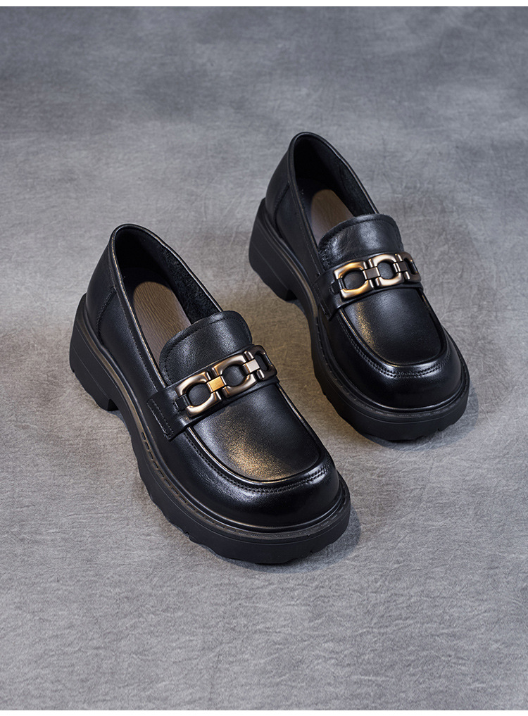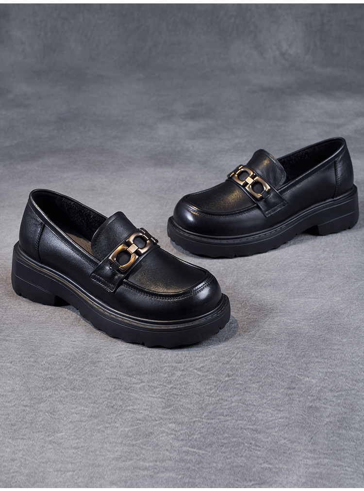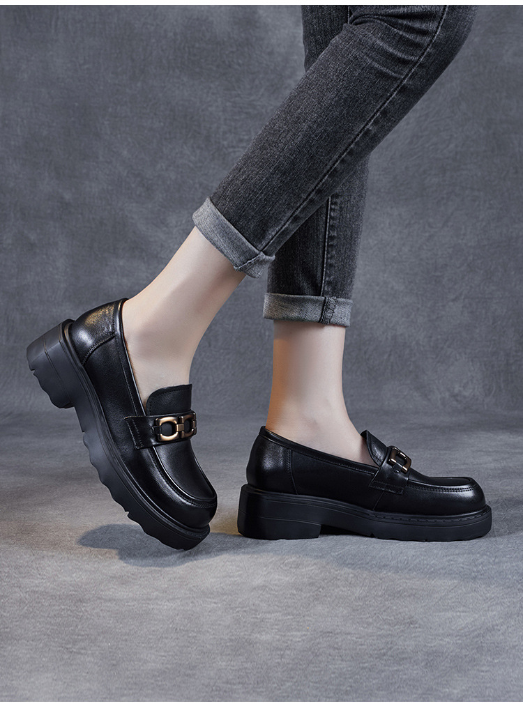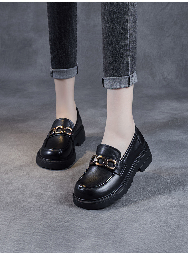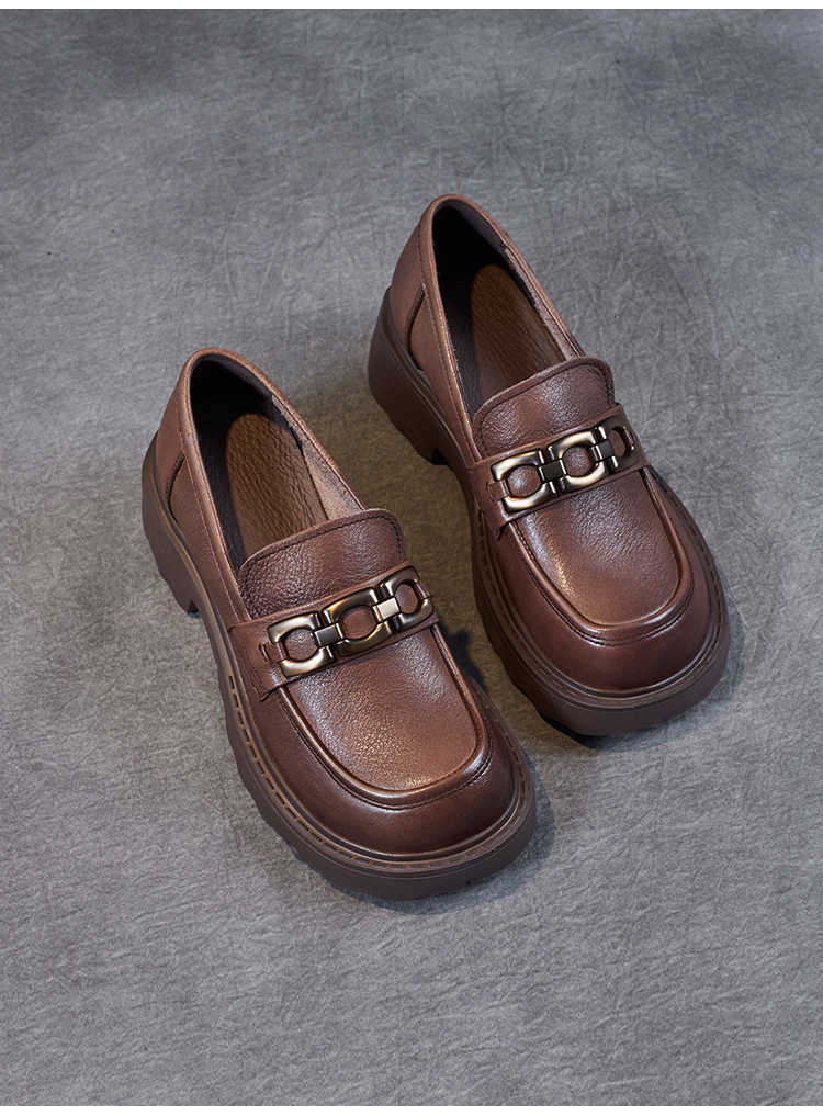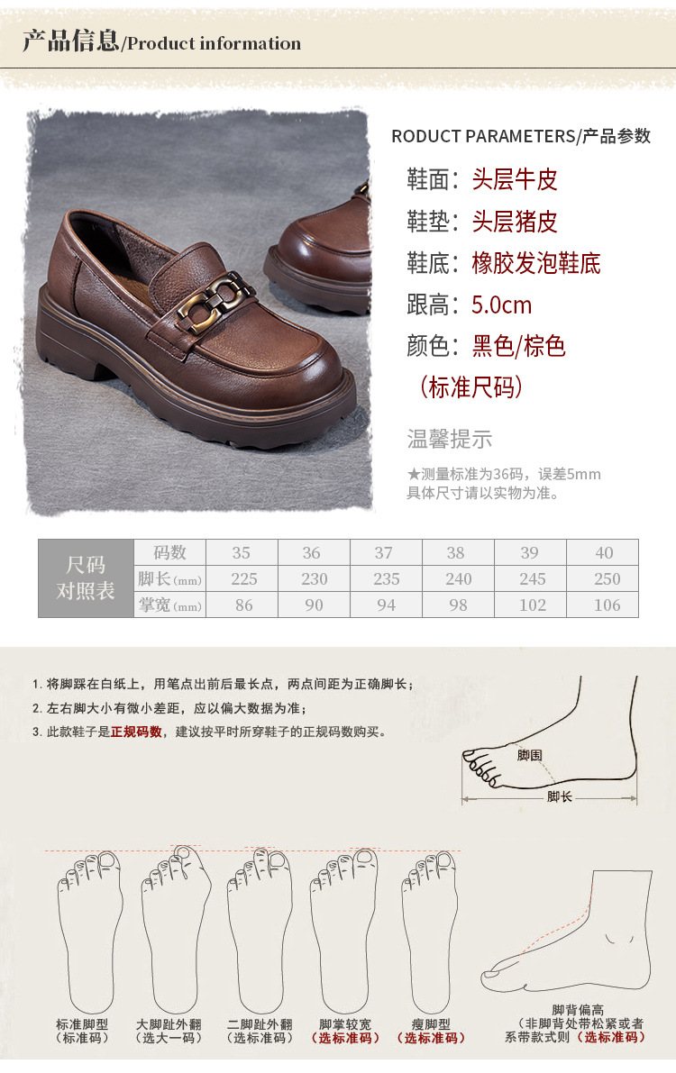 봄과 가을 정품 가죽 플랫폼 로퍼 여성 슬립 온 영국 스타일 청키 힐 싱글 레이어 신발 카우보이 다크 브라운 둥근 발가락 작은 가죽 신발스토어 가기