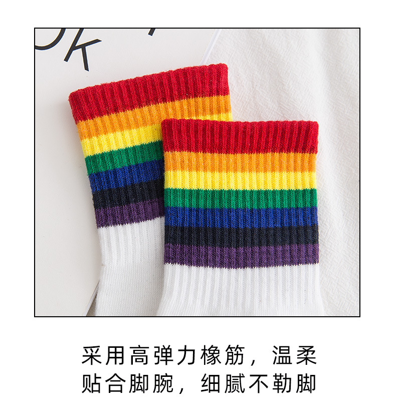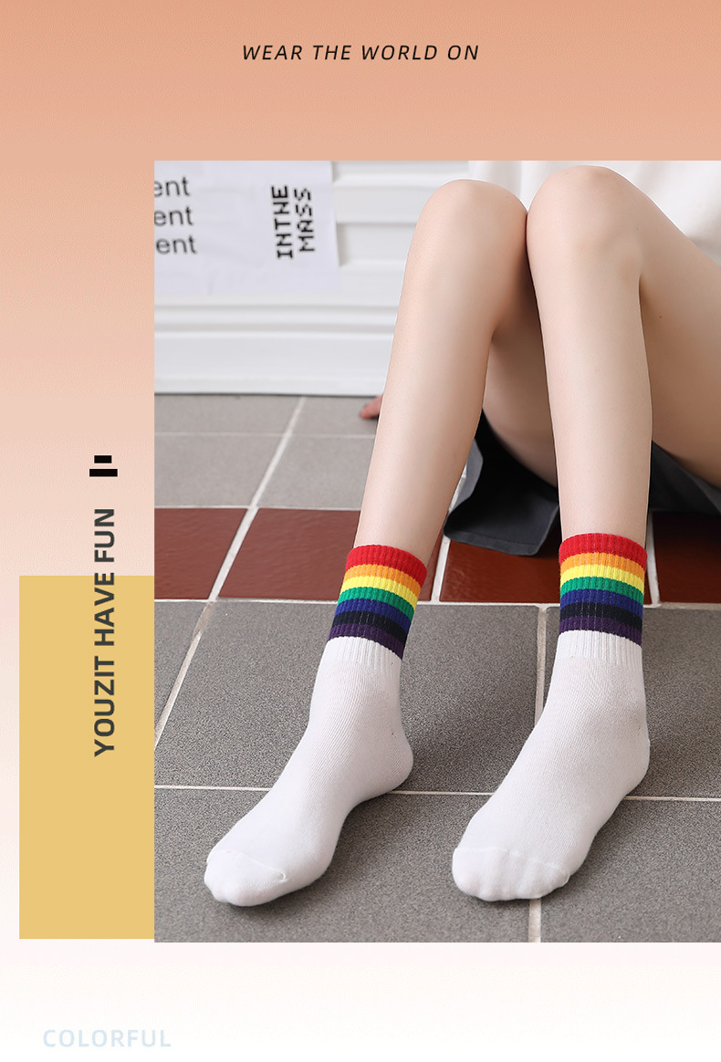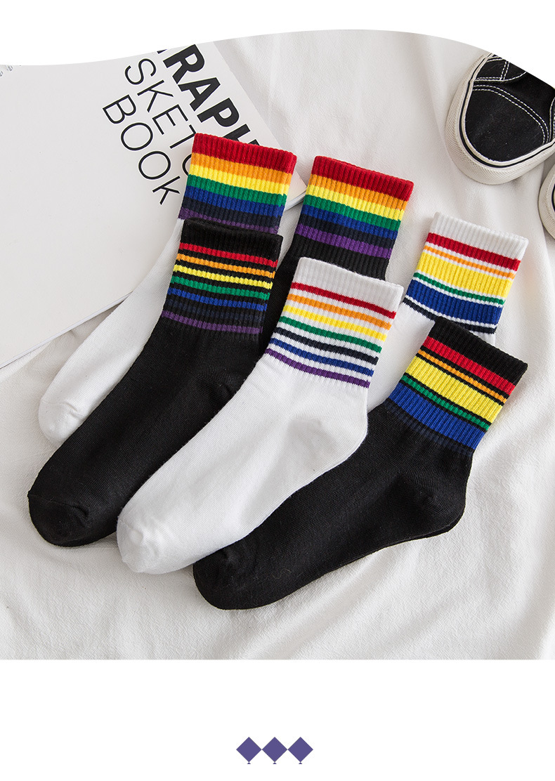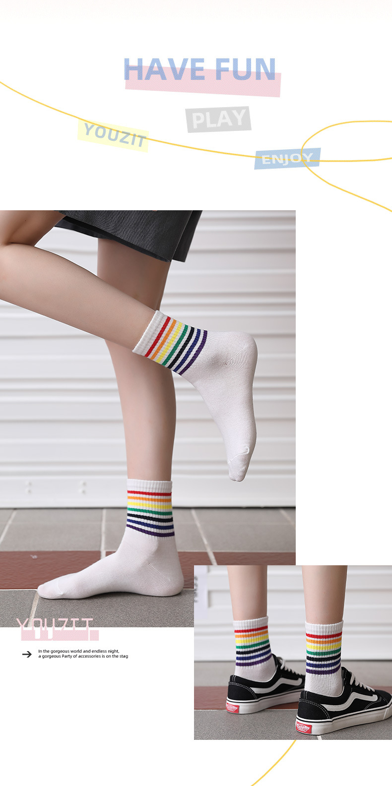 레인보우 양말 여성용 중간 길이의 양말 줄무늬 Ins 트렌디 한 한국 남성 스타킹 봄과 가을 폴리 에스테르 면화 가을과 겨울