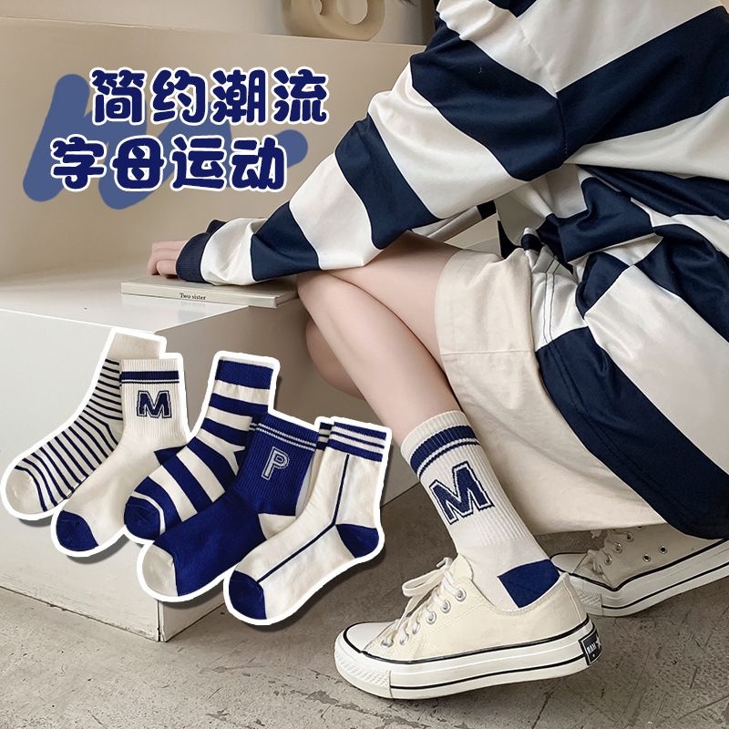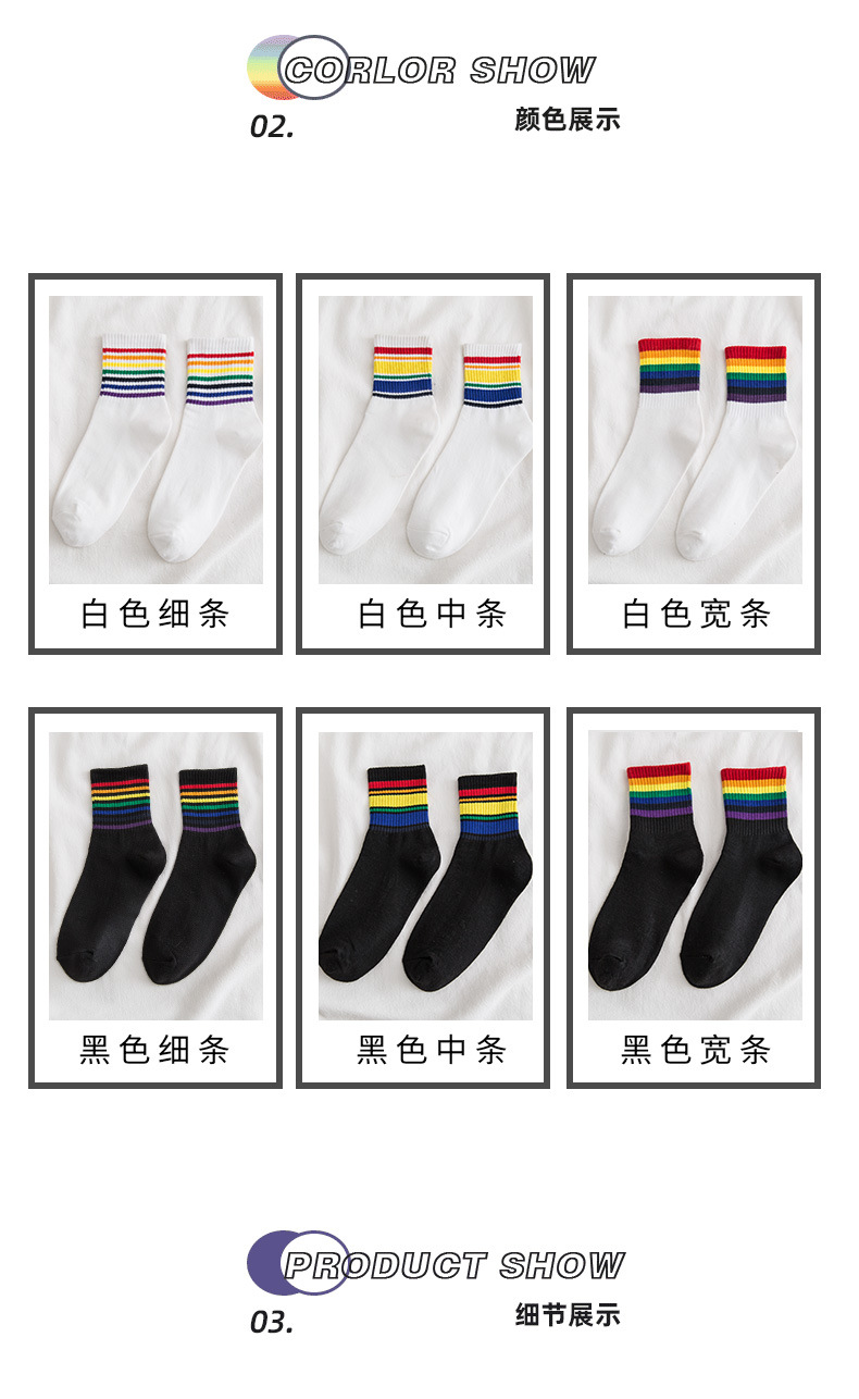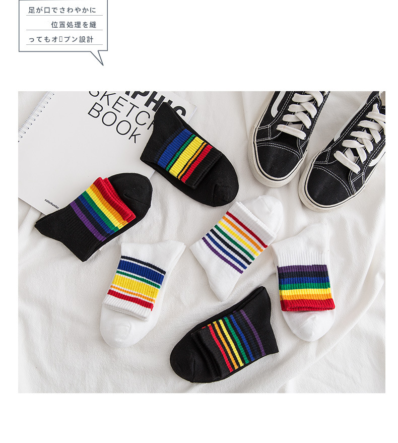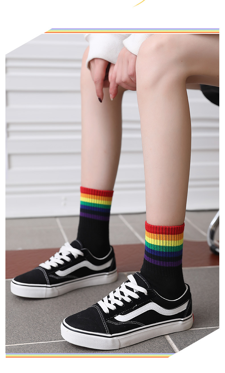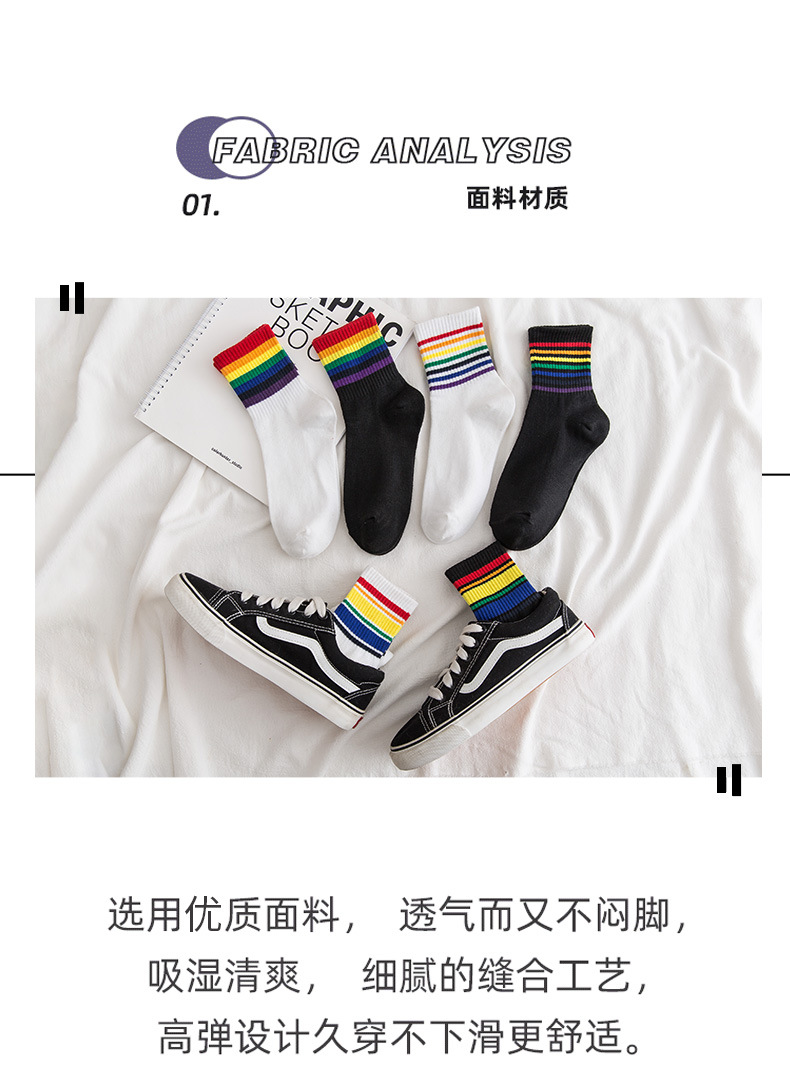레인보우 양말 여성용 중간 길이의 양말 줄무늬 Ins 트렌디 한 한국 남성 스타킹 봄과 가을 폴리 에스테르 면화 가을과 겨울