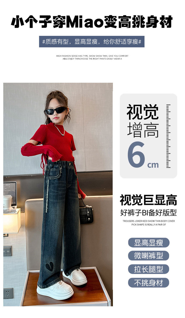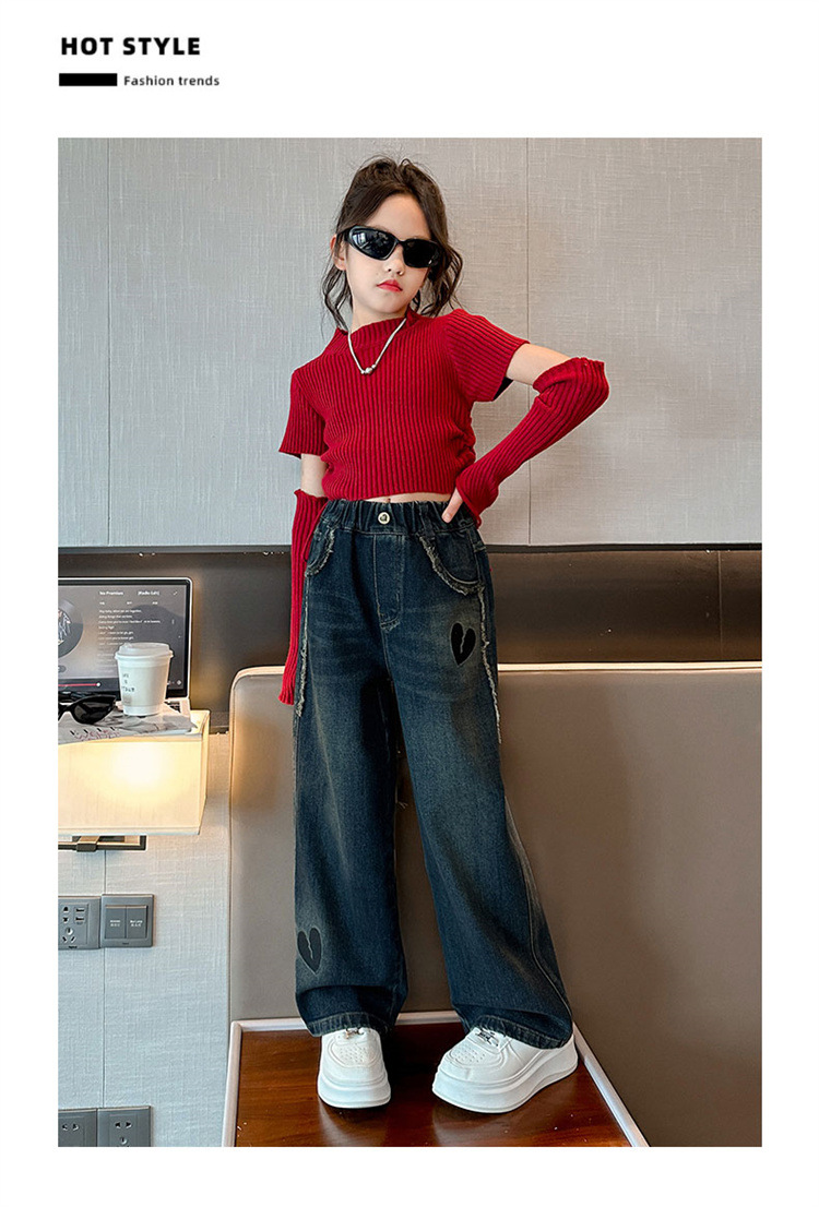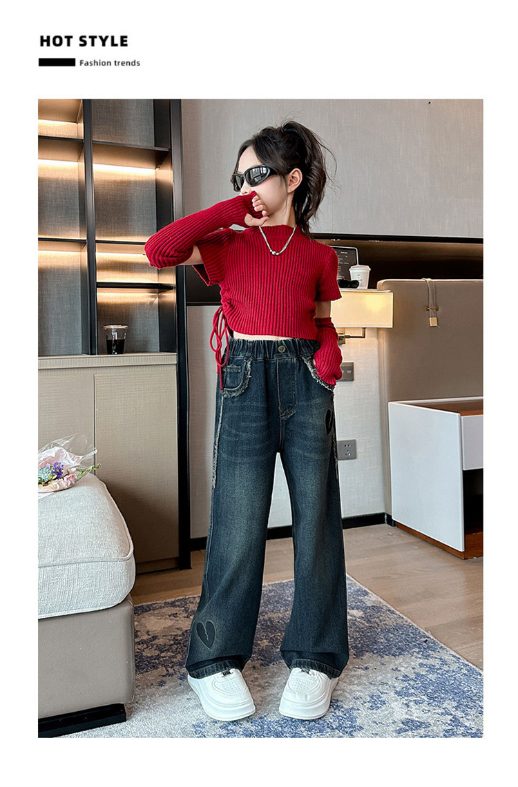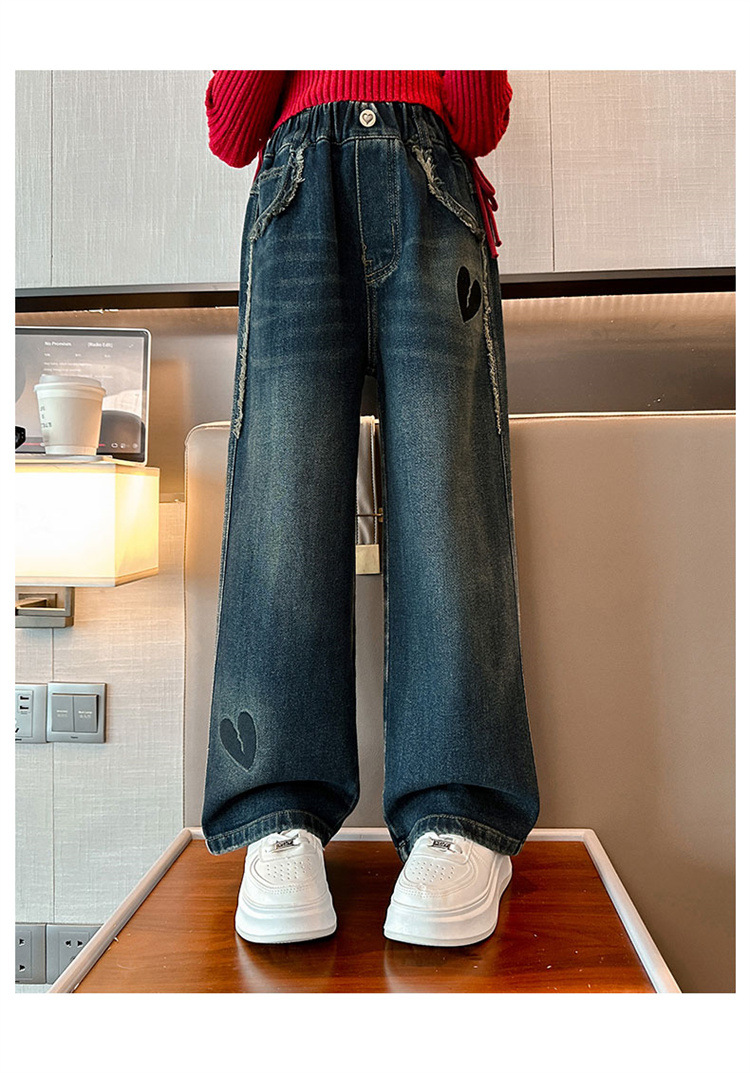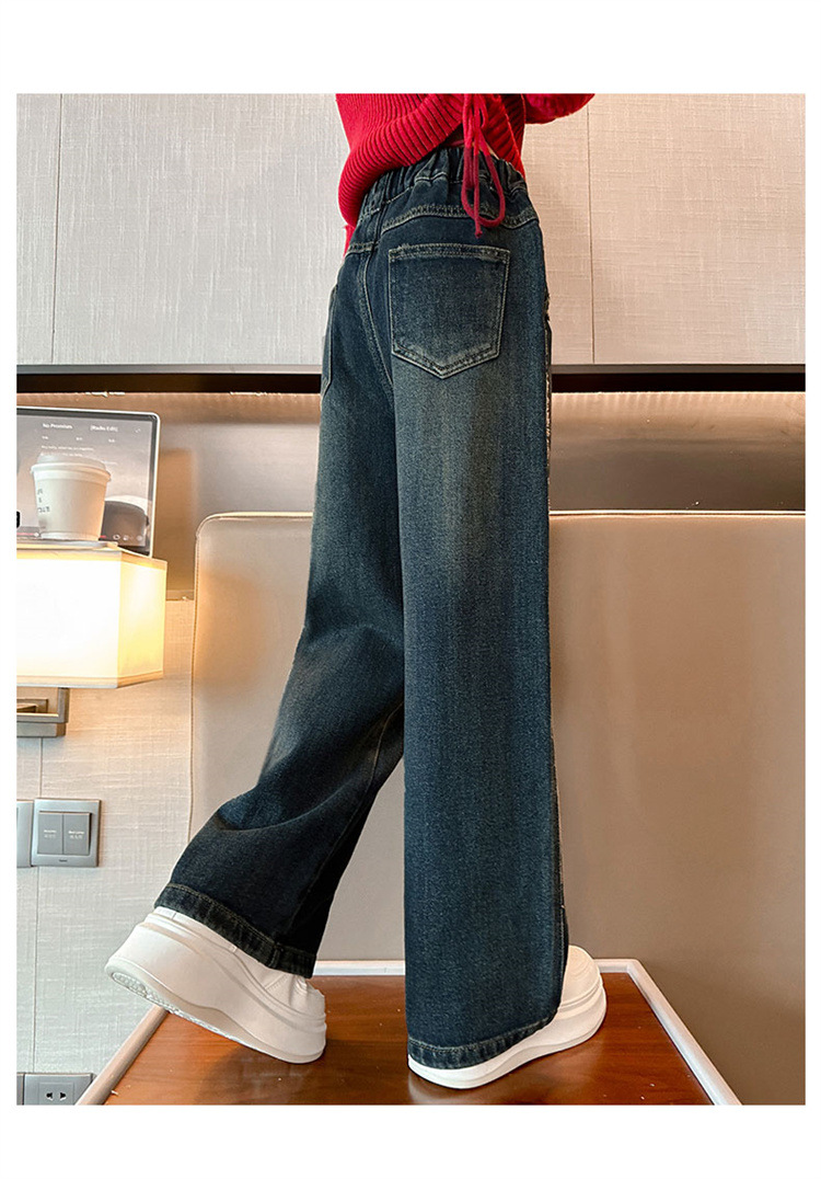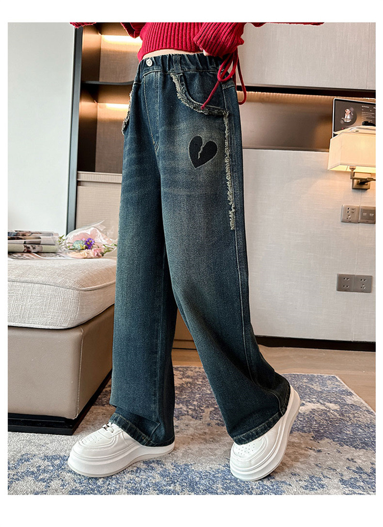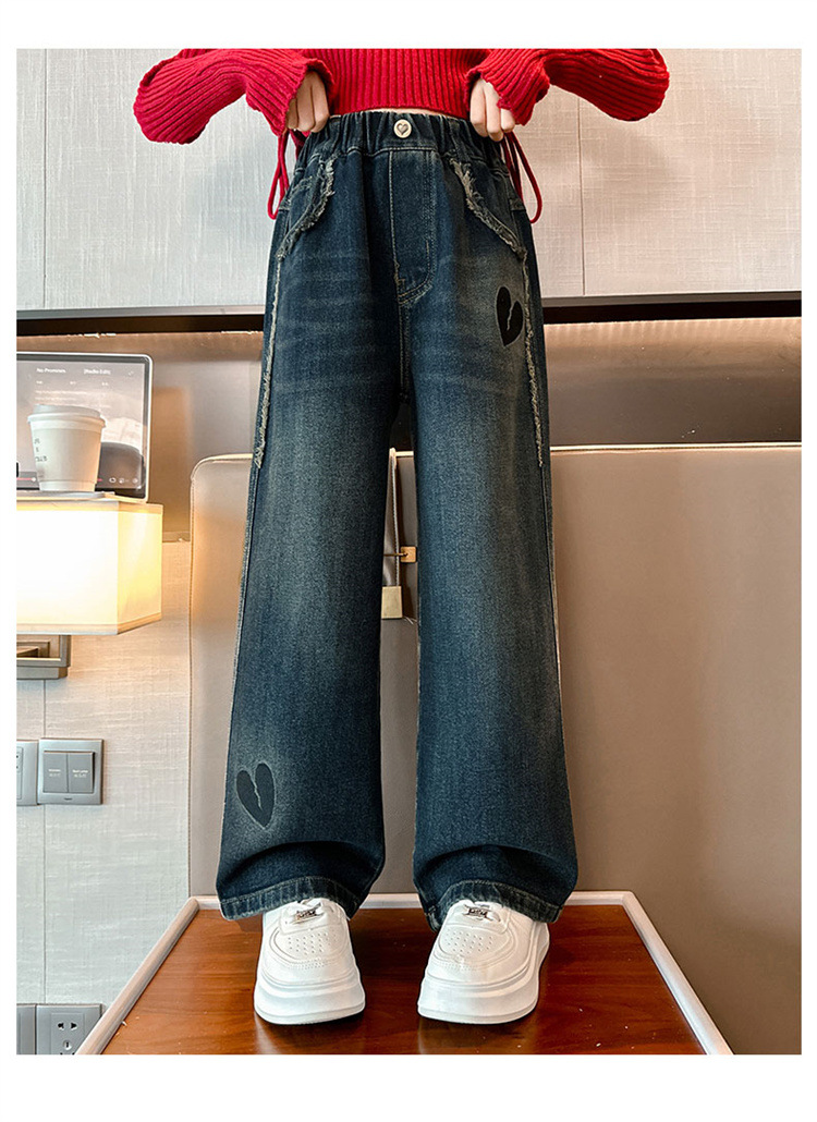 소녀들은 거친 가장자리 넓은 다리 바지를 좋아합니다 한국식 큰 어린이 느슨한 청바지 외국 스타일 어린이 바지 도매 조수 착용