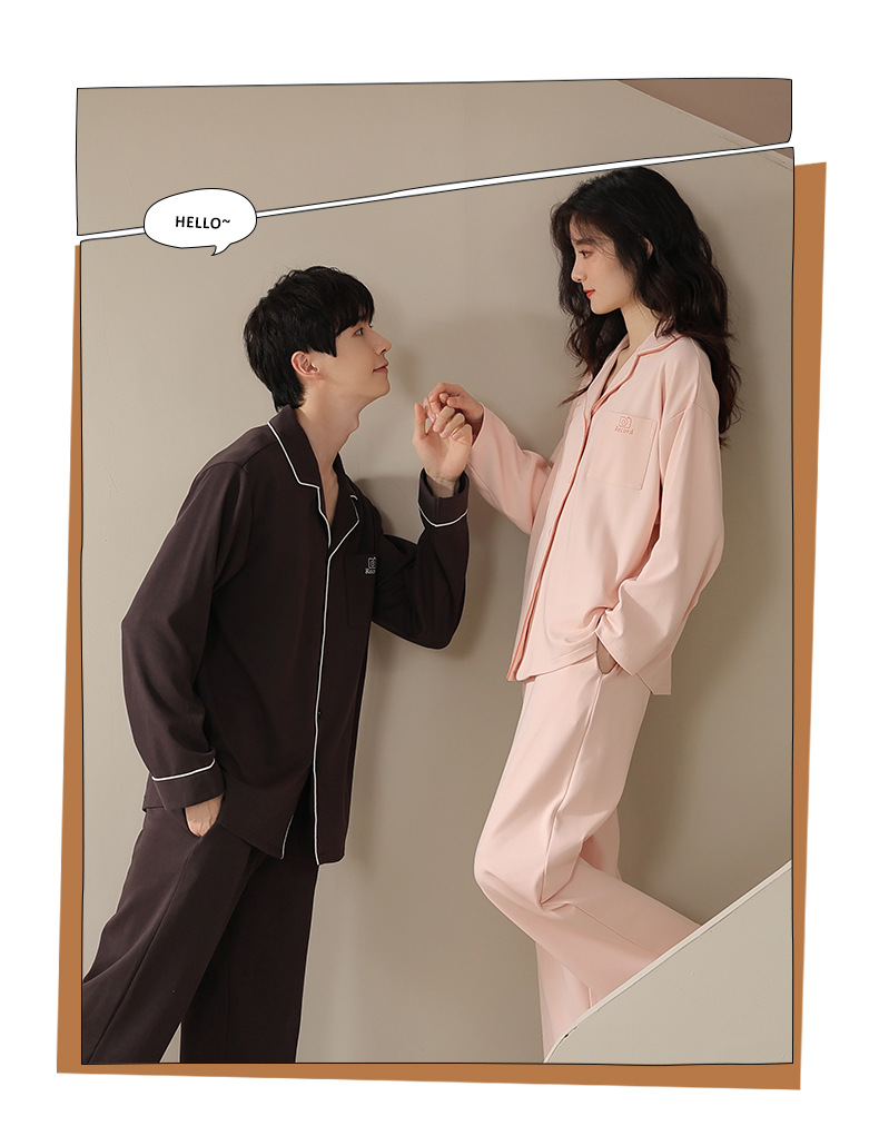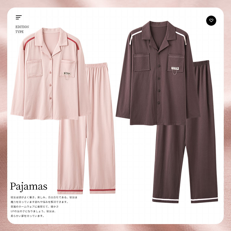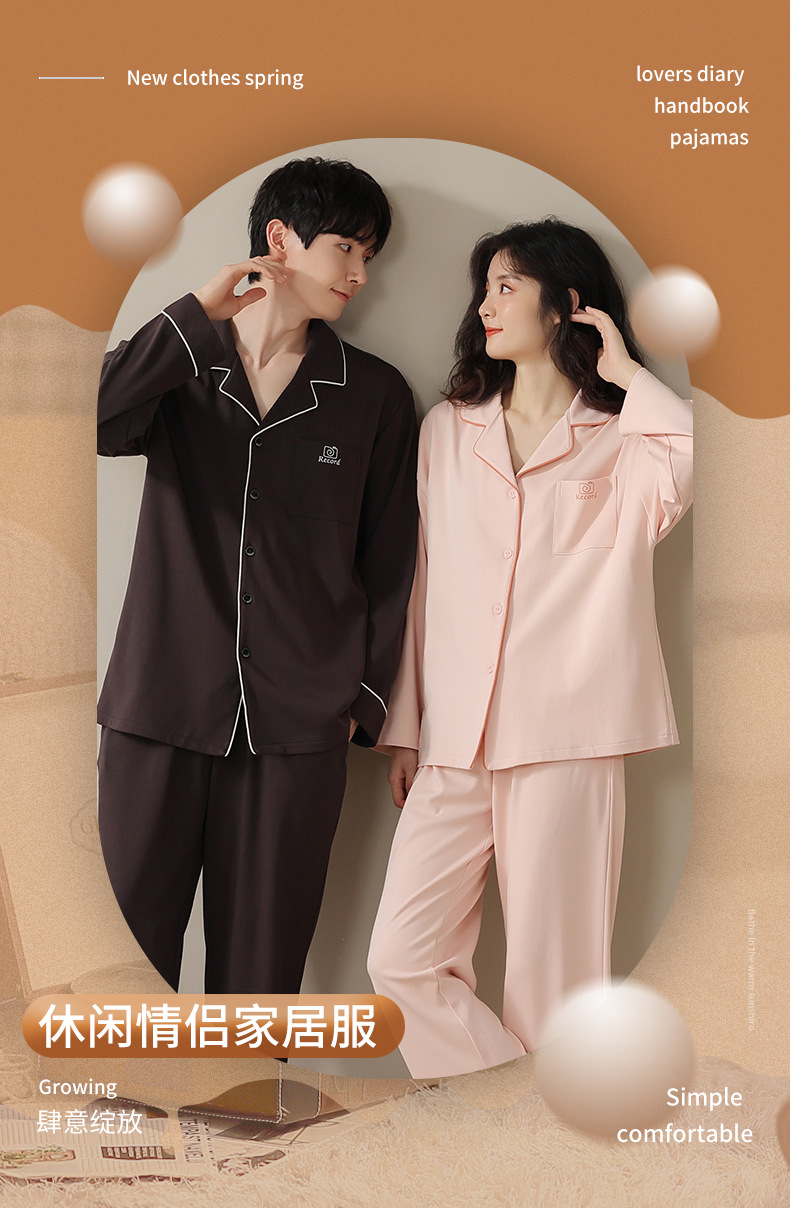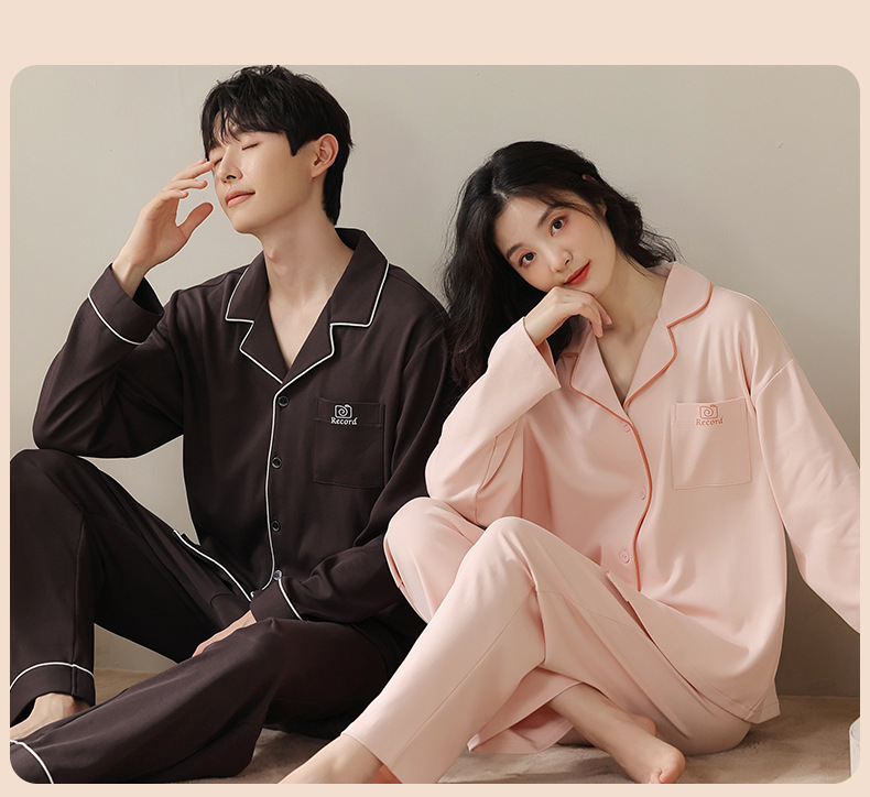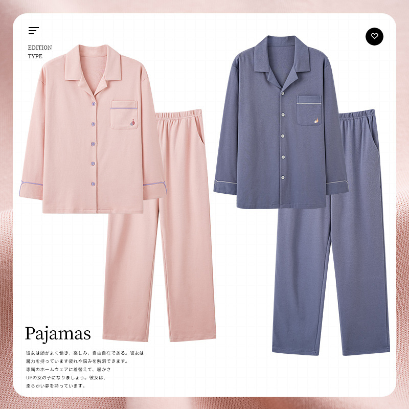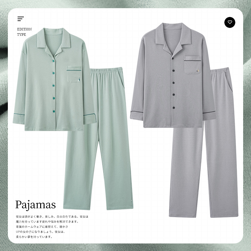 2024 새로운 커플 잠옷 여성용 니트 코튼 긴 소매 옷깃 세트 간단한 고급 남성 봄과 가을 가정 옷