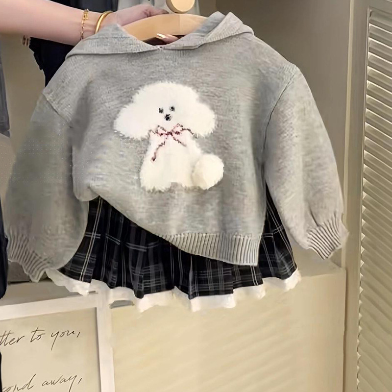 Tong Xingyuan 봄과 가을 새로운 어린이 소녀 착용 귀여운 강아지 후드 니트 스웨터 탑 플리츠 스커트 투피스 세트스토어 가기