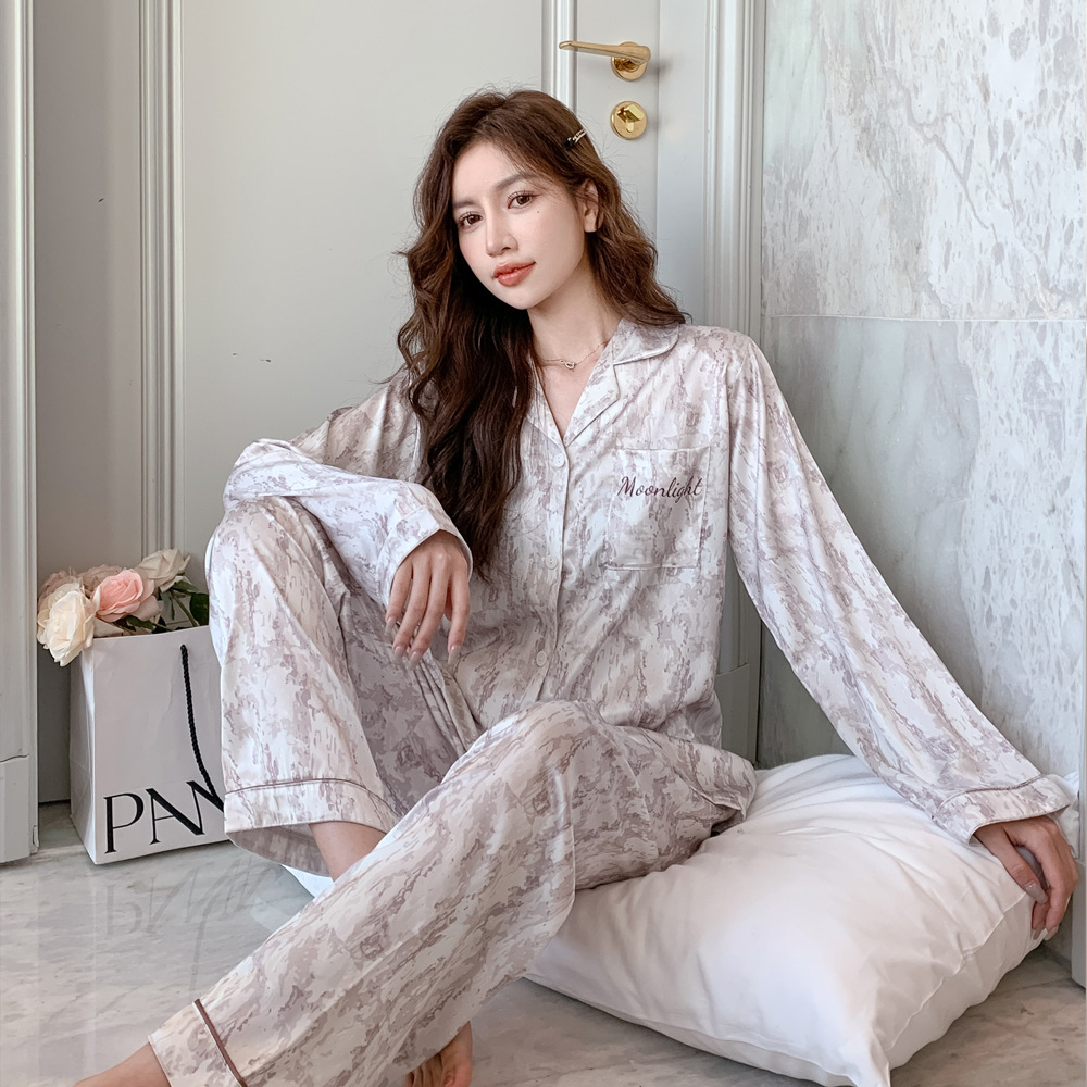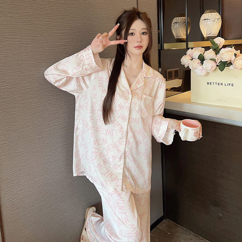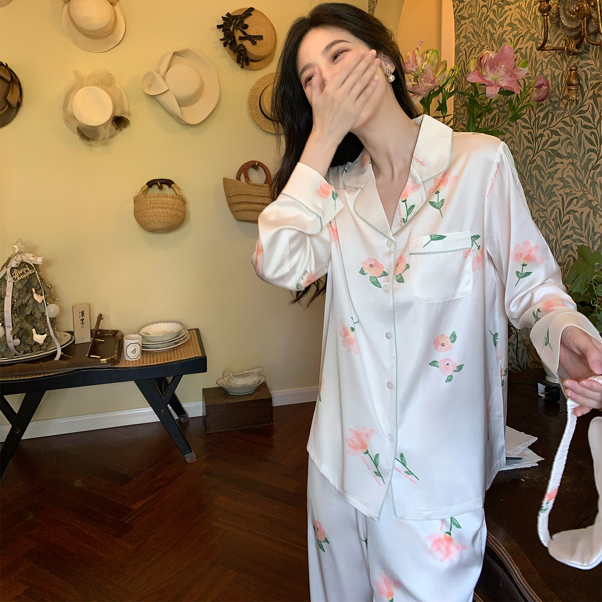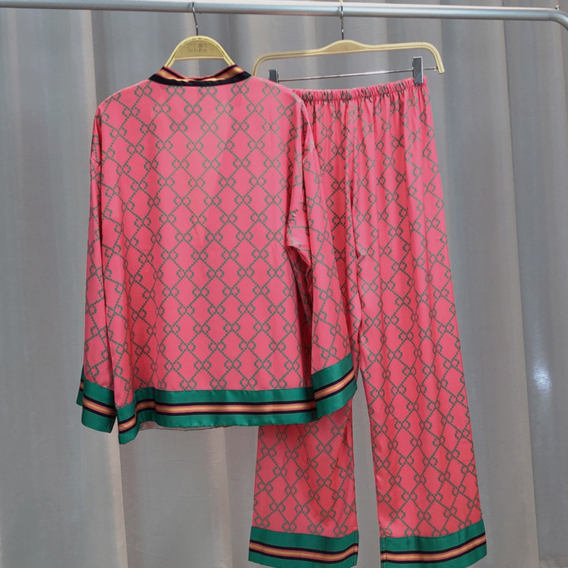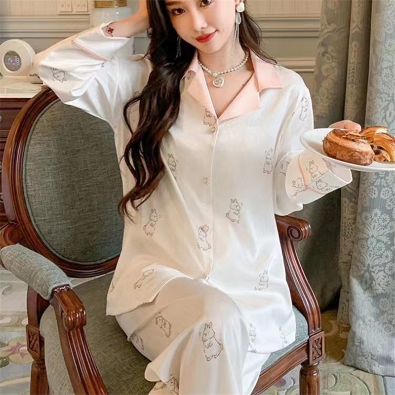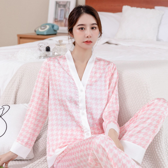 공장 직접 2024 새로운 잠옷 여성 모조 실크 세트 봄과 가을에 바람 세트 V 칼라를 배포 할 수 있습니다 도매