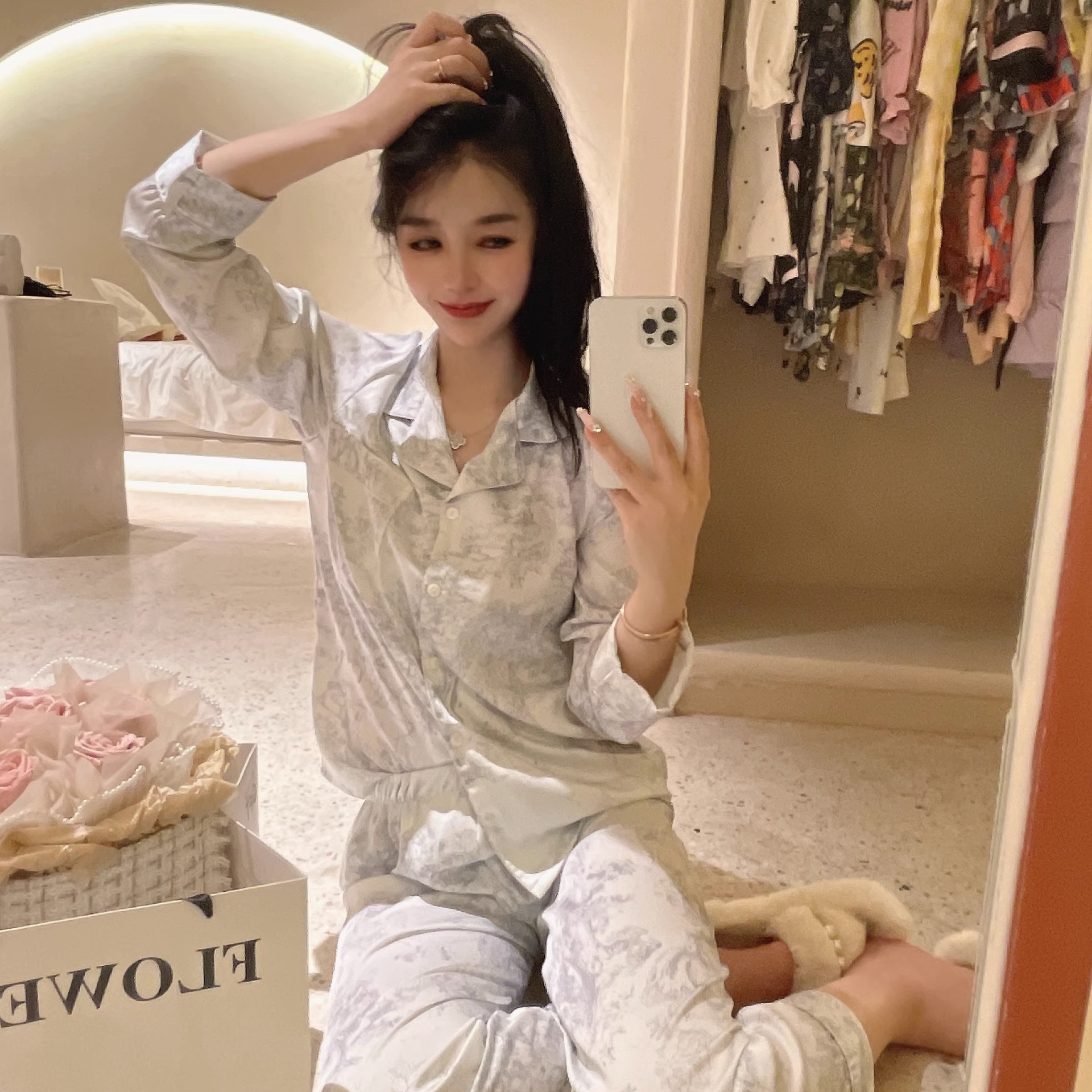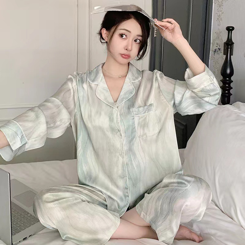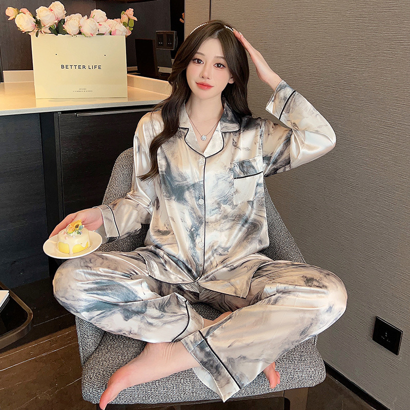공장 직접 2024 새로운 잠옷 여성 모조 실크 세트 봄과 가을에 바람 세트 V 칼라를 배포 할 수 있습니다 도매스토어 가기