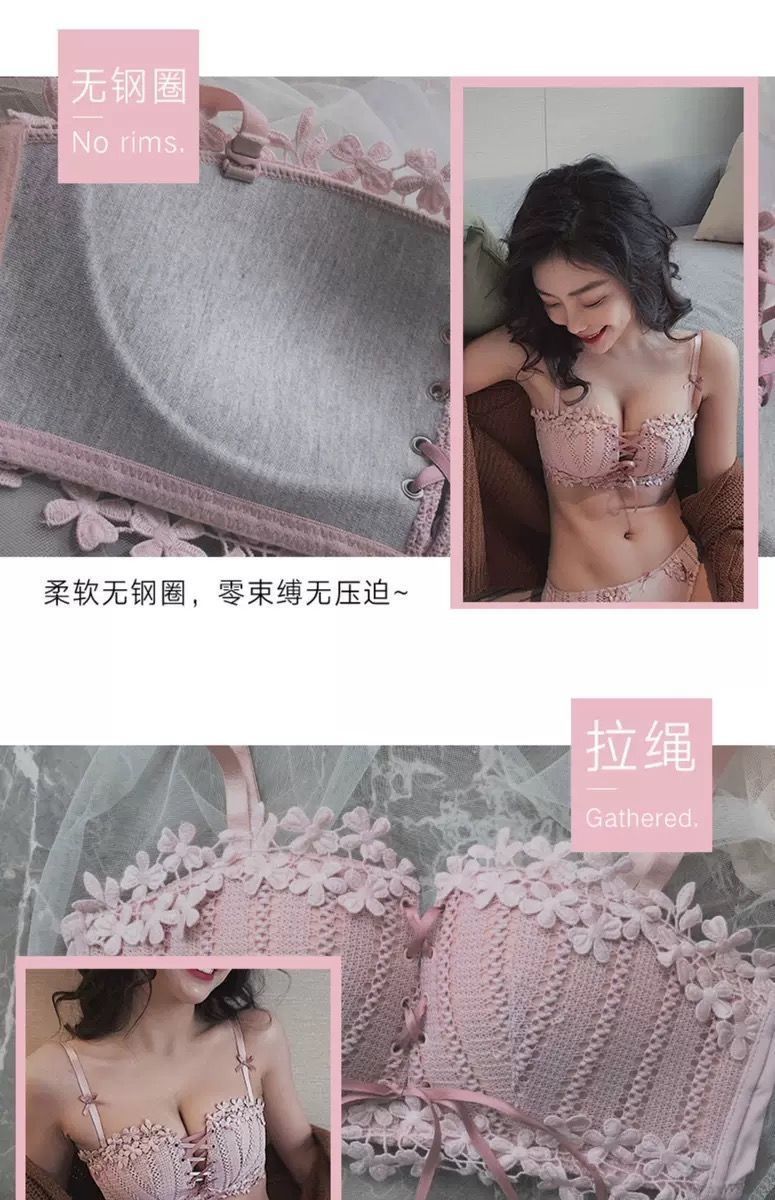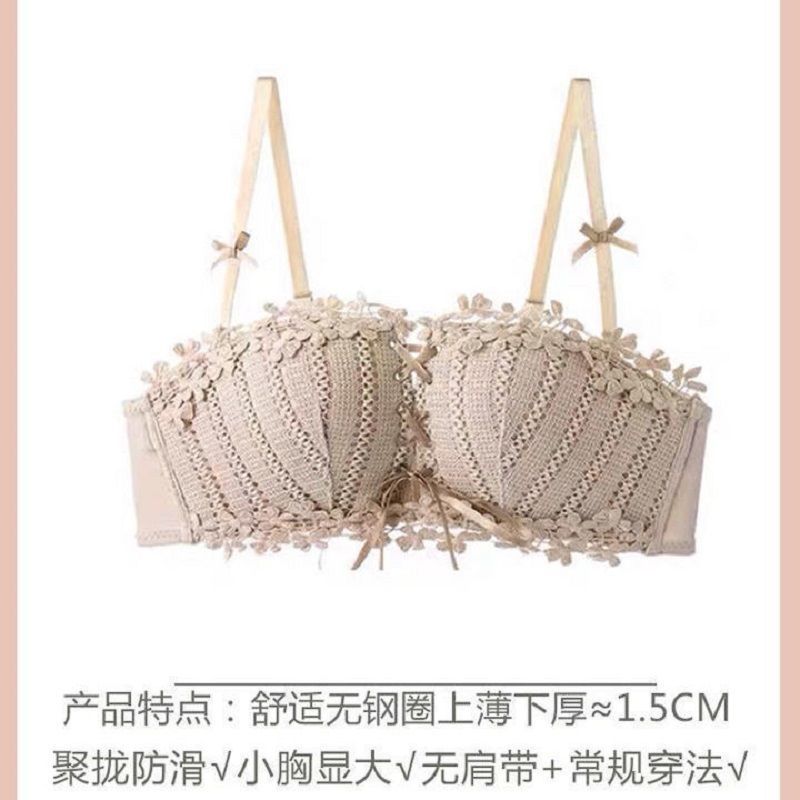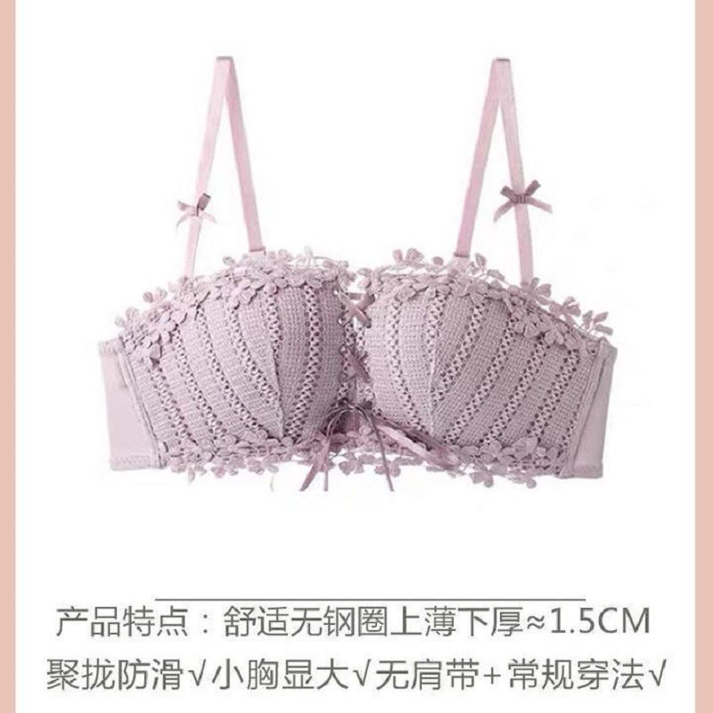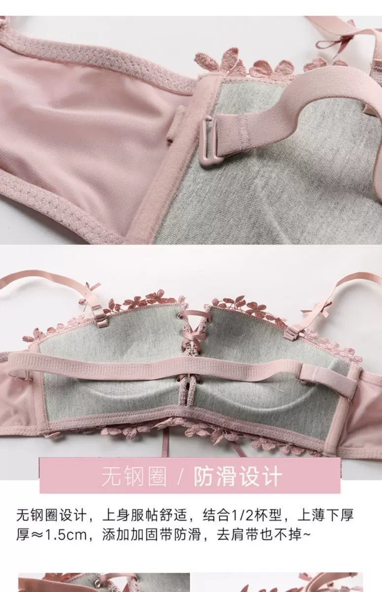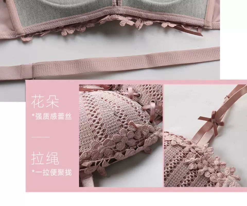 순수한 매력의 레이스 노와이어 브라, 작은 가슴을 모아주는 스트랩 브라, 학생용 옆가슴 보정 브라 세트 (패드 포함)스토어 가기