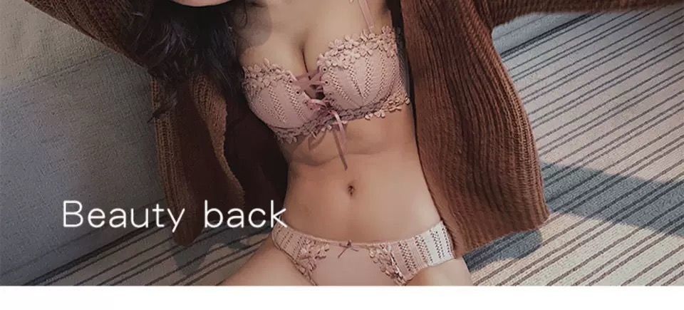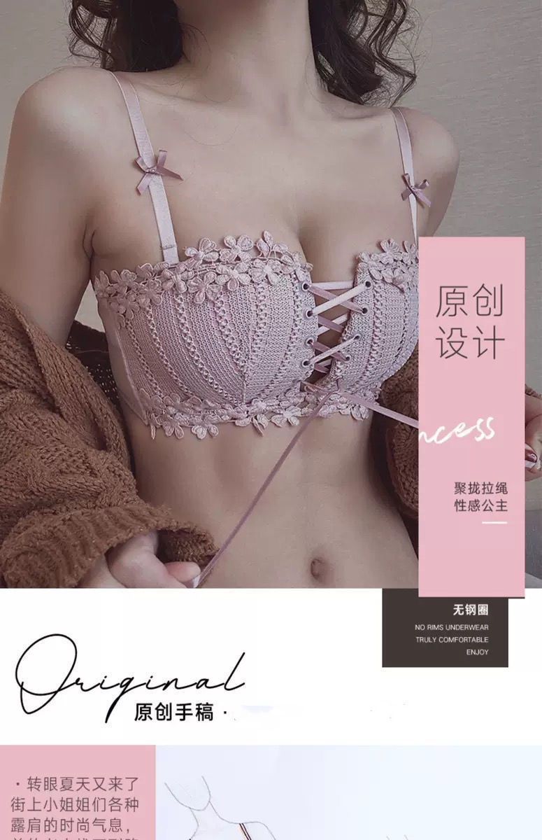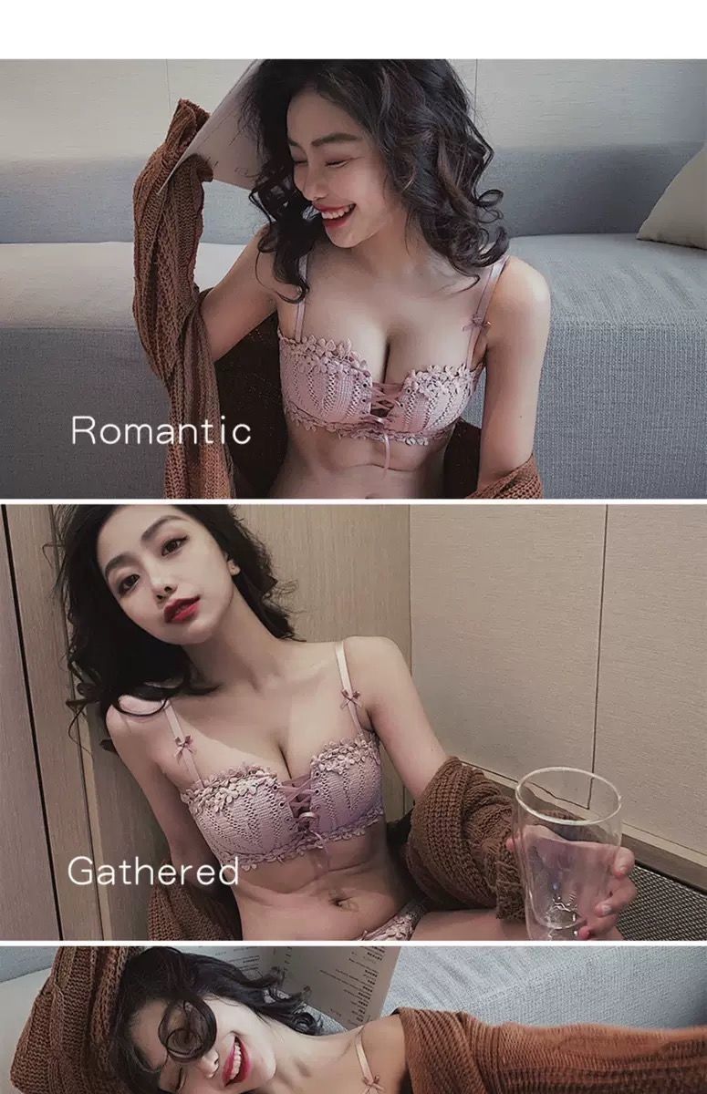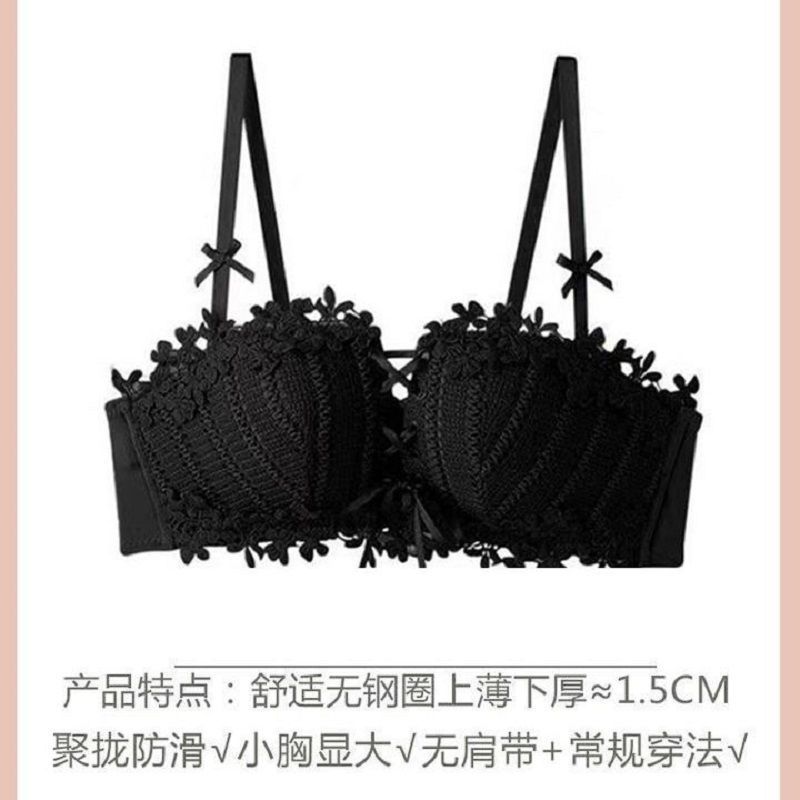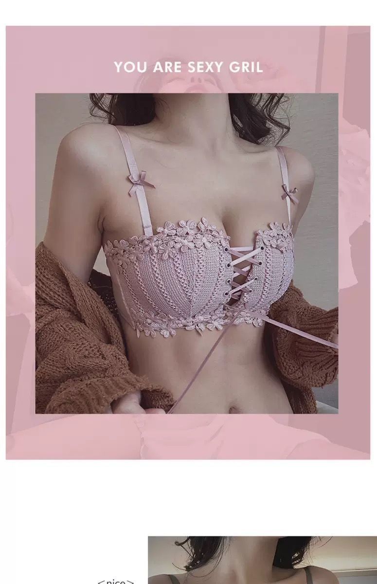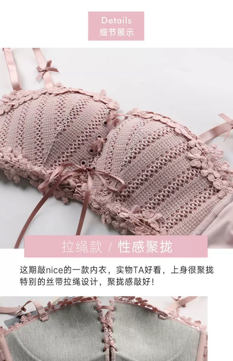 순수한 매력의 레이스 노와이어 브라, 작은 가슴을 모아주는 스트랩 브라, 학생용 옆가슴 보정 브라 세트 (패드 포함)스토어 가기