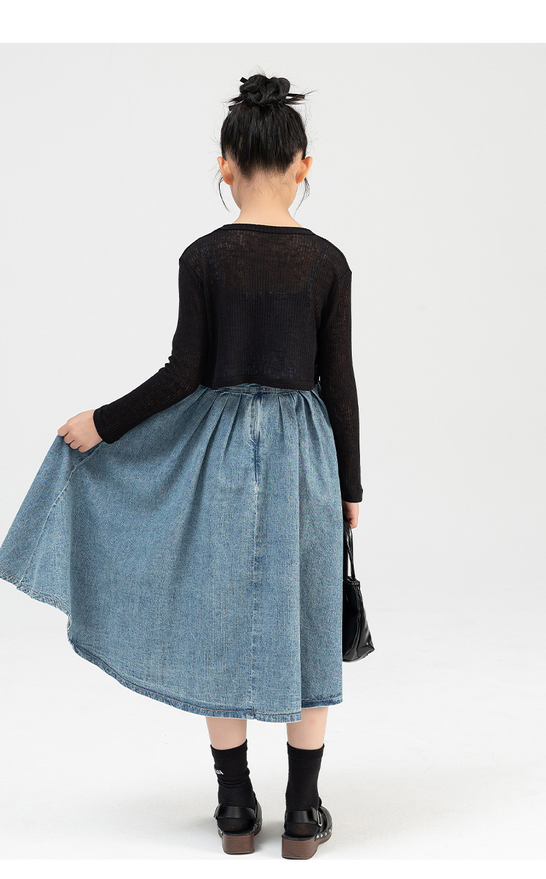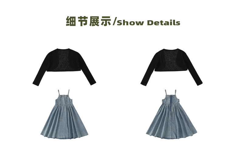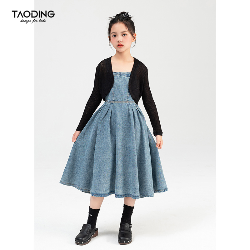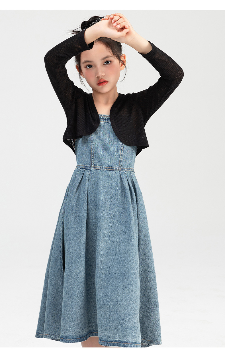 Amoy 소녀 세트 여름 2024 새로운 cuhk 어린이 서양식 니트 숄 서스펜더 스커트 데님 스커트 투피스 세트