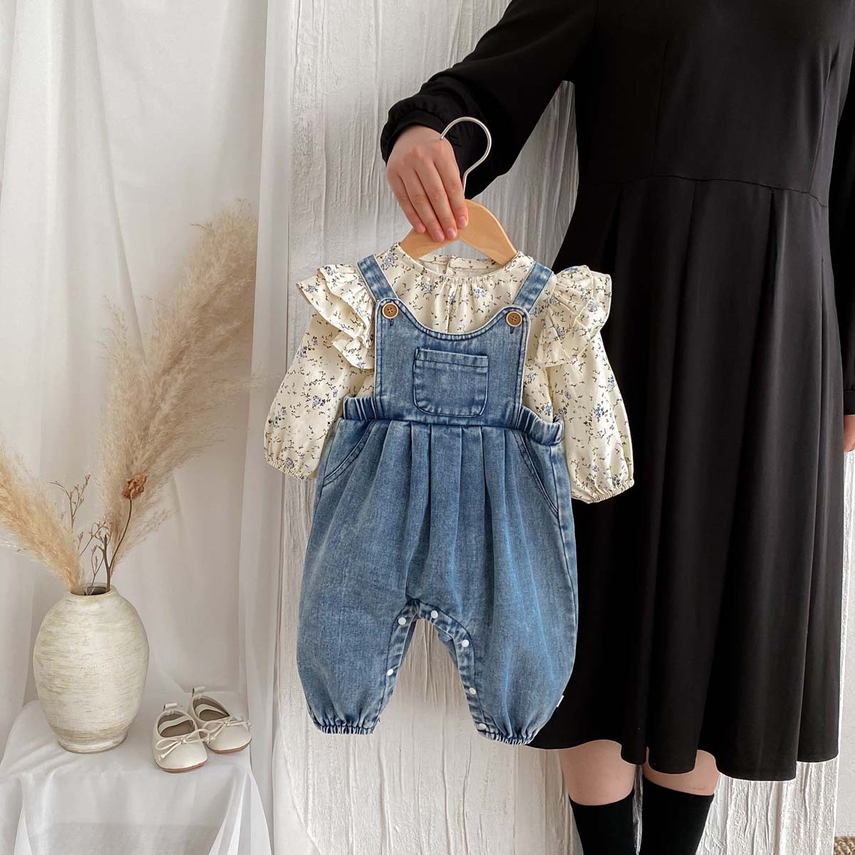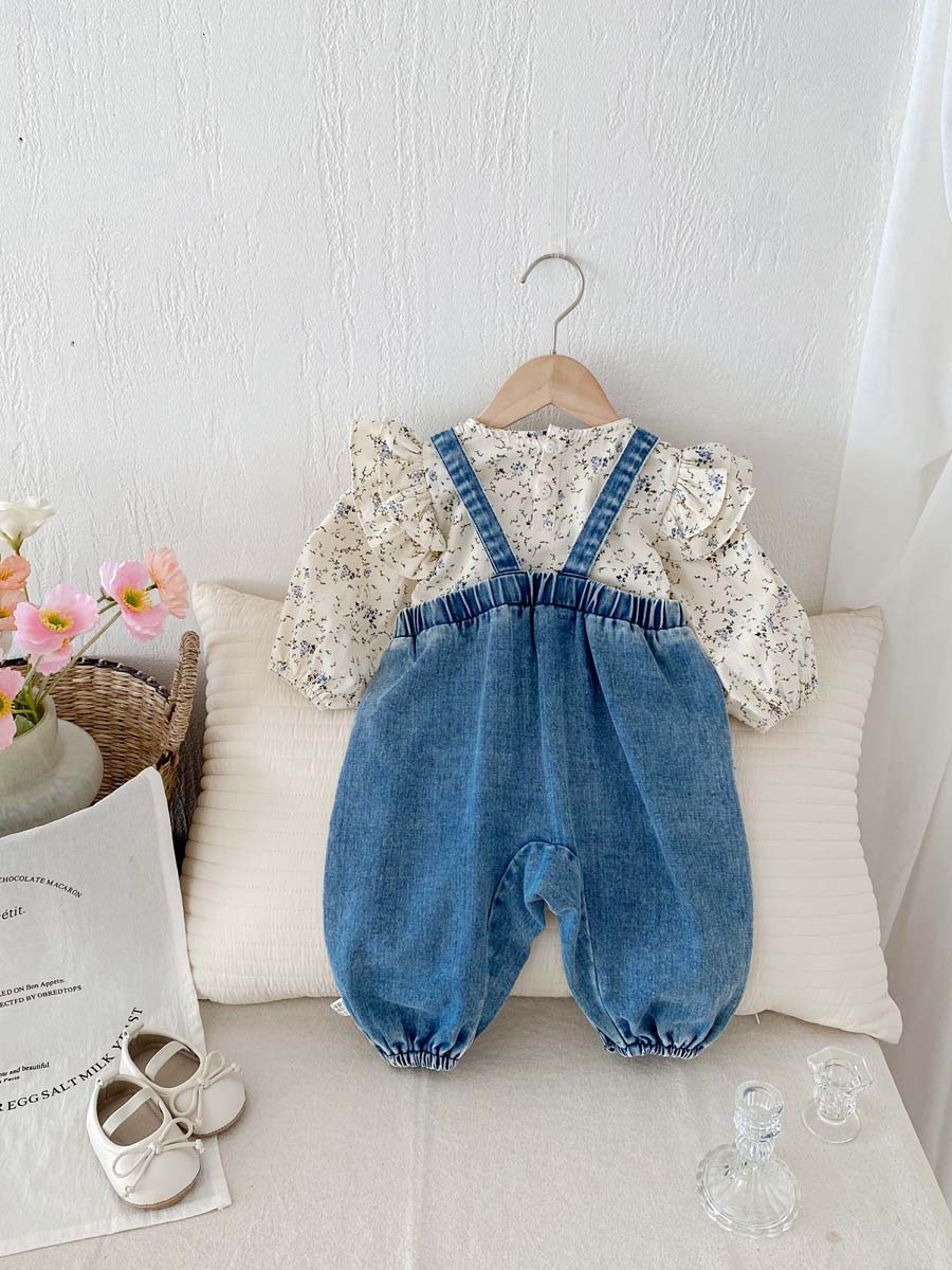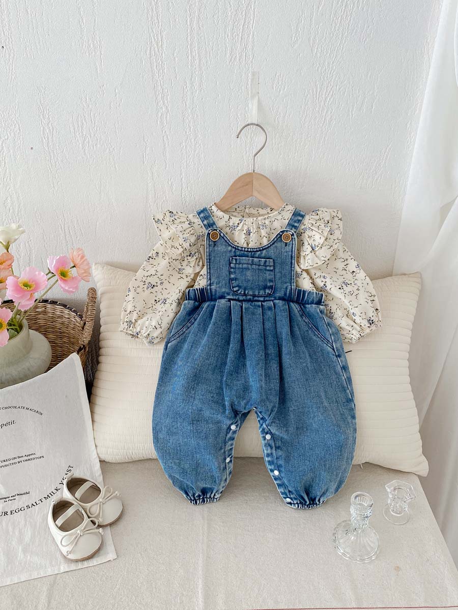 한국식 아기의 가을 새 도착 데님 스트래퍼 바지 세트 아기 소녀 달콤한 꽃 셔츠 투피스 세트