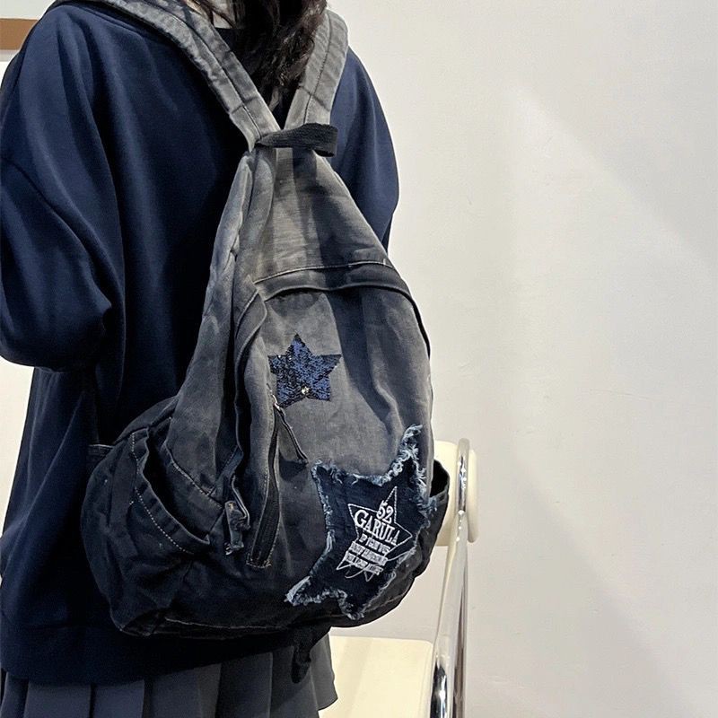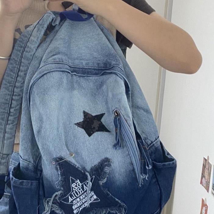 대외 무역 y2k 밀레니얼 그라데이션 데님 백팩 여학생 대용량 빈티지 스타일 학생 가방 책가방 트렌디스토어 가기