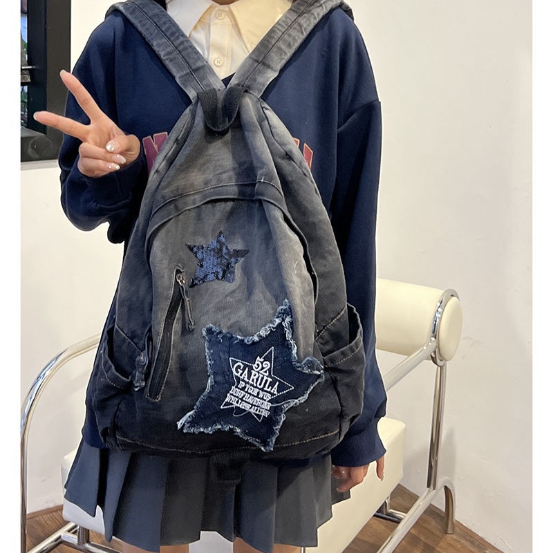 대외 무역 y2k 밀레니얼 그라데이션 데님 백팩 여학생 대용량 빈티지 스타일 학생 가방 책가방 트렌디
