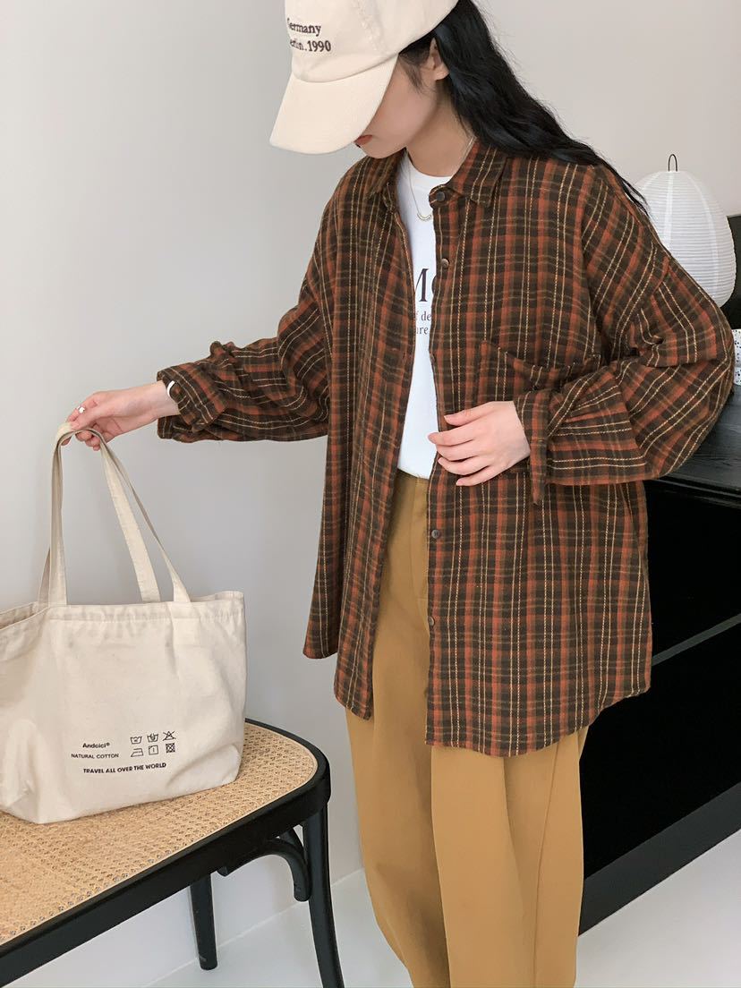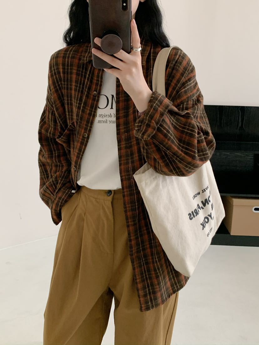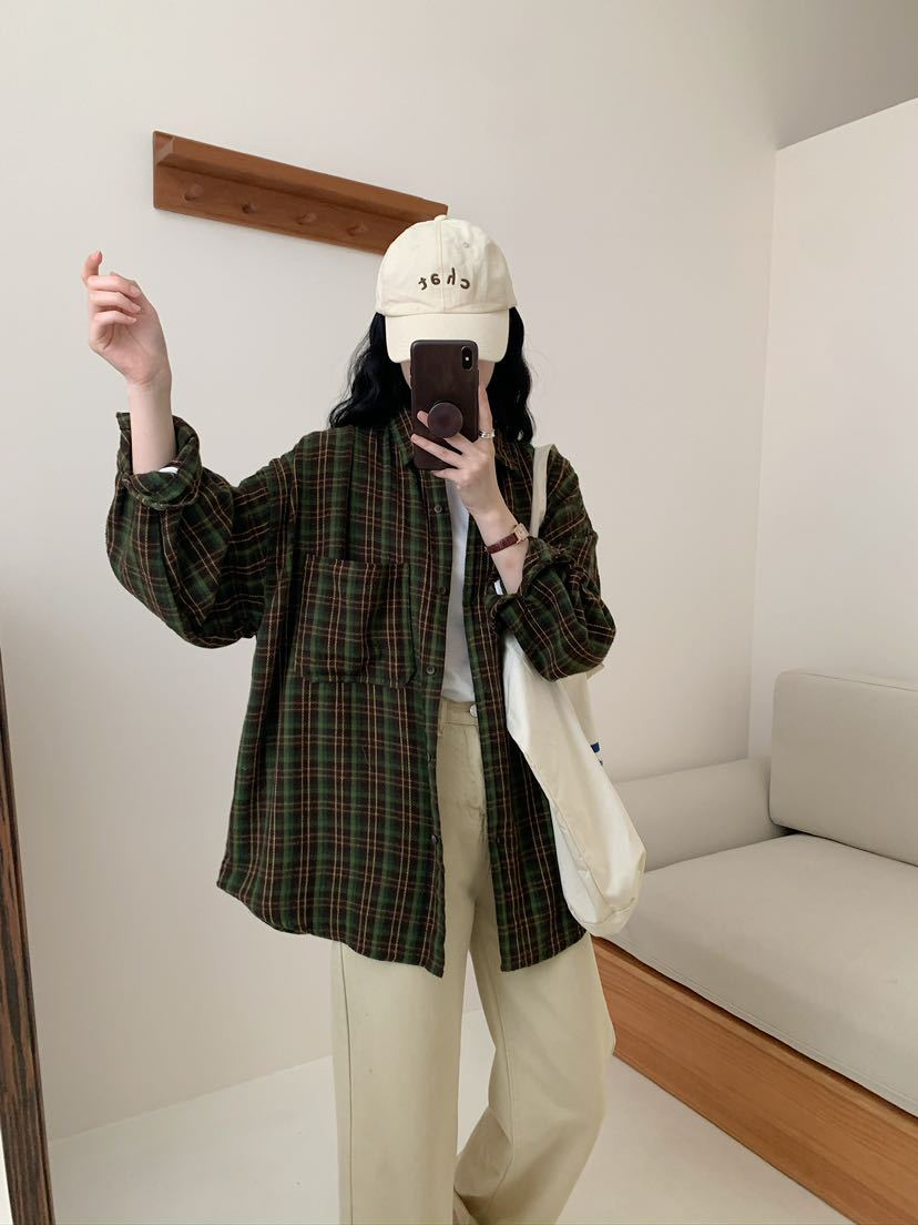 2024 년 가을을위한 격자 무늬 긴팔 셔츠 한국 스타일 유행 간단한 옷깃 싱글 브레스트 올 매치 루즈 캐주얼 셔츠스토어 가기
