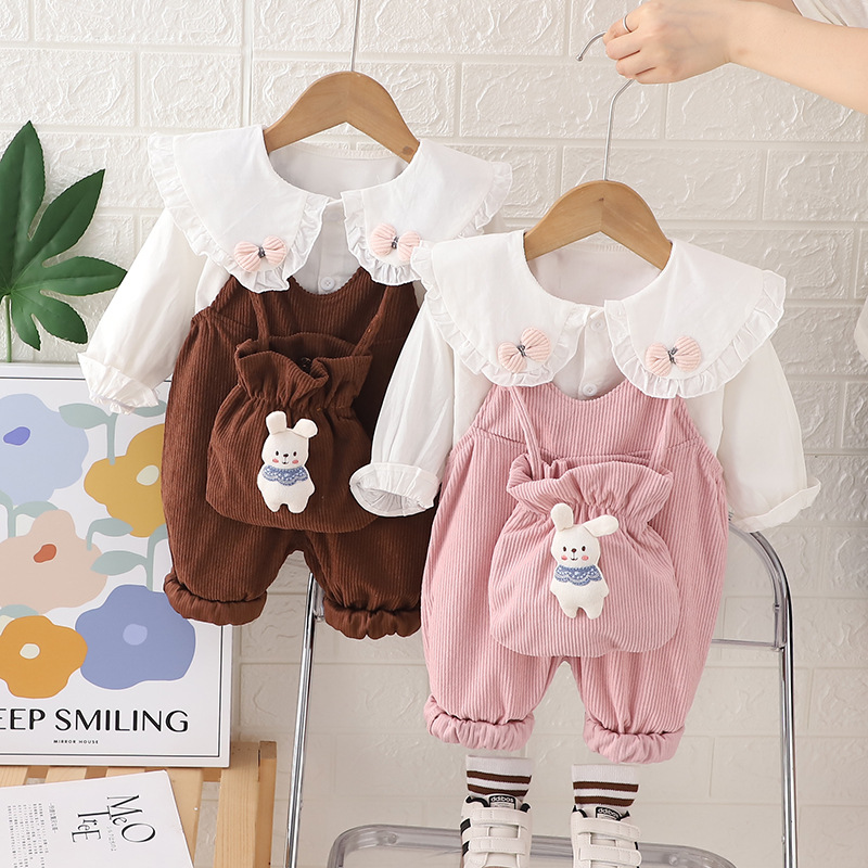 소녀 긴팔 셔츠와 귀여운 래스 레이스가 달린 투피스 세트 봄 · 가을 새 소녀들의 세트 한국 스타일스토어 가기