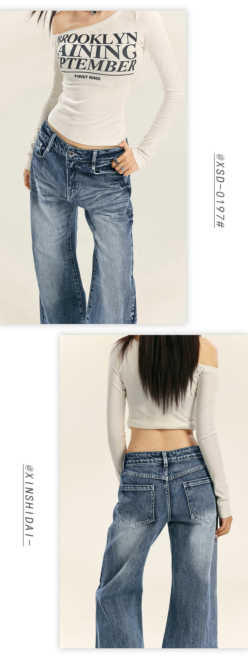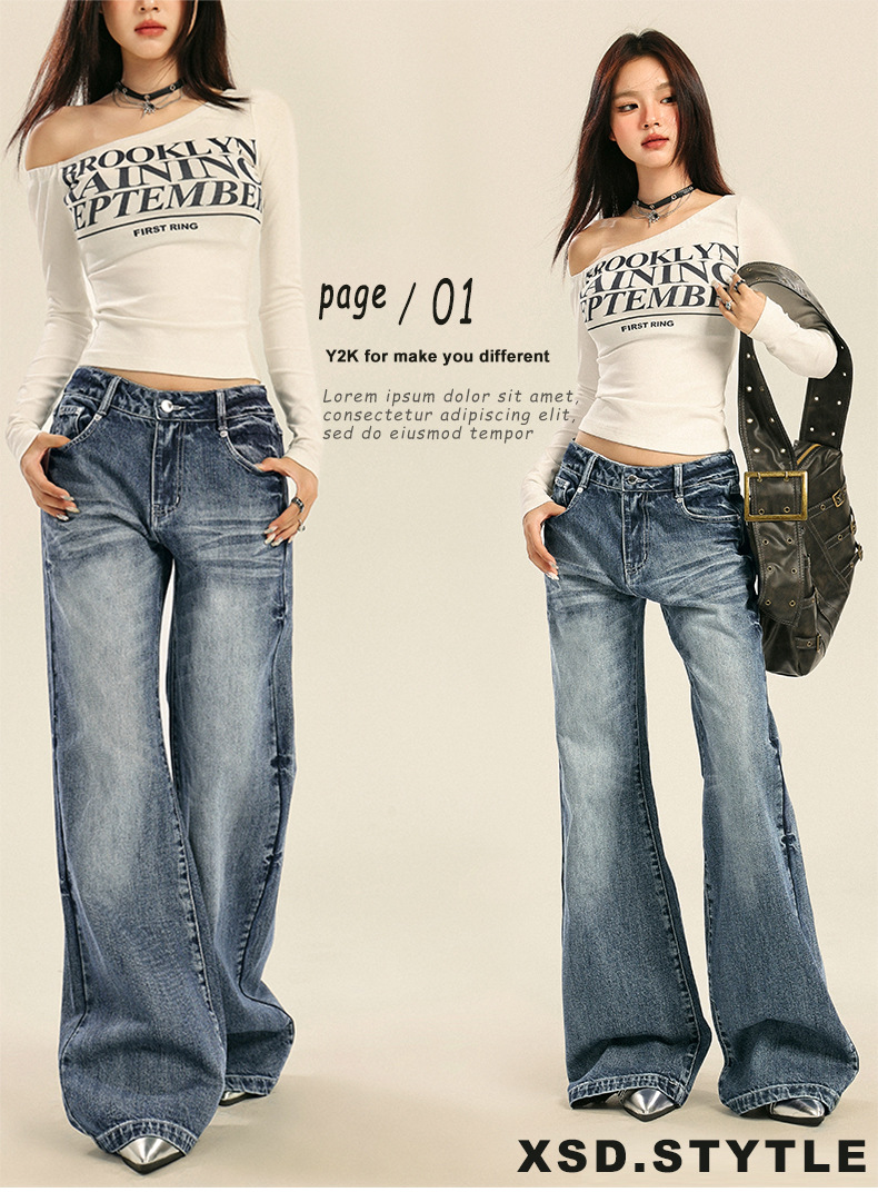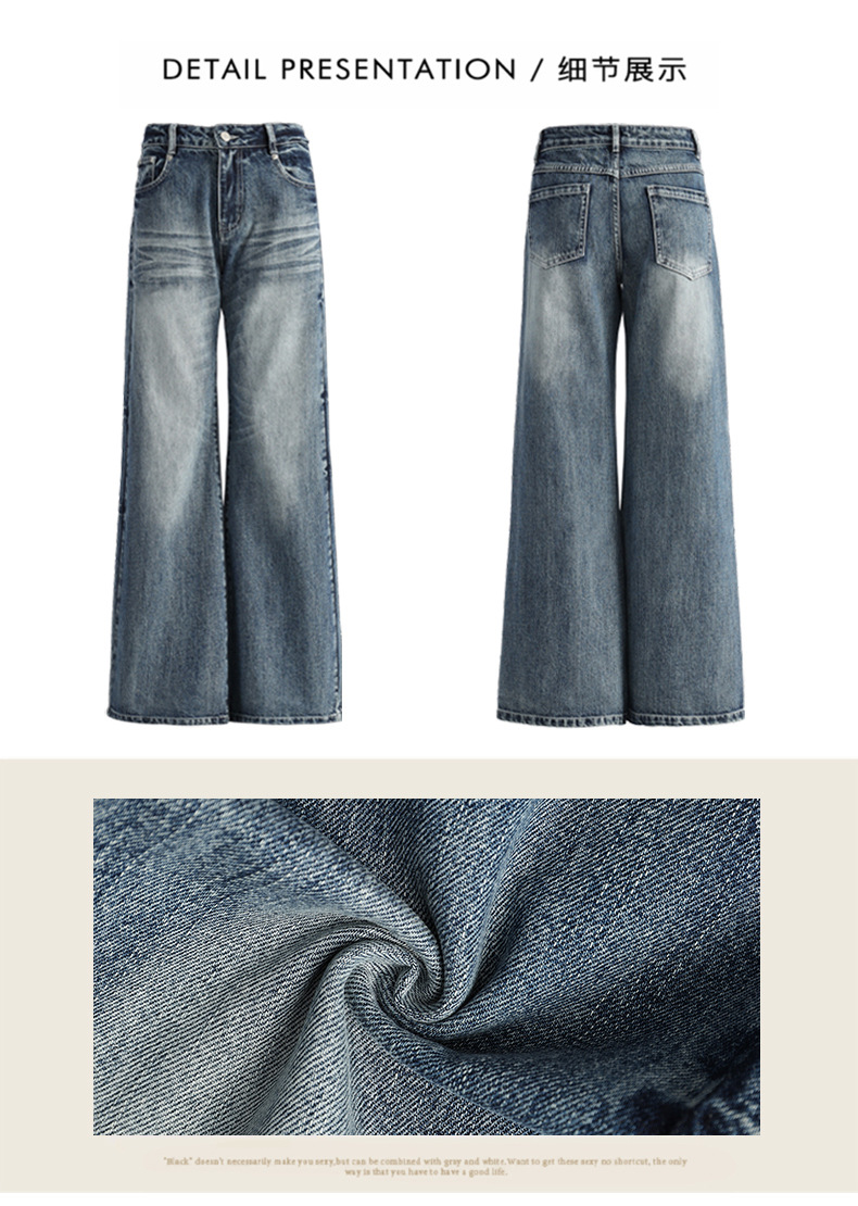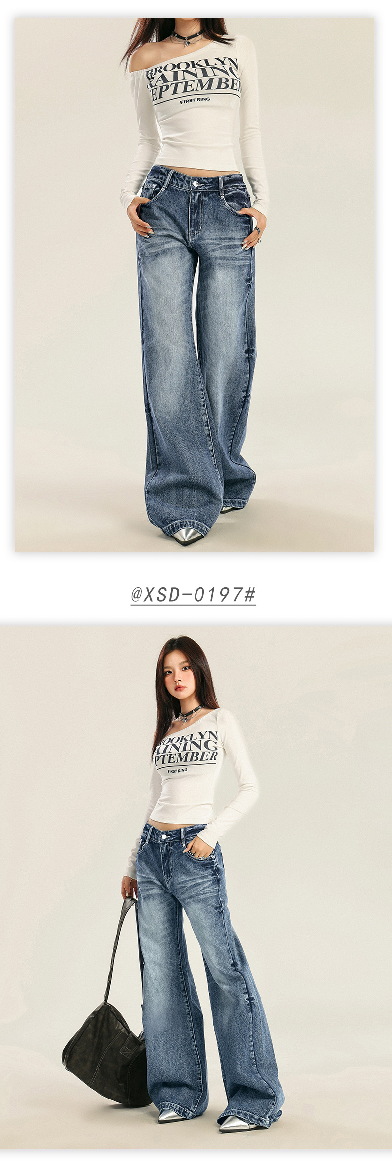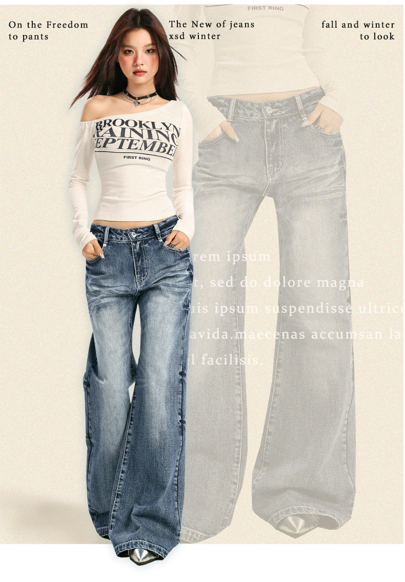 아메리칸 스타일 레트로 낮은 허리 넓은 다리 마이크로 라르 청바지 여성의 이른 가을 새 스타일 스트레이트 느슨한 다리 없음 트럼펫 바지스토어 가기
