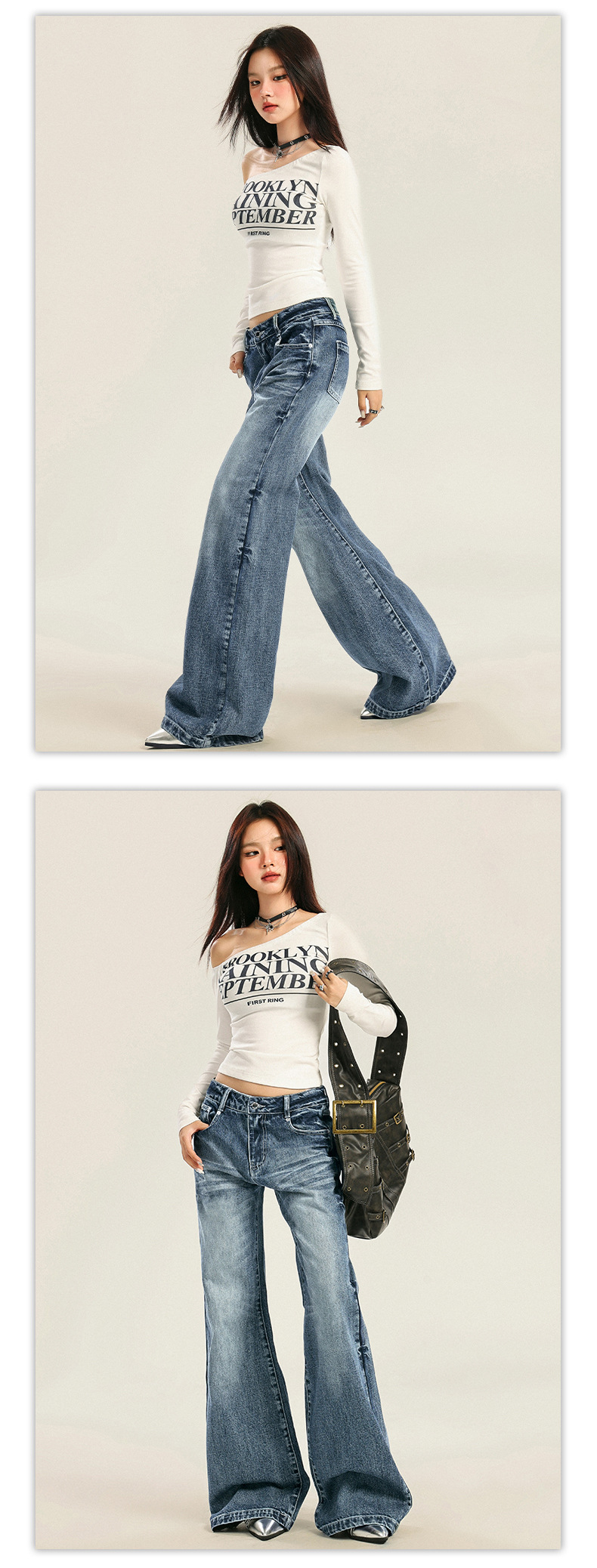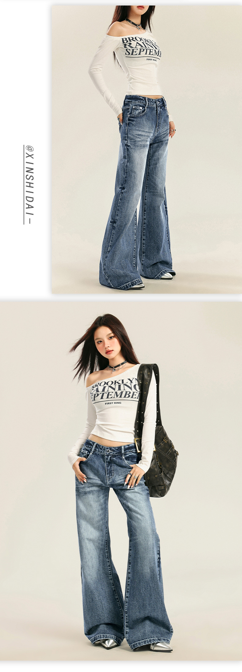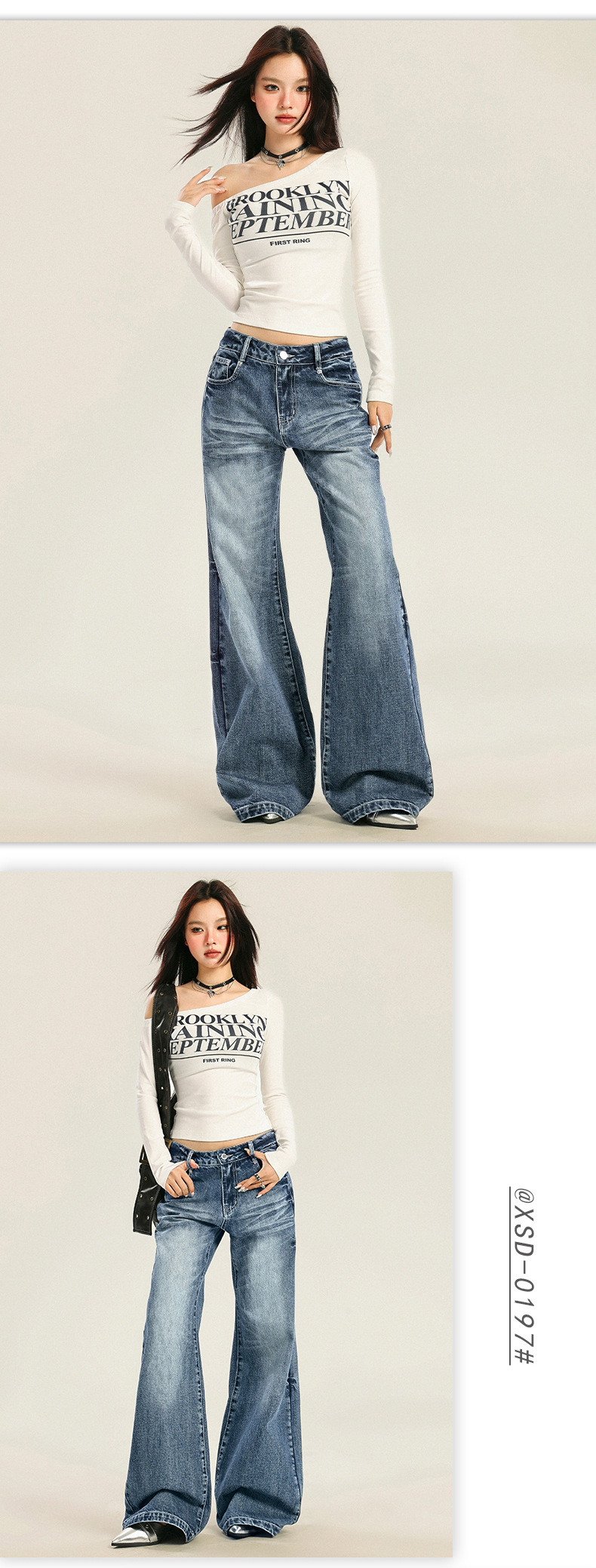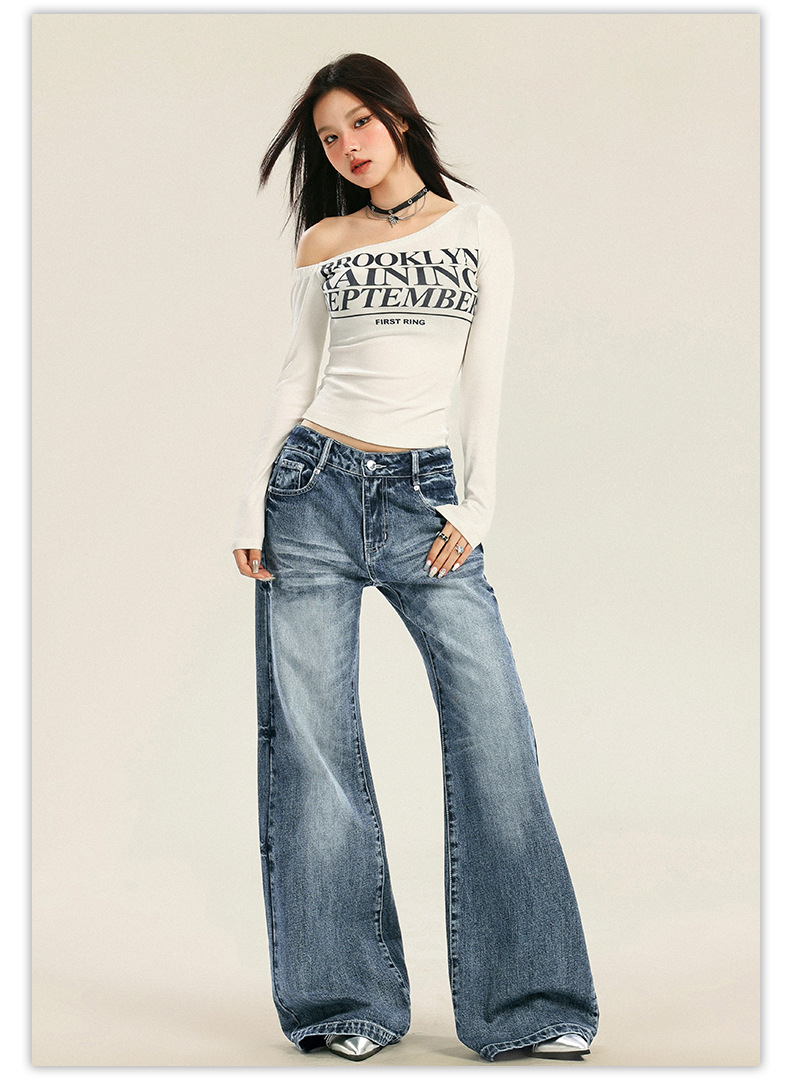 아메리칸 스타일 레트로 낮은 허리 넓은 다리 마이크로 라르 청바지 여성의 이른 가을 새 스타일 스트레이트 느슨한 다리 없음 트럼펫 바지스토어 가기