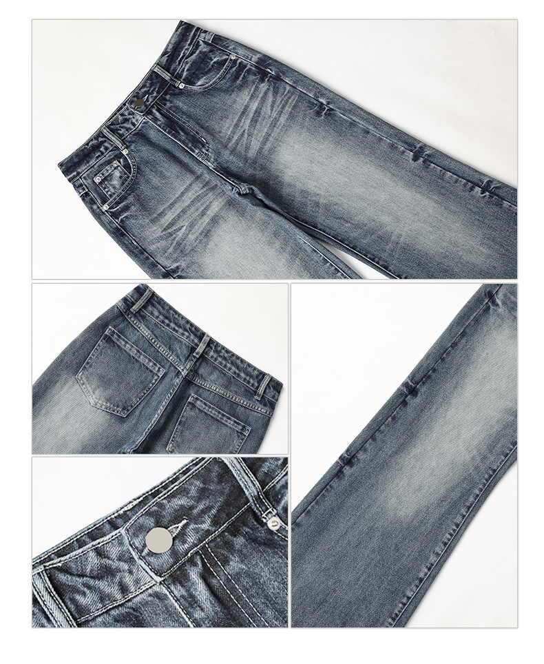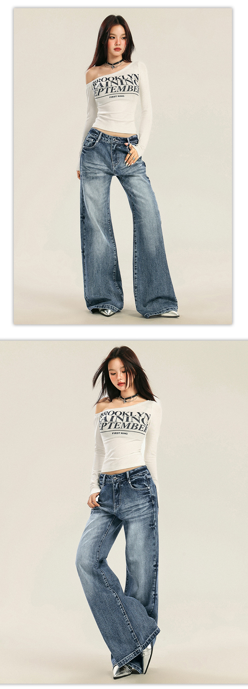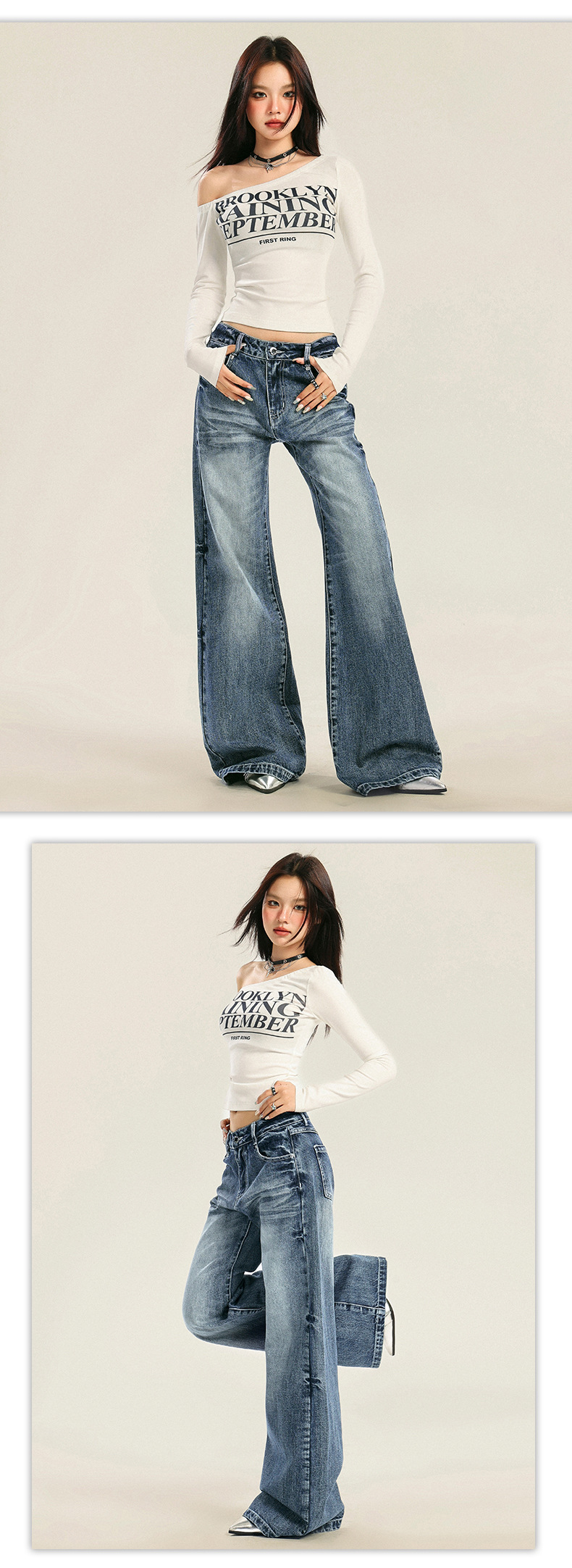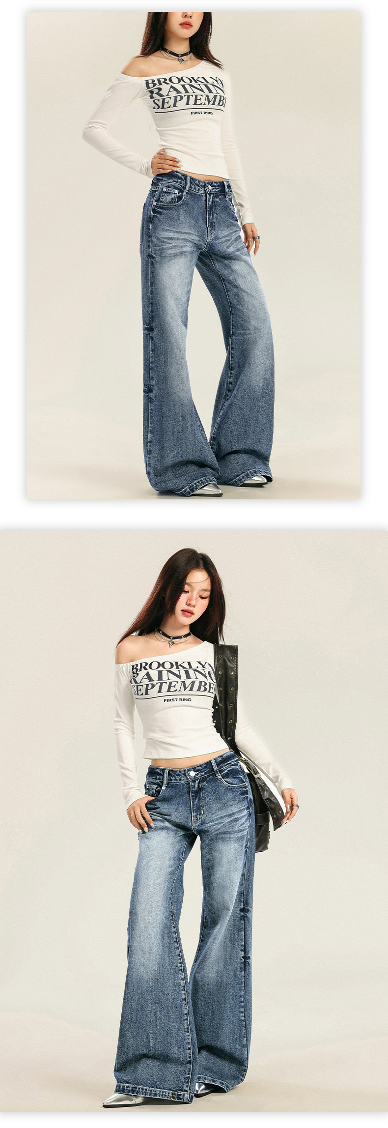 아메리칸 스타일 레트로 낮은 허리 넓은 다리 마이크로 라르 청바지 여성의 이른 가을 새 스타일 스트레이트 느슨한 다리 없음 트럼펫 바지스토어 가기