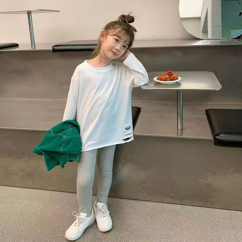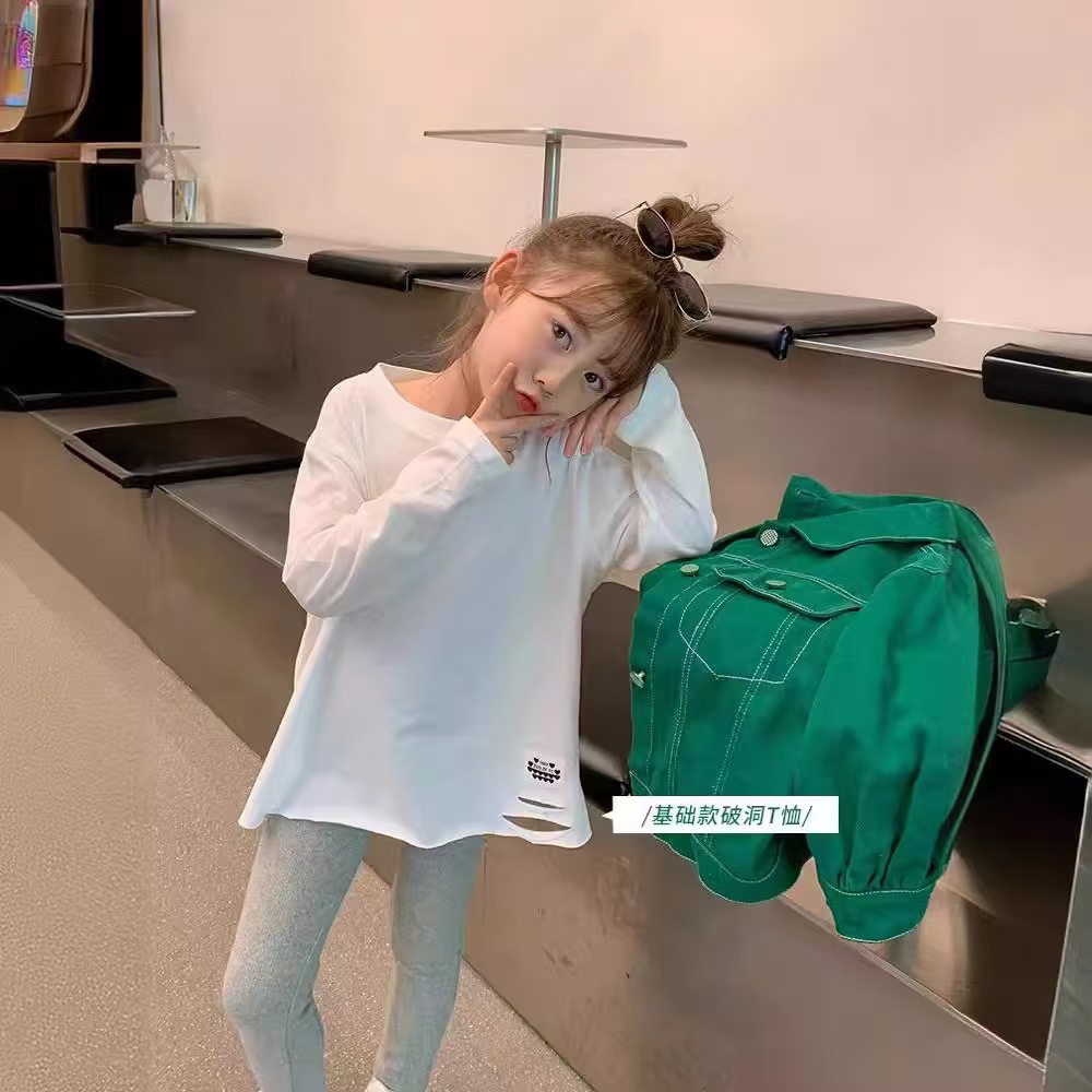 아동용 솔리드 컬러 티셔츠 2022 봄 새 스타일 탑 소녀 ins 세련된 찢어진 바닥 셔츠 다목적 트렌드스토어 가기