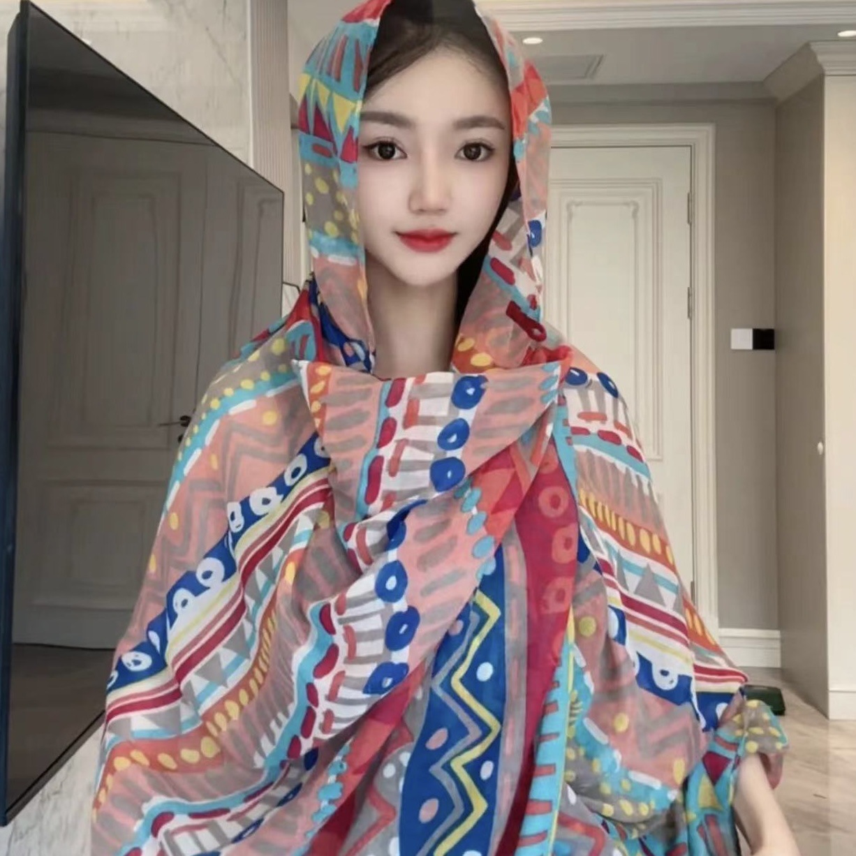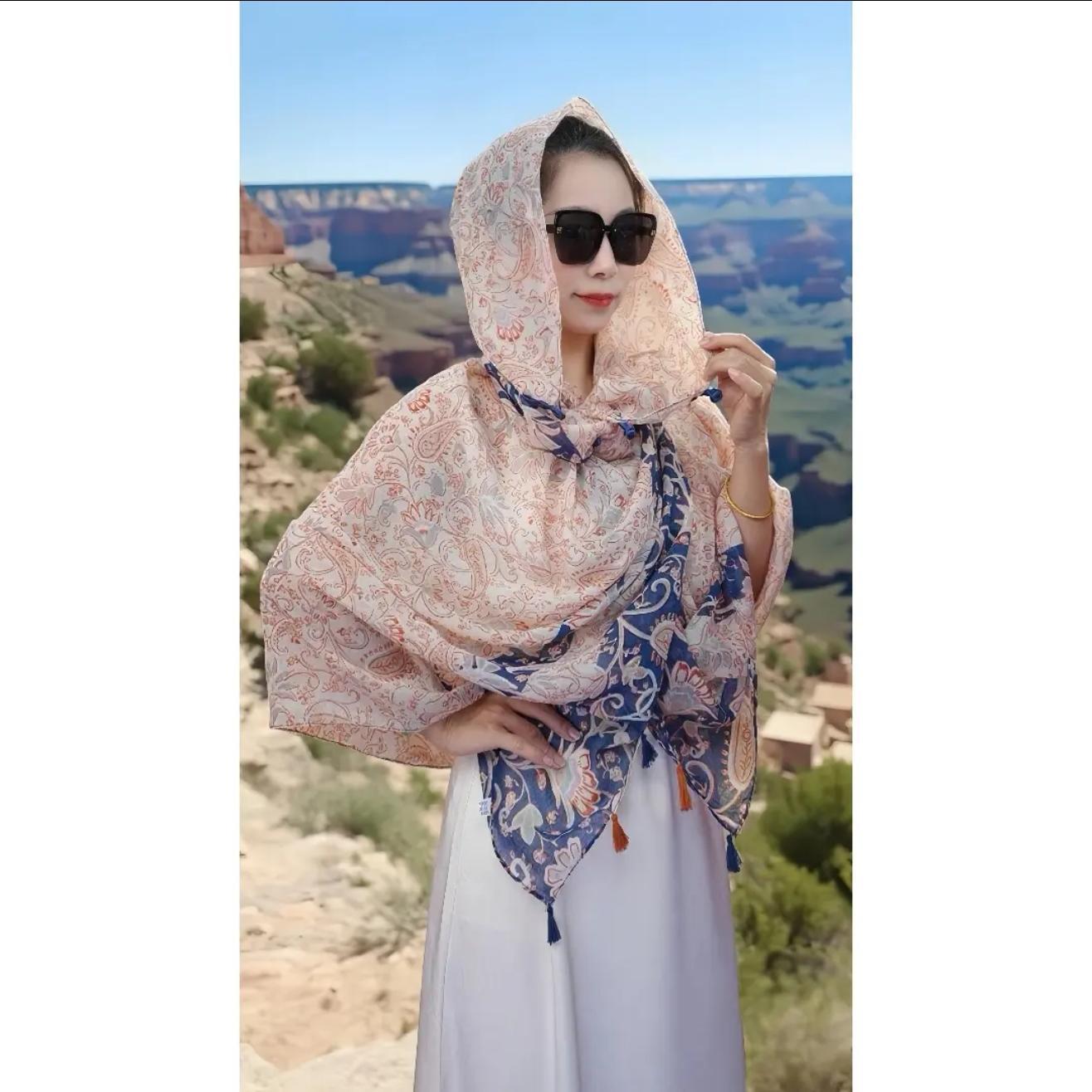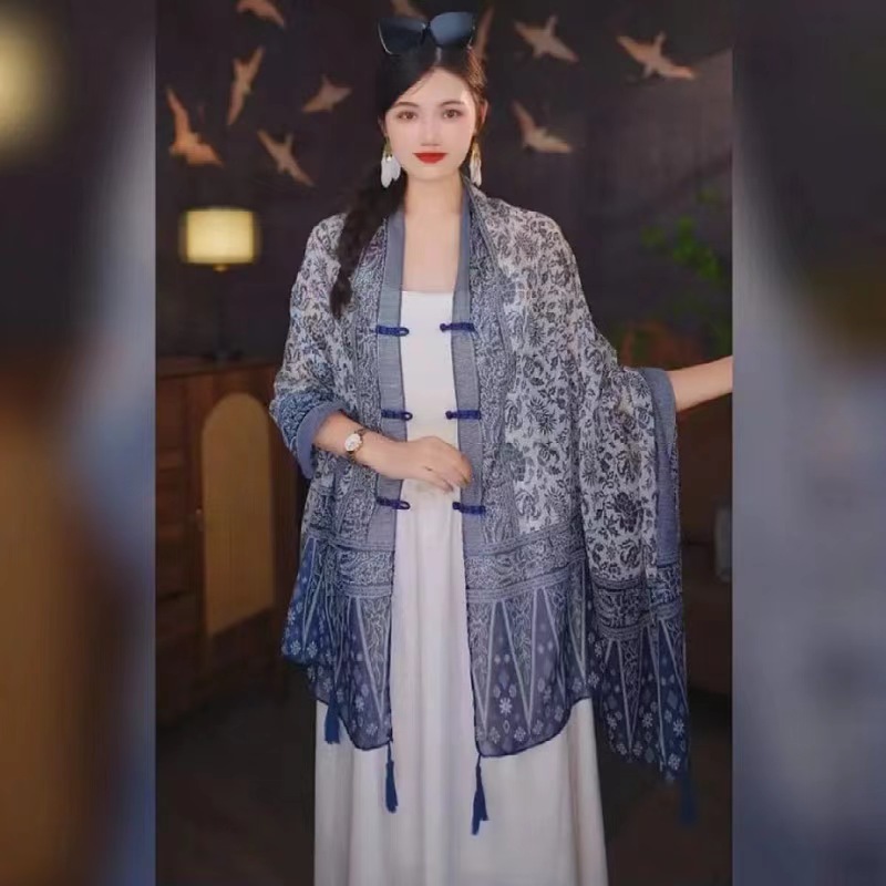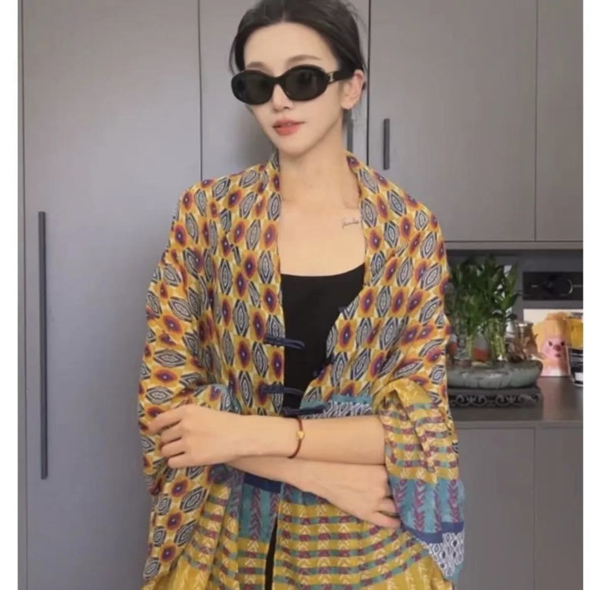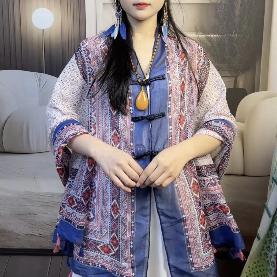 빈티지 민족 스타일 선 스크린 버클 목도리 윈난 칭하이 관광 실크 스카프를 착용 한 여름 하이 엔드 여성 중간 길이 외부
