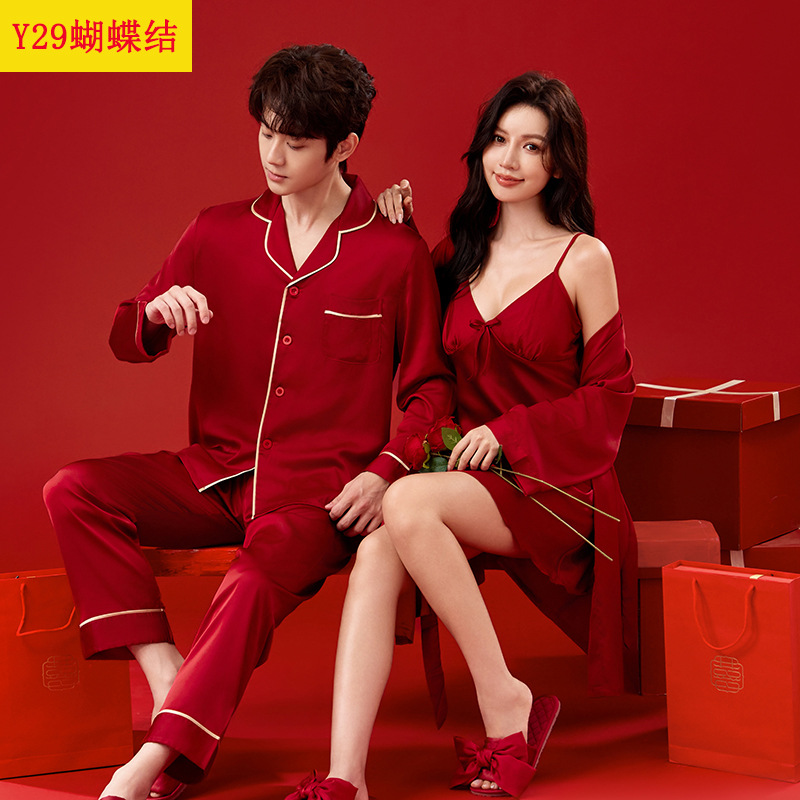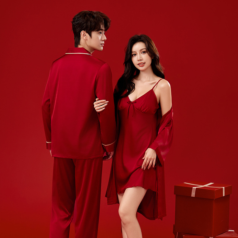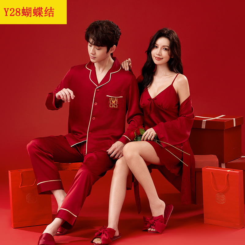 신혼 부부를위한 웨딩 잠옷 아이스 실크 붉은 봄과 가을 웨딩 실크 하이 엔드 나이트 가운 남성과 여성을위한 모닝 가운 세트