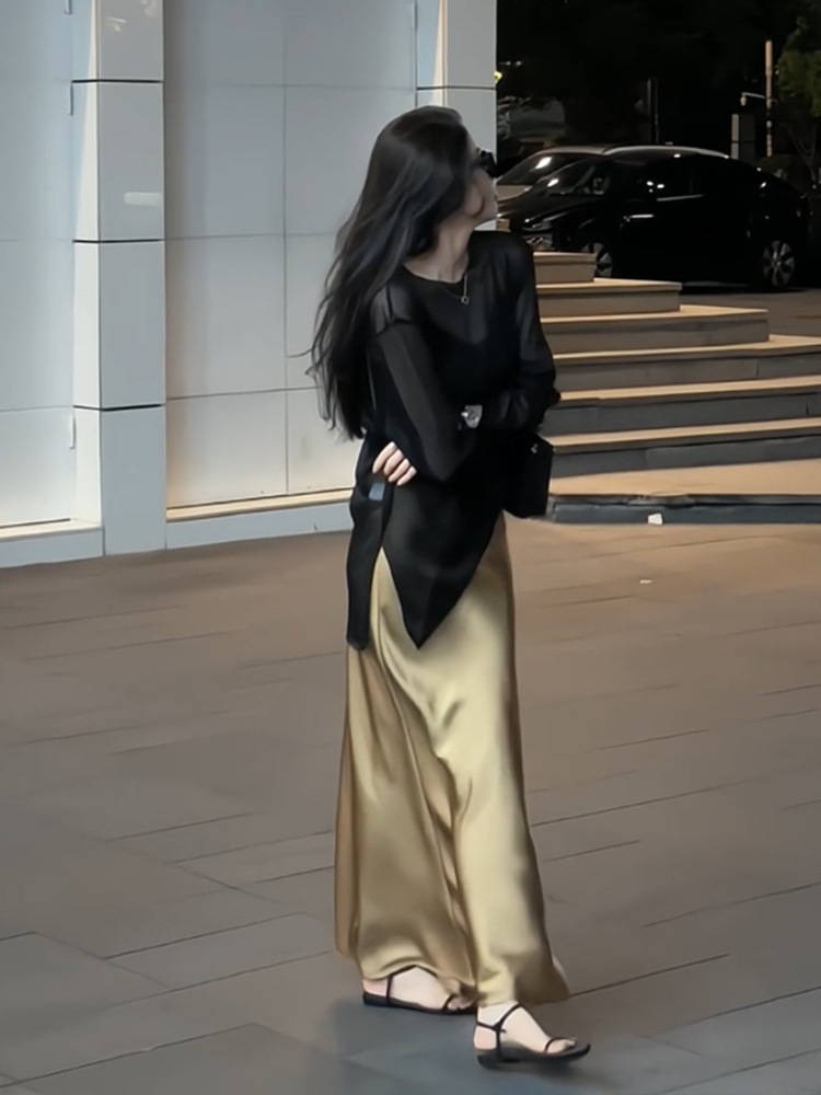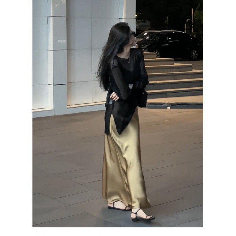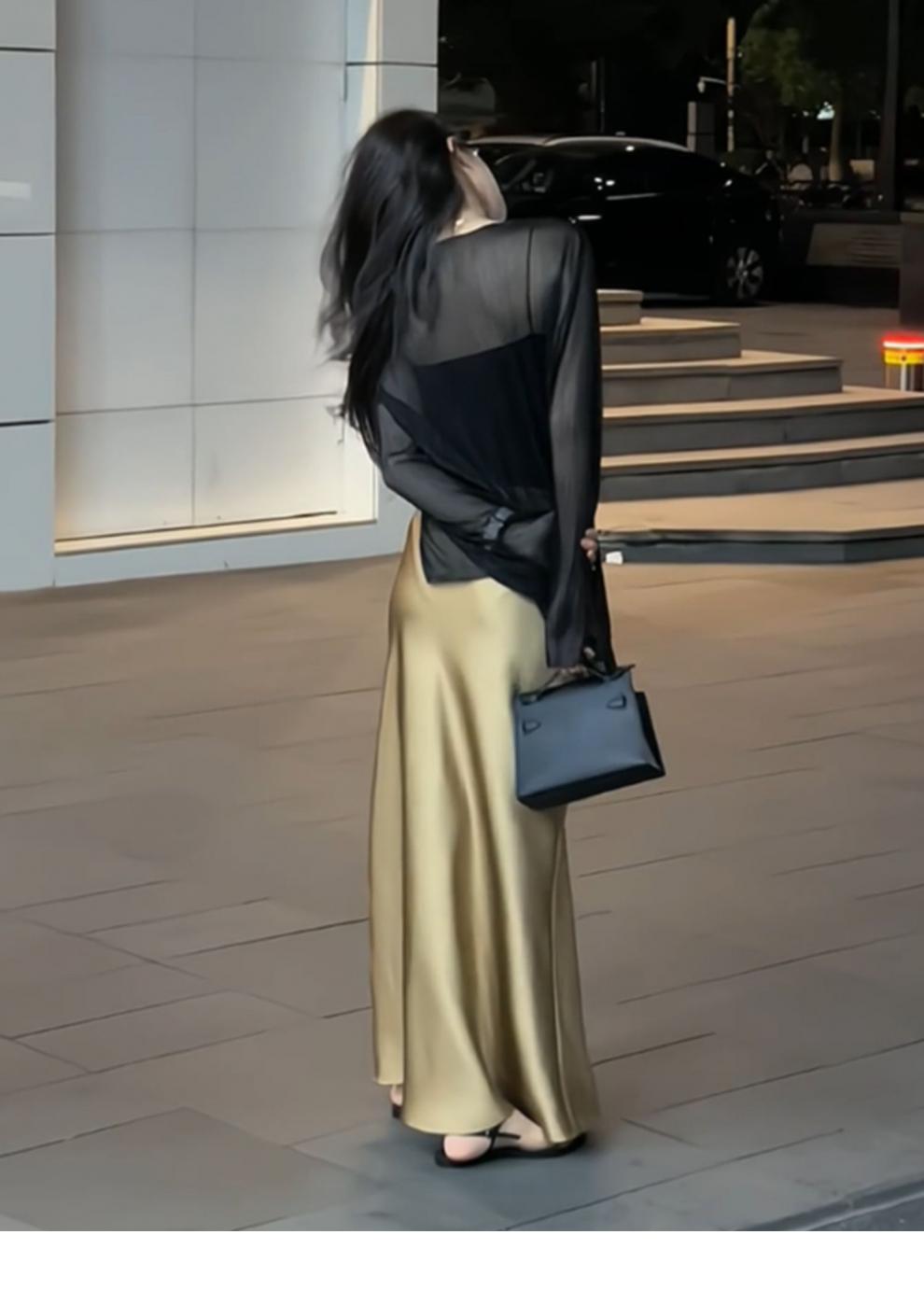 유럽 스타일 새틴 아세트산 샴페인 골드 하프 길이 스커트 하이 엔드 패션 여성을위한 우아한 아름다운 A 라인 롱 스커트스토어 가기