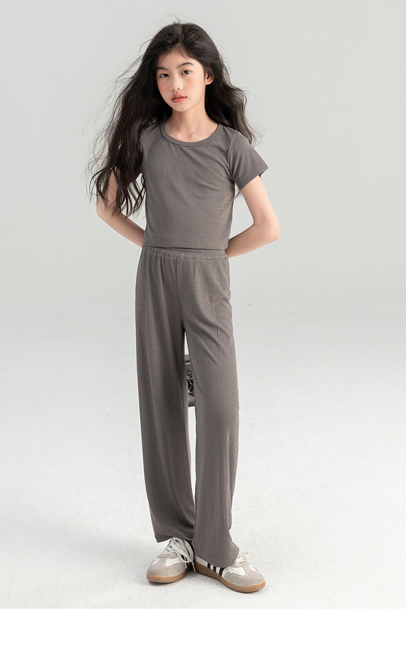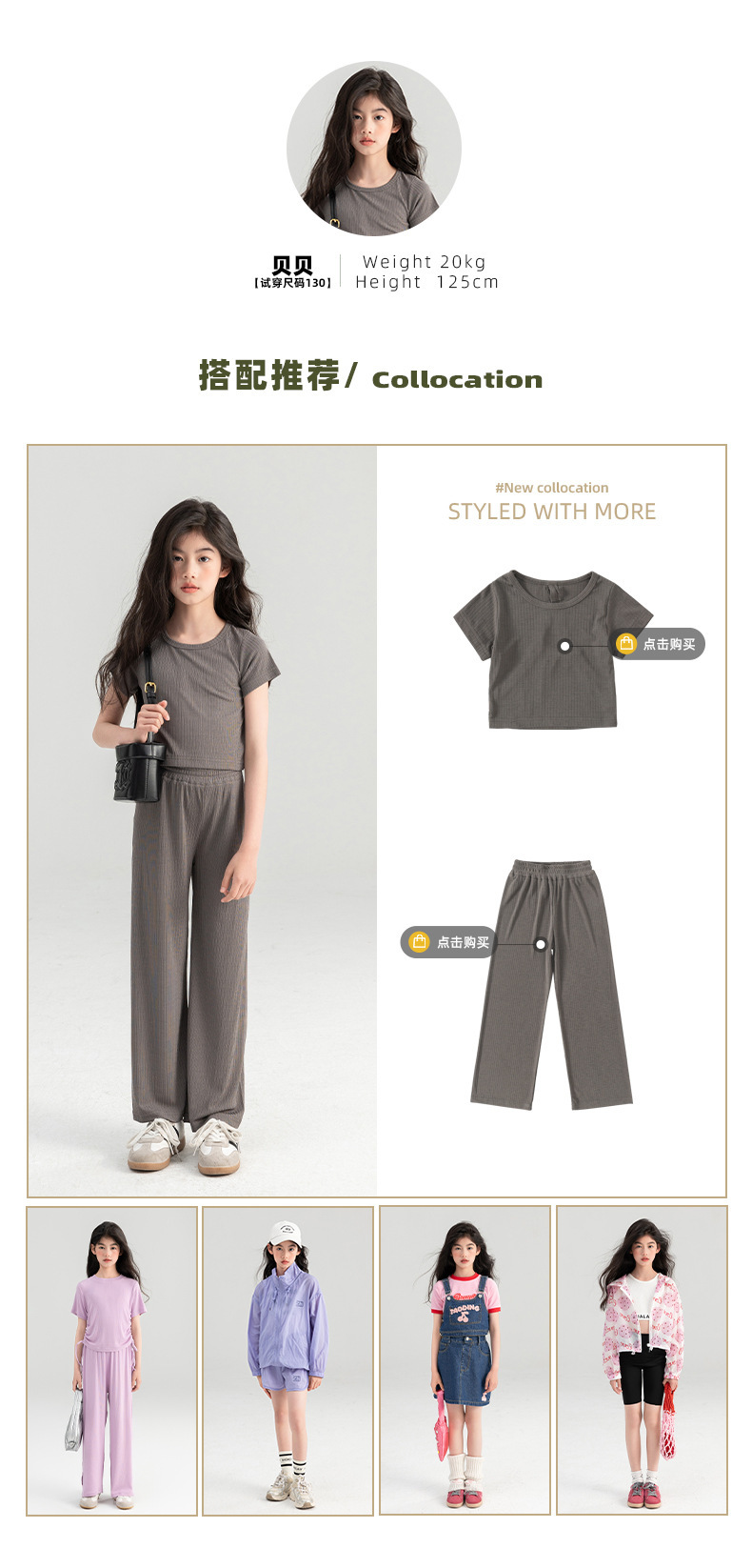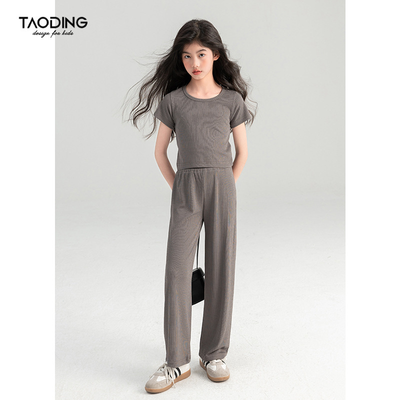 소녀 세트 아이스 실크 반팔 여름 2024 새로운 어린이 캐주얼 백리스 스타일라인 티셔츠 바지 투피스 세트스토어 가기