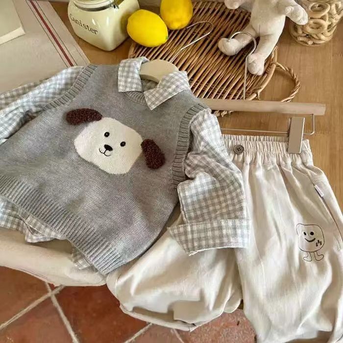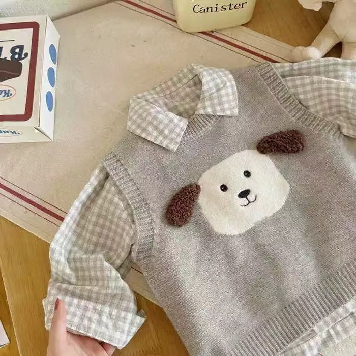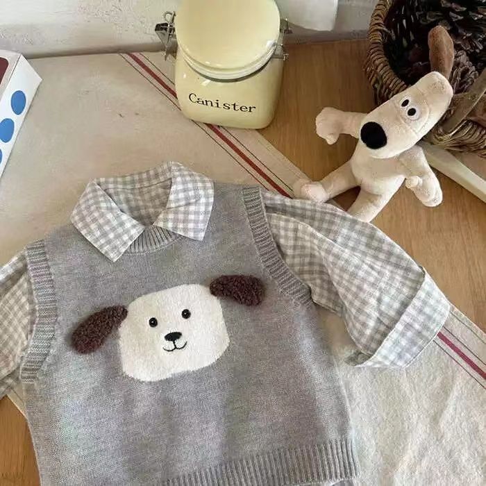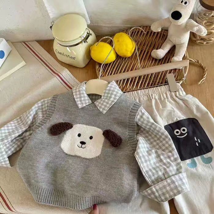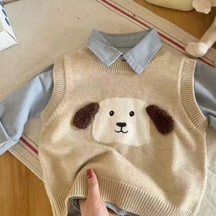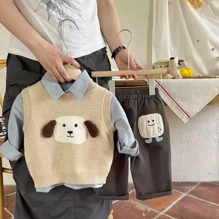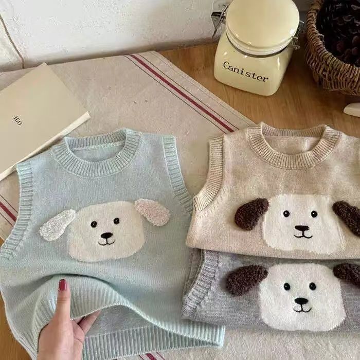 어린이 조끼 스웨터 2025 봄 가을 신상 남아용 민소매 니트웨어 강아지 아기 만화 조끼 여아용 패셔너블스토어 가기