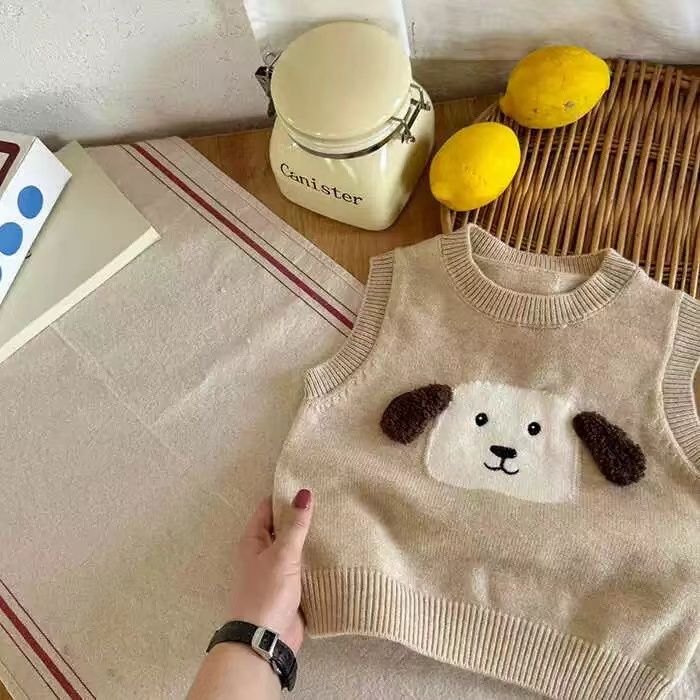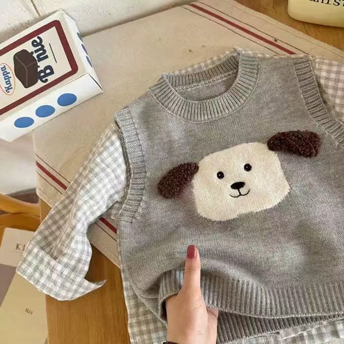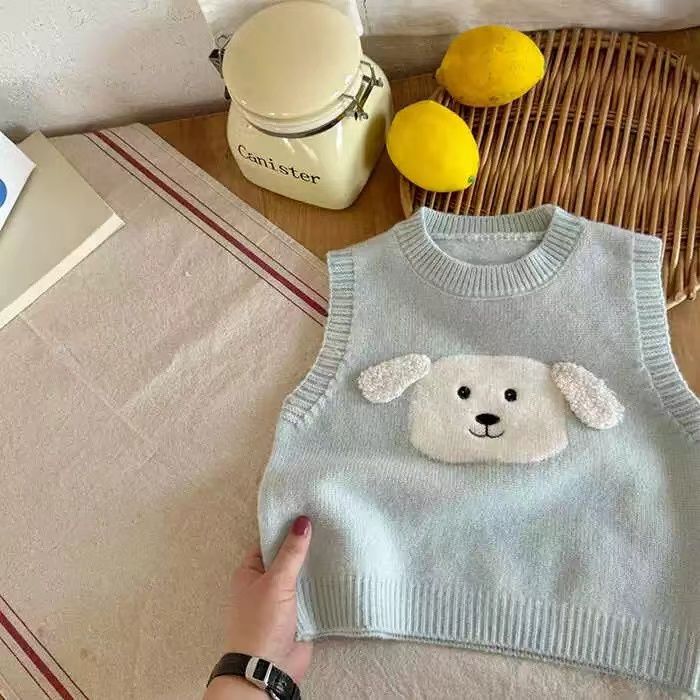 어린이 조끼 스웨터 2025 봄 가을 신상 남아용 민소매 니트웨어 강아지 아기 만화 조끼 여아용 패셔너블