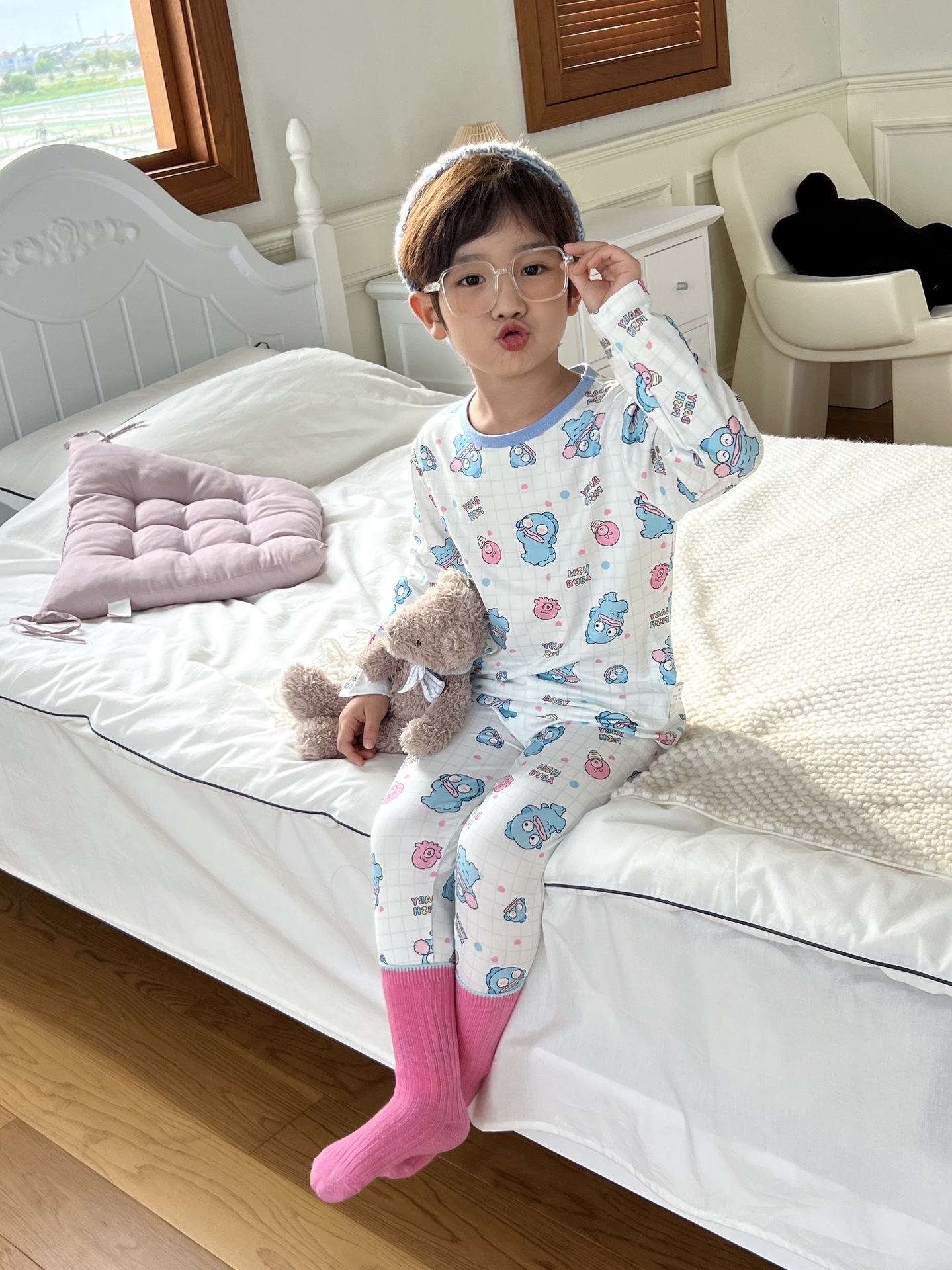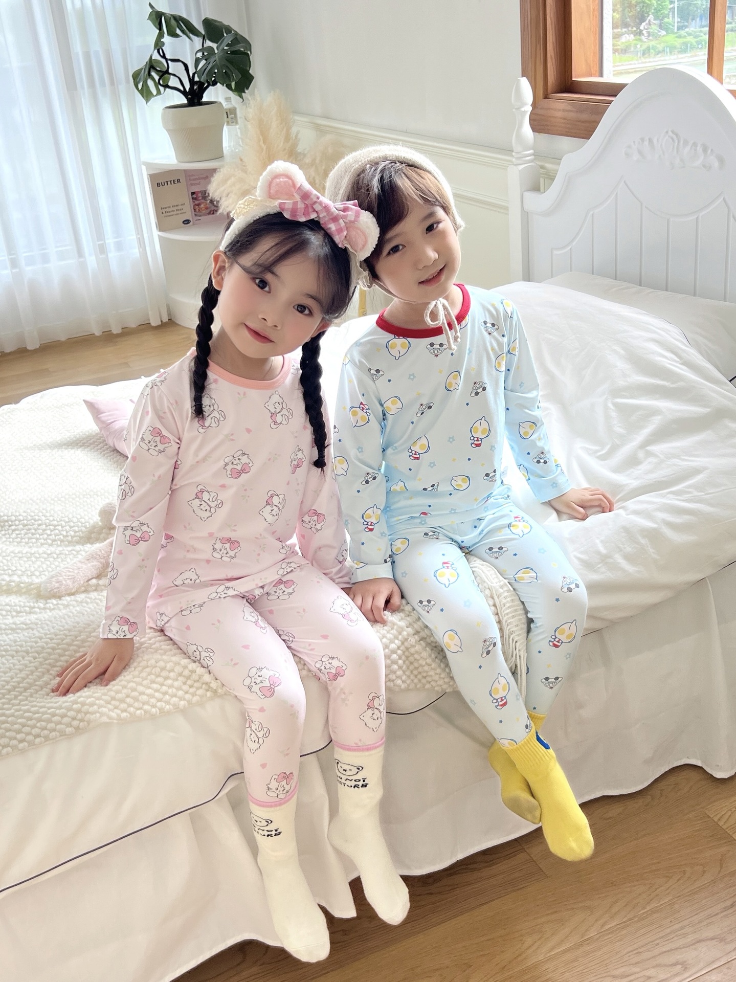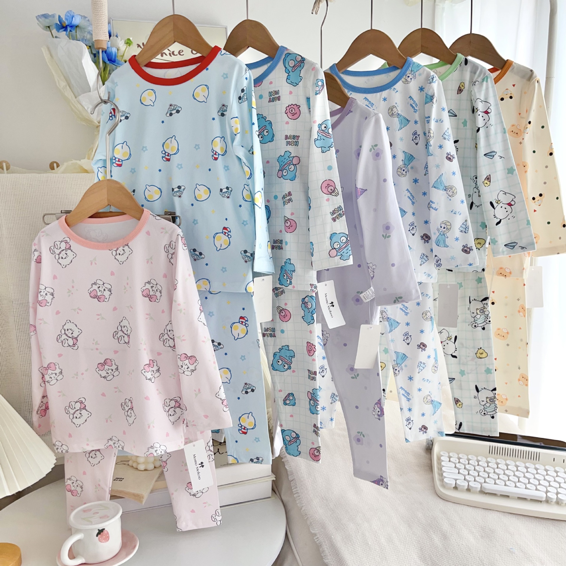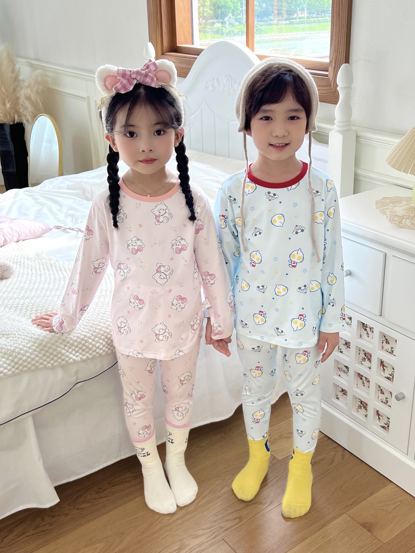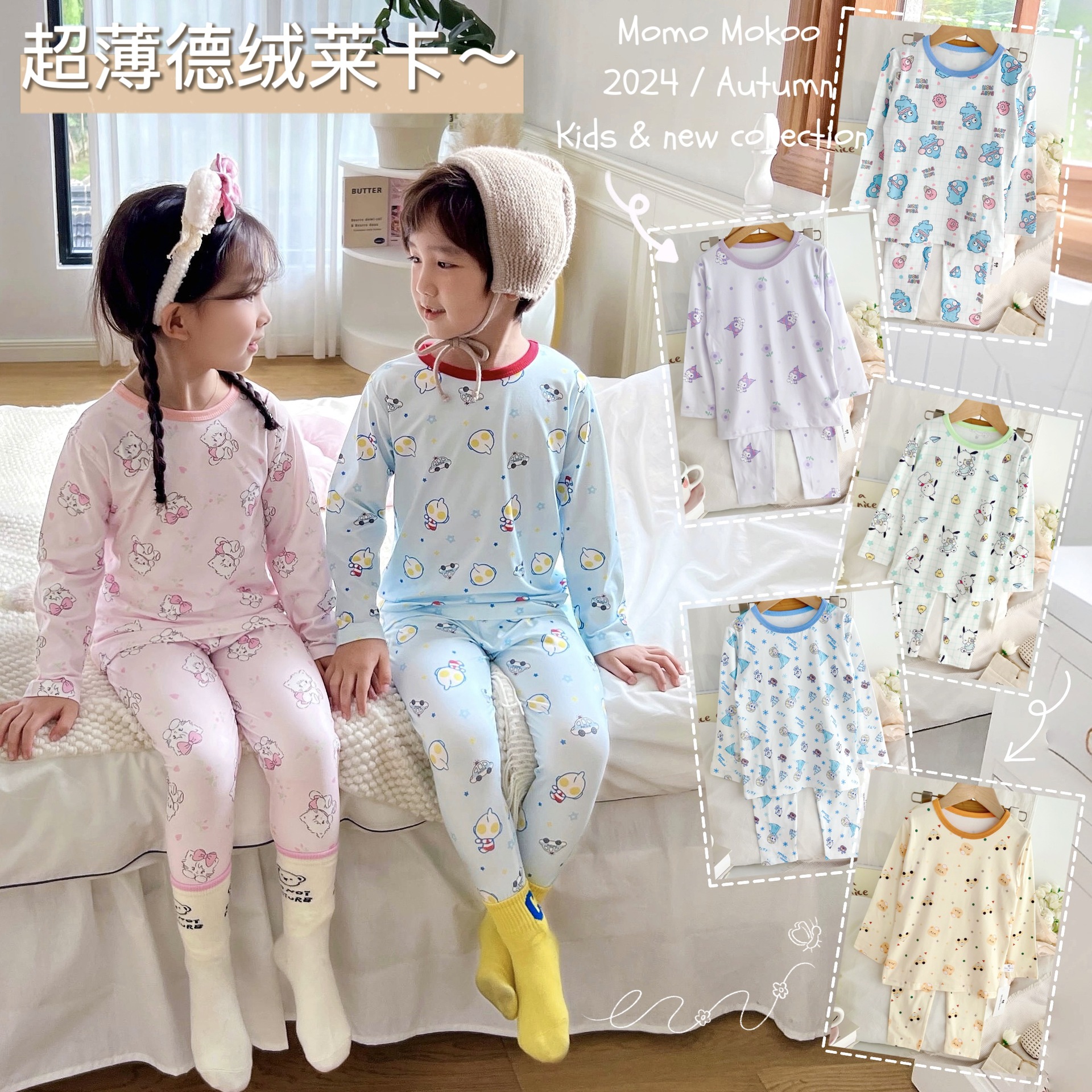 24 가을 남성과 여성을위한 새로운 어린이 잠옷 어린이 벨벳 라이크라 홈 의류 세트 전체 인쇄 만화 얇은 긴 소매 달콤한스토어 가기