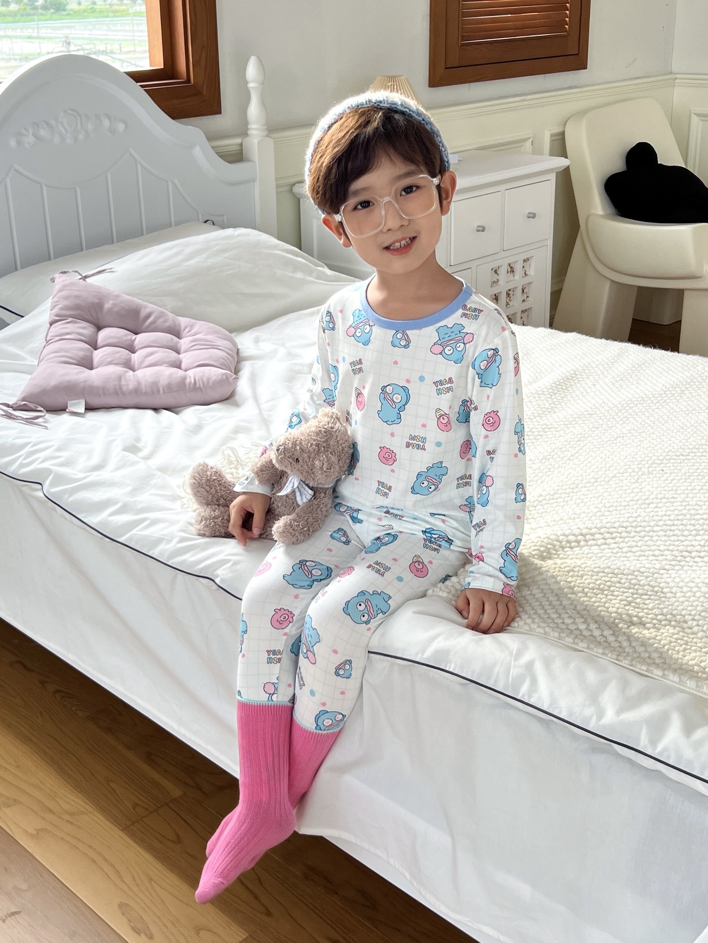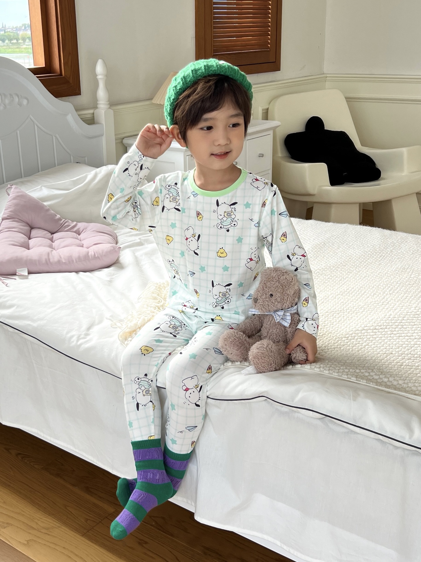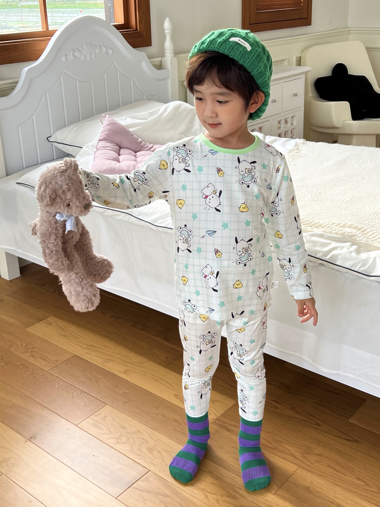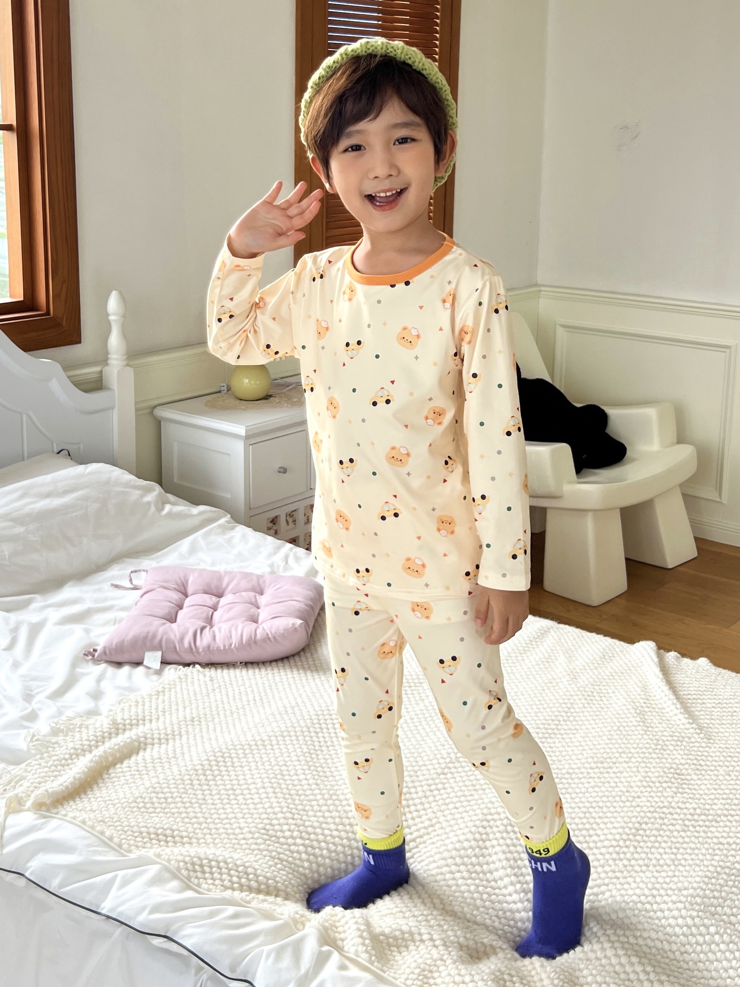 24 가을 남성과 여성을위한 새로운 어린이 잠옷 어린이 벨벳 라이크라 홈 의류 세트 전체 인쇄 만화 얇은 긴 소매 달콤한스토어 가기