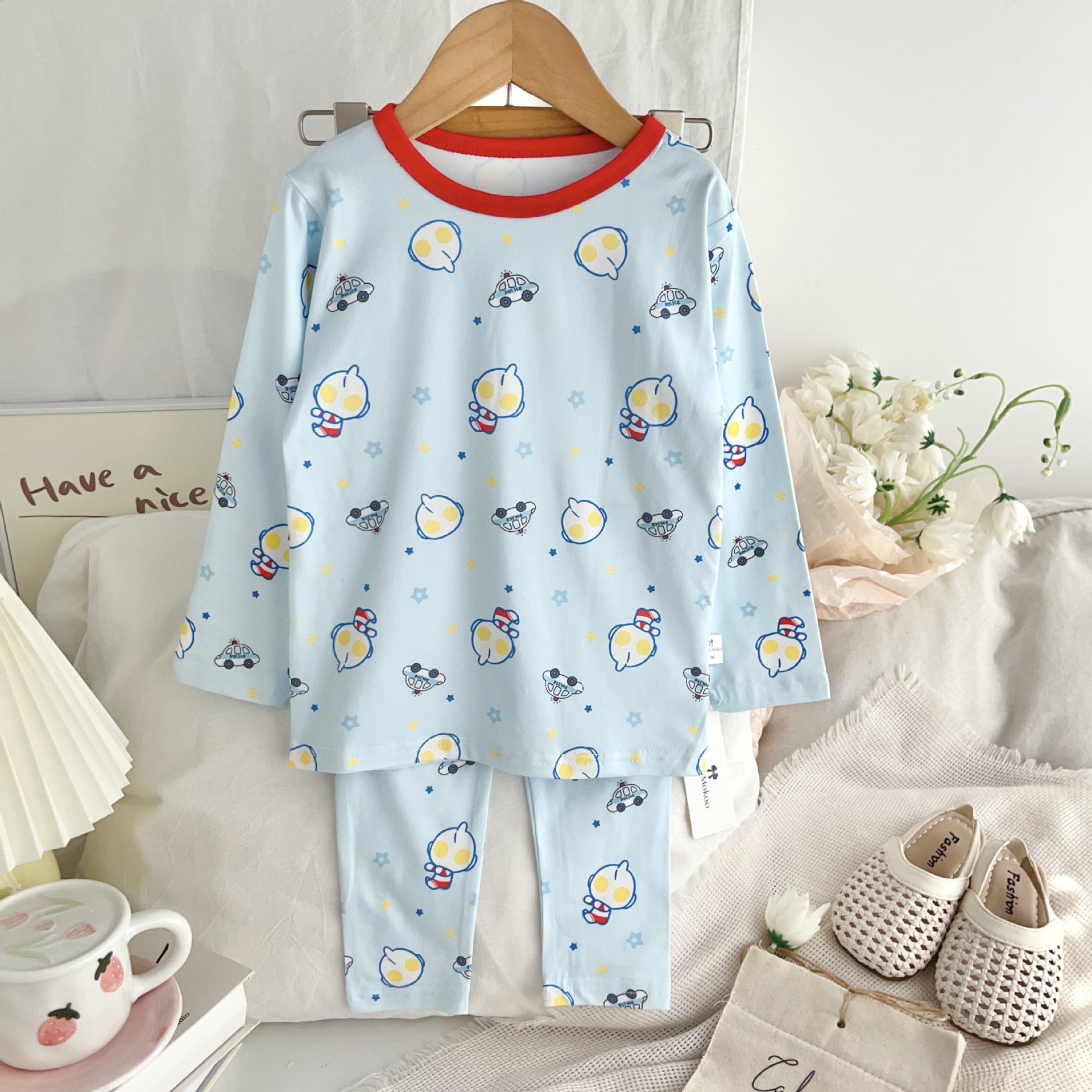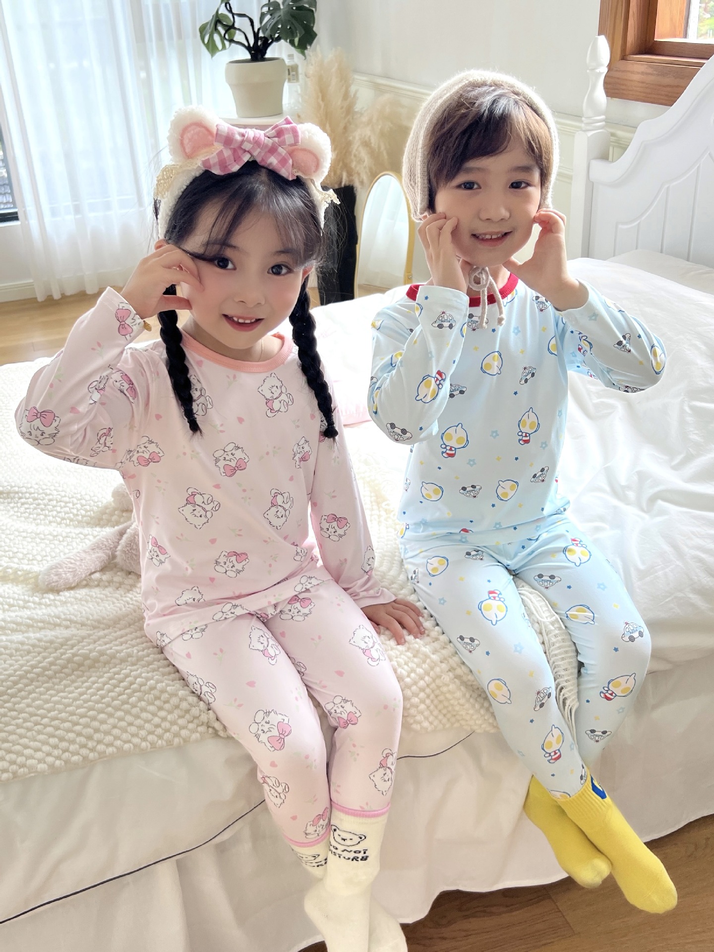 24 가을 남성과 여성을위한 새로운 어린이 잠옷 어린이 벨벳 라이크라 홈 의류 세트 전체 인쇄 만화 얇은 긴 소매 달콤한
