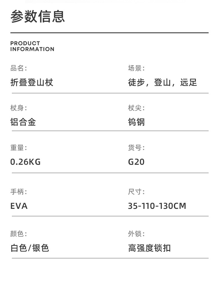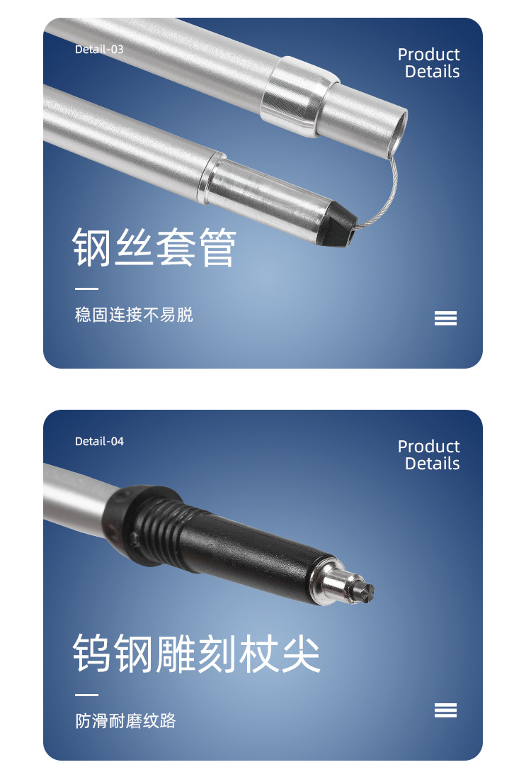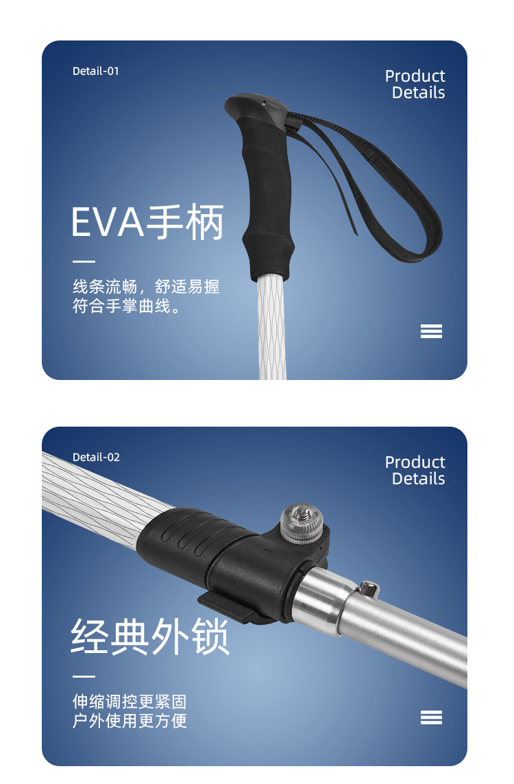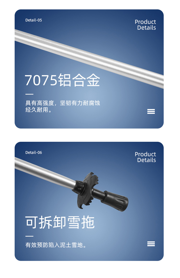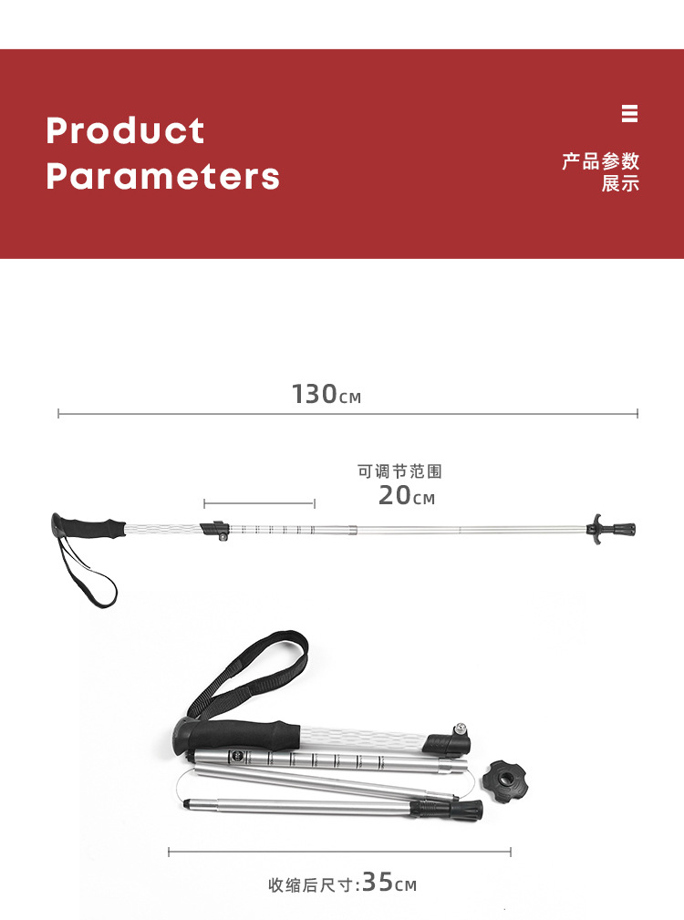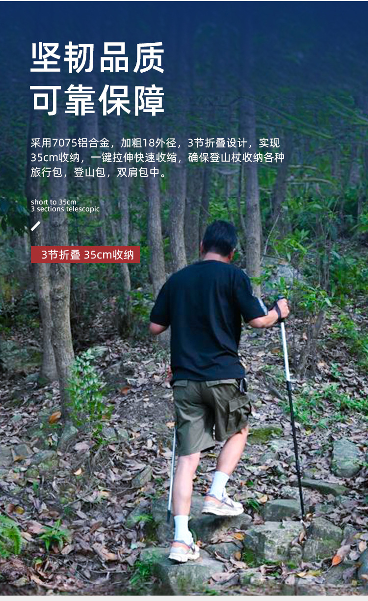 2. 登山杖操作规范:使用前检查杖身伸缩节、锁扣是否牢固,避免因部件松动导致登山杖断裂、滑落;调节长度时需确认锁扣完全锁紧,防止使用中突然缩短失衡。