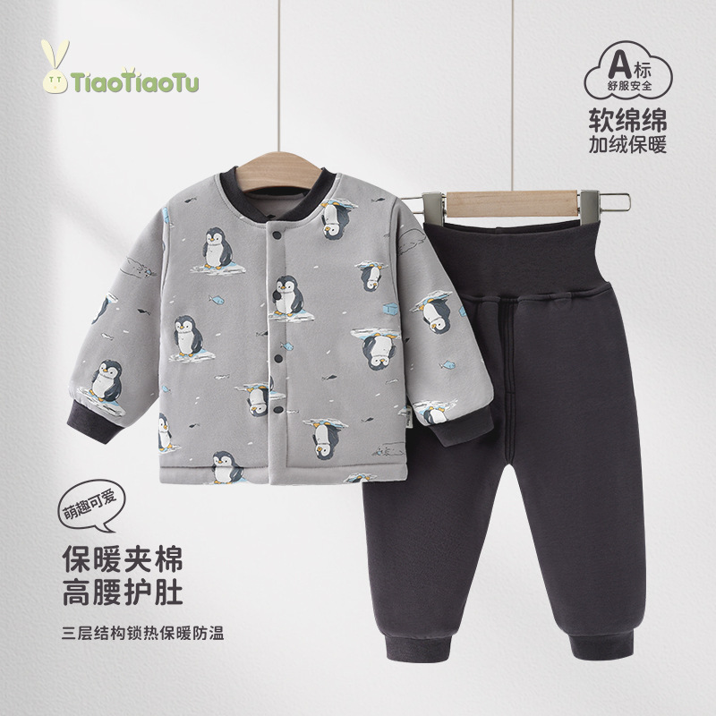 유아용 순면 무봉제 A급 120g 누빔 아기 속옷 세트 하이웨이스트 배 보호 가을옷 가을바지 투피스 세트
