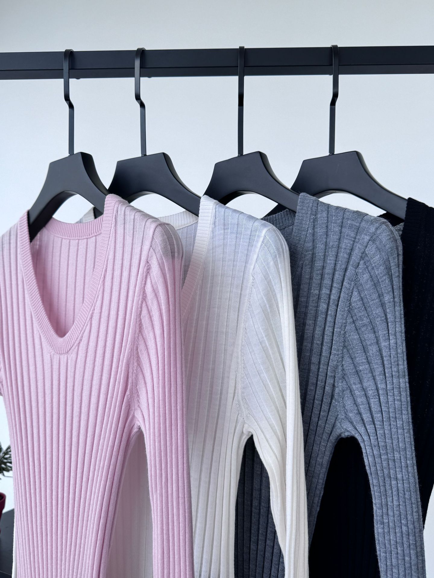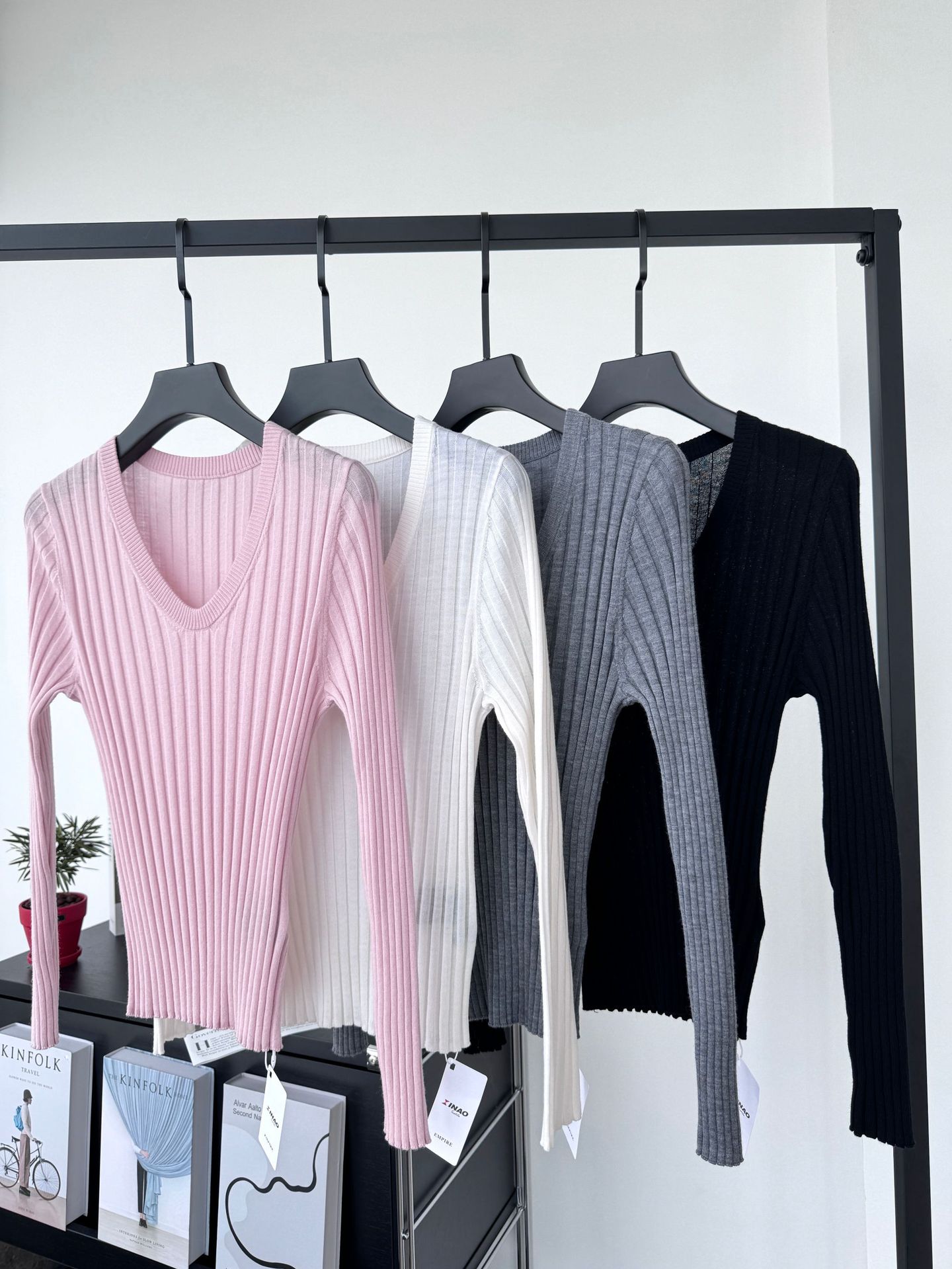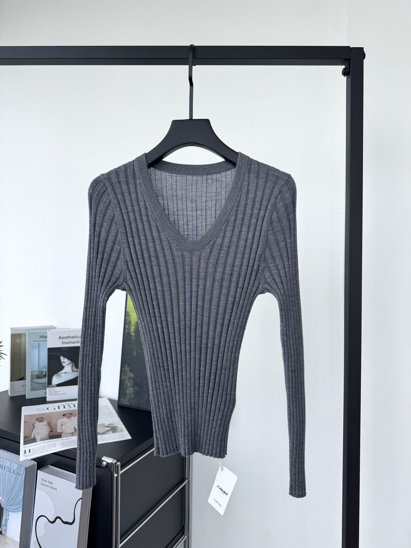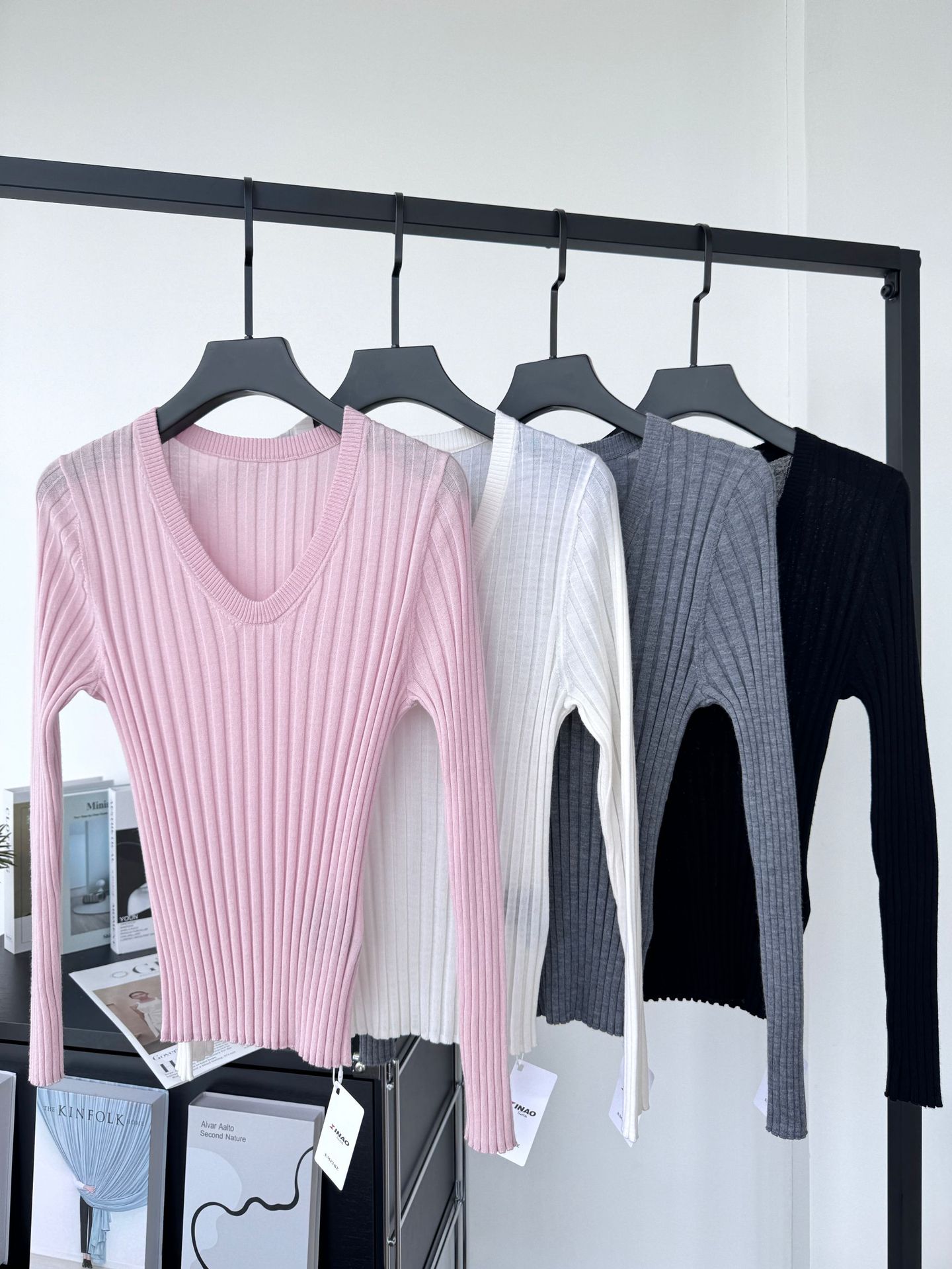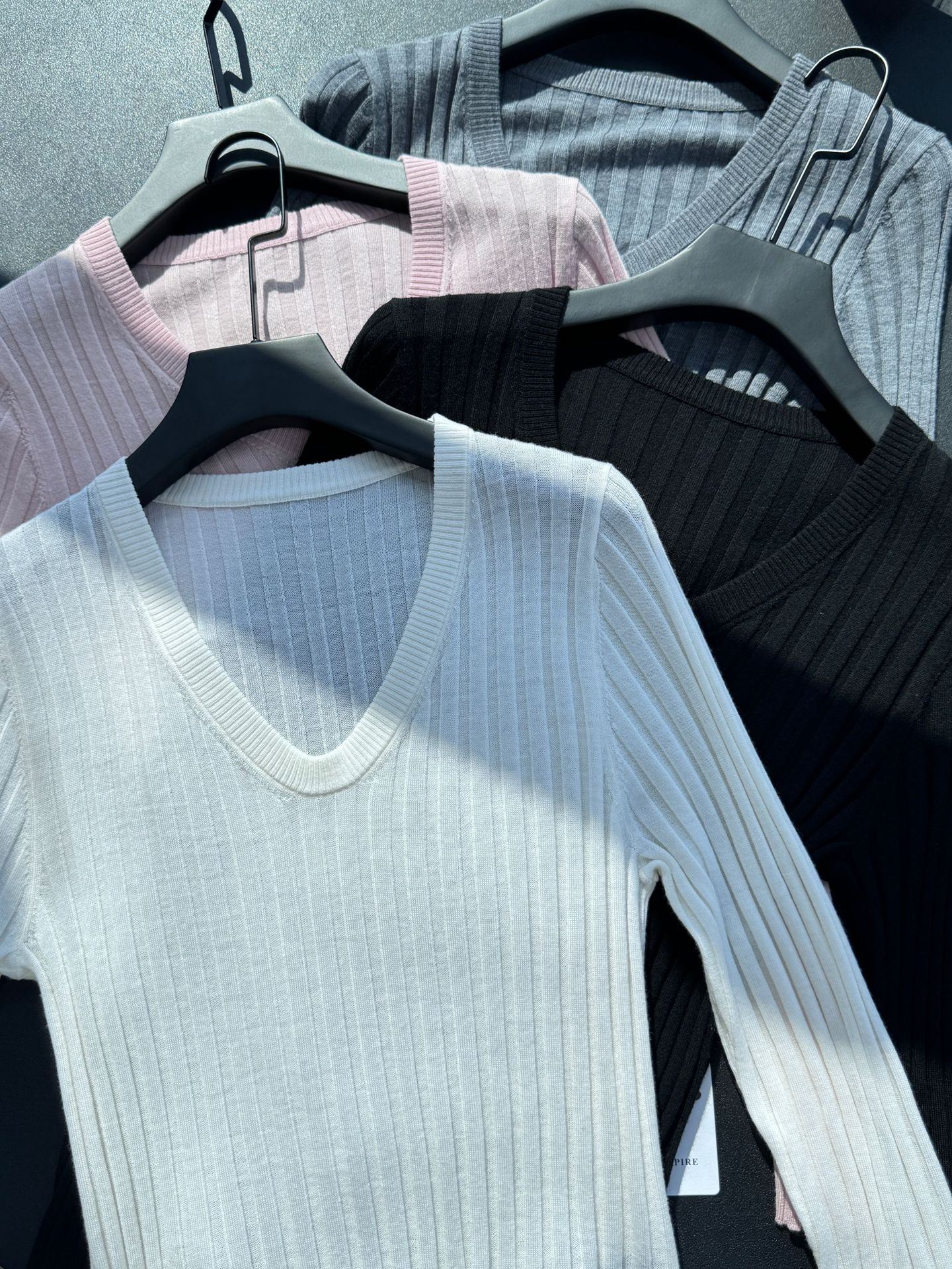 24 이른 가을 새로운 여성 스웨터 풀 오버 V-넥 긴 소매 슬림 핏 핏 스트립 탄성 울 얇은베이스 스웨터