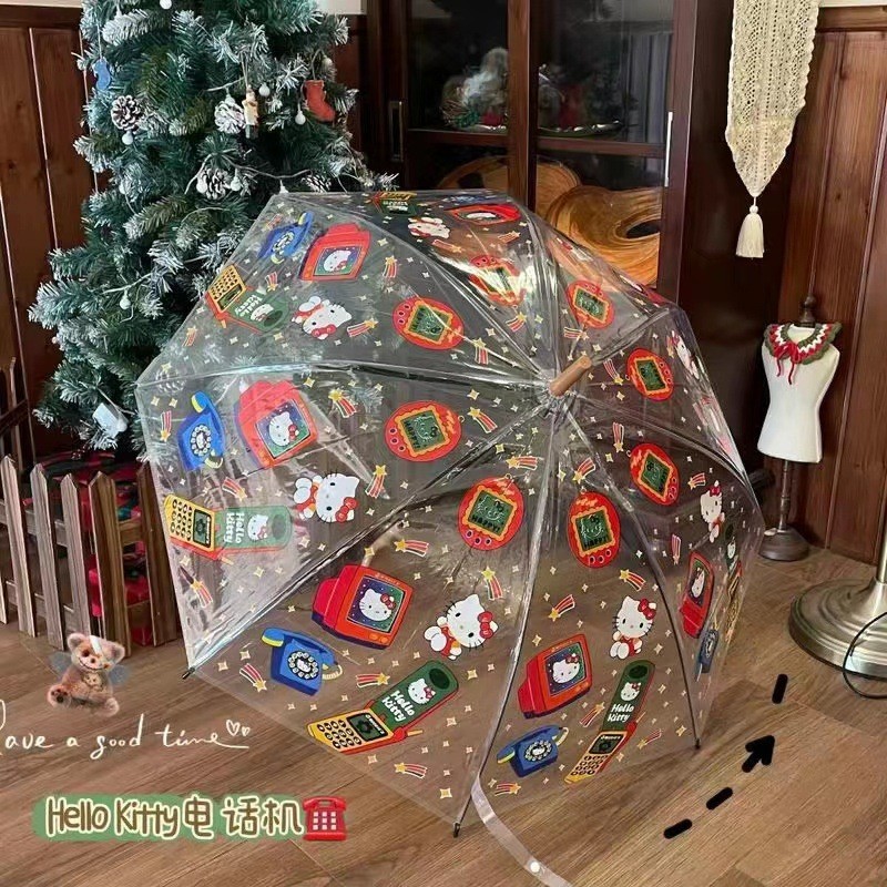 • 긴 손잡이 KT 고양이 핑크색 가장자리 투명 우산